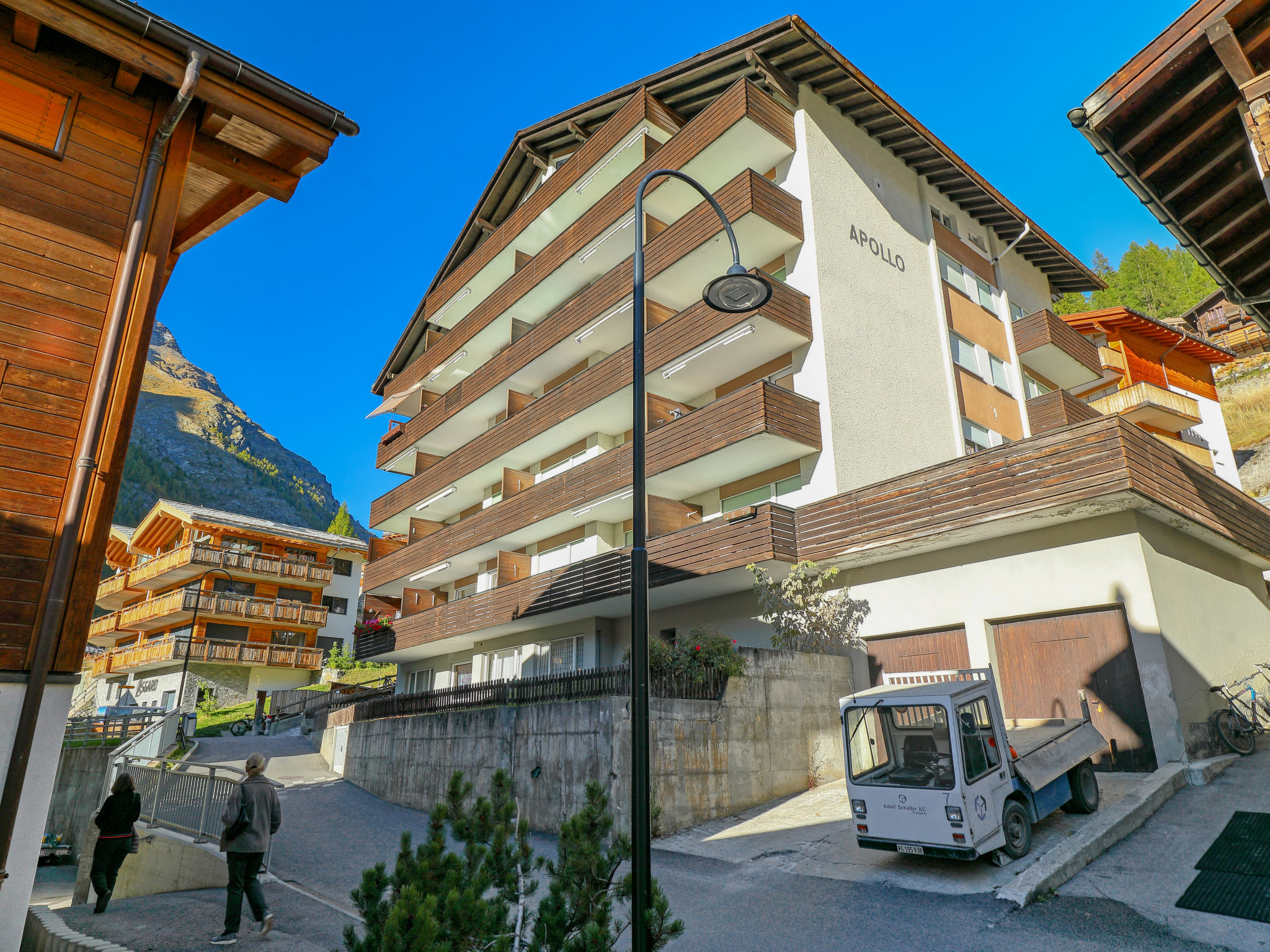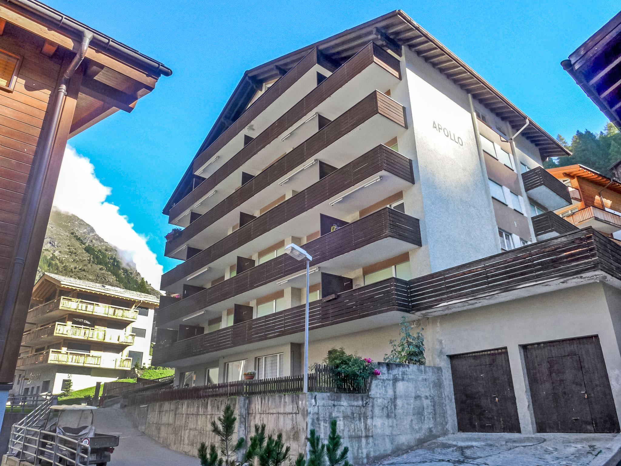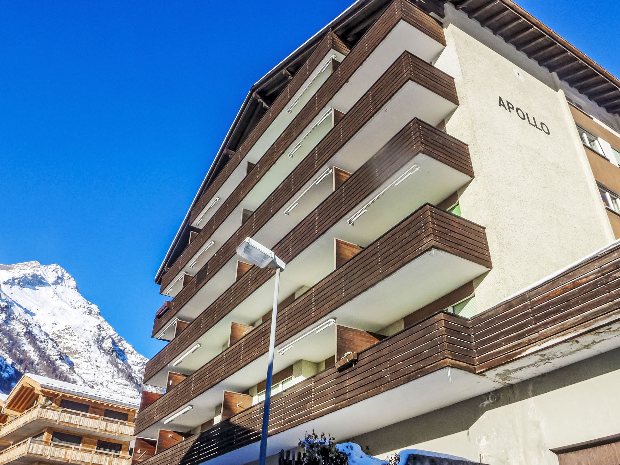 Grosses Mehrfamilienhaus "Apollo", auf 7 Stockwerken. Im Ortsteil Wiesti, 700 m vom Zentrum, ruhige Lage. Im Hause: Fahrstuhl, Skiraum, Zentralheizung. Supermarkt 600 m, Restaurant 150 m, Bäckerei 600 m, Fahrradverleih 650 m, Zentrum zu Fuss in 10 Minuten erreichbar, Bushaltestelle "Wiestibrücke" 350 m, Bahnstation "Bahnhof Zermatt" 700 m. Bergbahn, Skiverleih 550 m, Skibushaltestelle 350 m, Skischule, Kinderskischule 950 m.