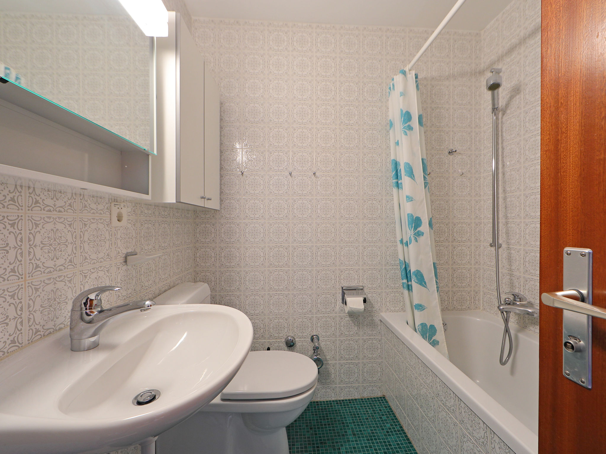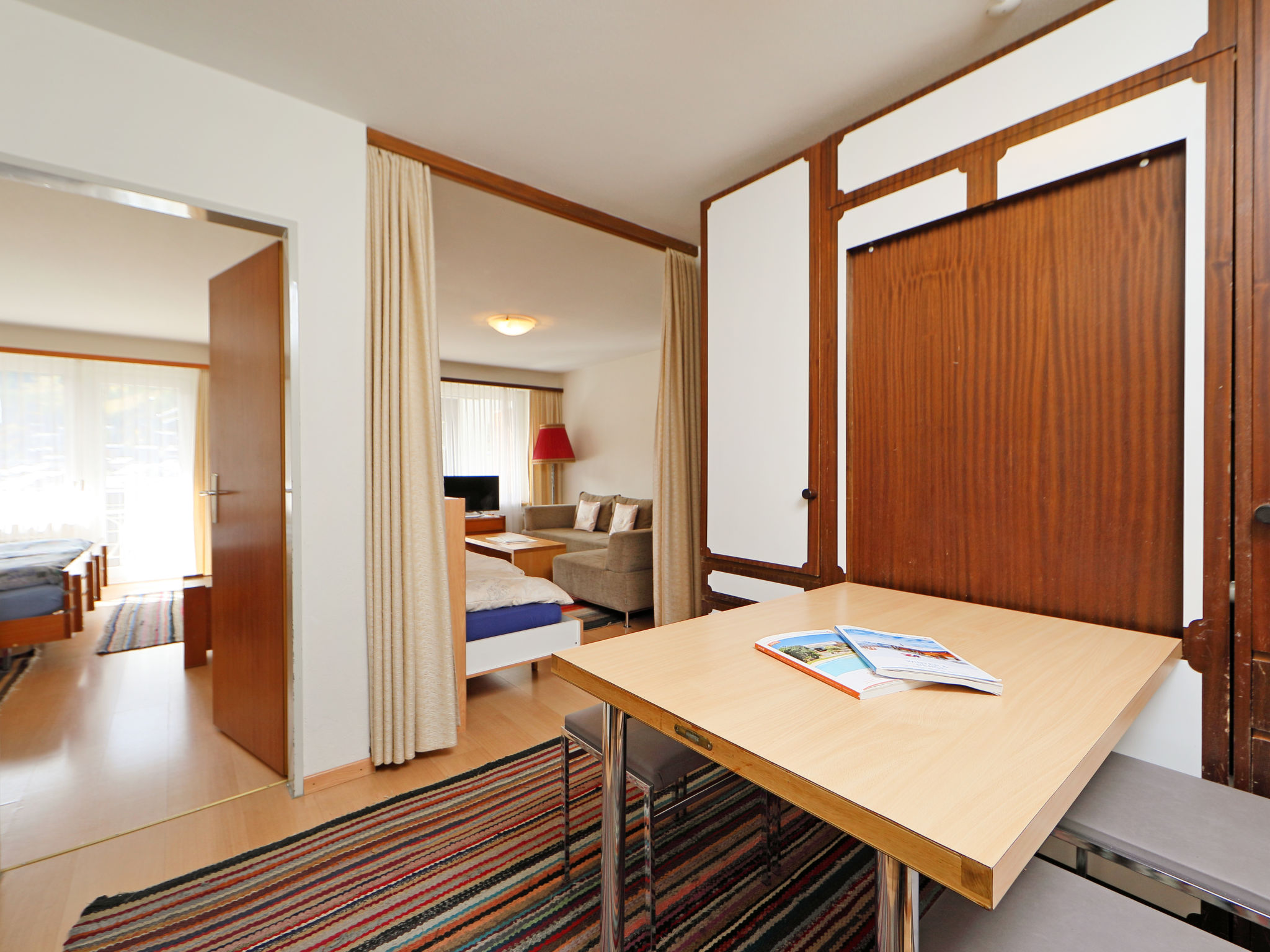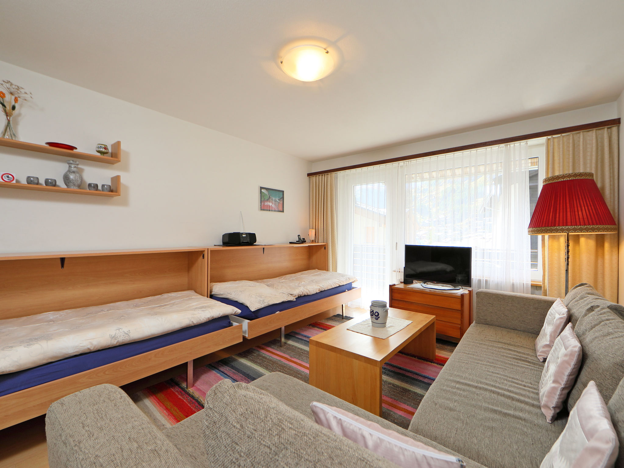2-Zimmer-Wohnung 56 m2 im 1. Stock, Südlage. Einfach und gemütlich eingerichtet: Wohn-/Schlafzimmer mit 2 Klappbetten (90 cm, Länge 190 cm), TV und Radio. 1 Zimmer mit 1 Doppelbett (2 x 90 cm, Länge 200 cm). (3 Kochplatten, Backofen, Geschirrspüler, Toaster, Wasserkocher, Tiefkühler, elektrische Kaffeemaschine, Fondue Set (Käse)). Bad/WC. Balkon, Südlage. Balkonmöbel. Schöne Sicht auf das Matterhorn. Zur Verfügung: Haartrockner. Internet (Wireless LAN, gratis). Bitte beachten: Nichtraucher-Unterkunft.