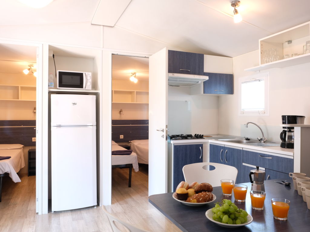 "Happy Plus", 4-Zimmer-Mobilheim 32 m2. Komfortabel eingerichtet: Wohn-/Schlafzimmer mit 1 Diwanbett, Esstisch, E-Heizung und Klimaanlage. 1 Zimmer mit 1 franz. Bett (140 cm). 2 Zimmer, jedes Zimmer mit 2 Betten (70 cm). Offene Küche (4 Kochplatten, Mikrowelle, Tiefkühler, elektrische Kaffeemaschine). Dusche, sep. WC. Terrasse teilweise überdacht. Terrassenmöbel, Elektrogrill (mobil), Liegestühle (2). Zur Verfügung: Fliegengitter. Bitte beachten: Nichtraucher-Unterkunft. Maximal 1 kleines Haustier/Hund erlaubt.