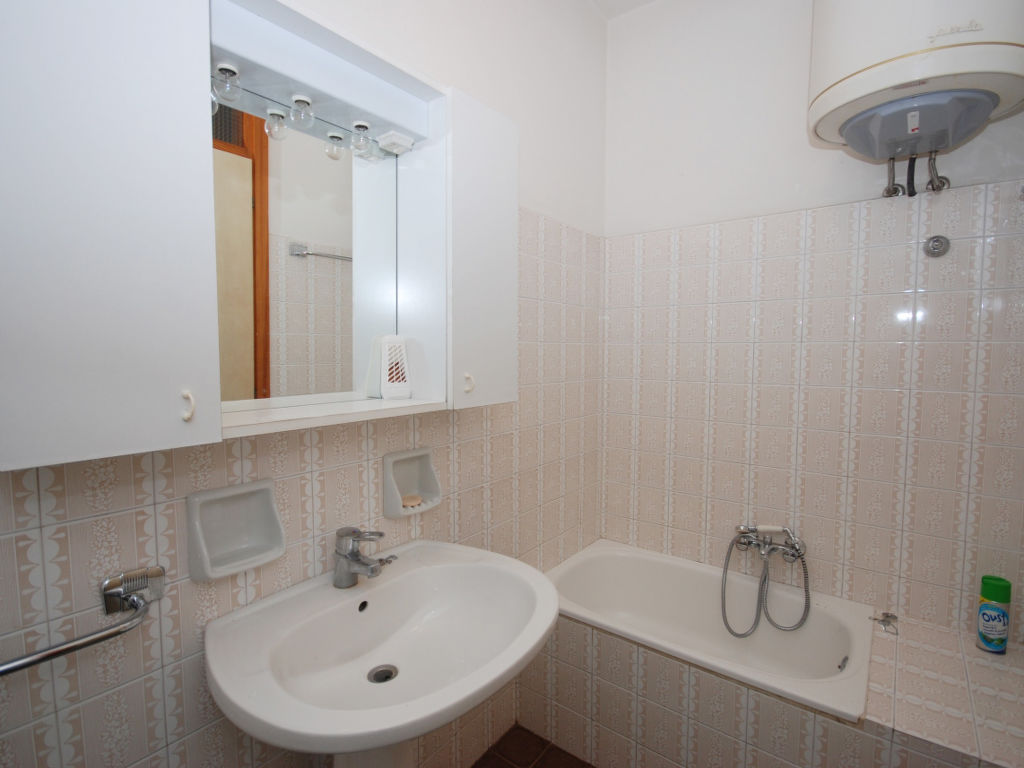 4-Zimmer-Wohnung, Erdgeschoss (Hanglage), 2 Ebenen, ca. 65 m². Separater Eingang über Außentreppe und Terrasse in Wohn-/Schlafraum mit Doppelbettcouch, Kamin (nur Dekoration) und Essplatz, offene kleine Küche (4 Flammen, Mikrowelle, Kühl-/Gefrierkombination, Kaffeemaschine). Über 5 Stufen nach oben zu: Doppelzimmer. Zweibettzimmer. Einzelzimmer. Dusche/WC.