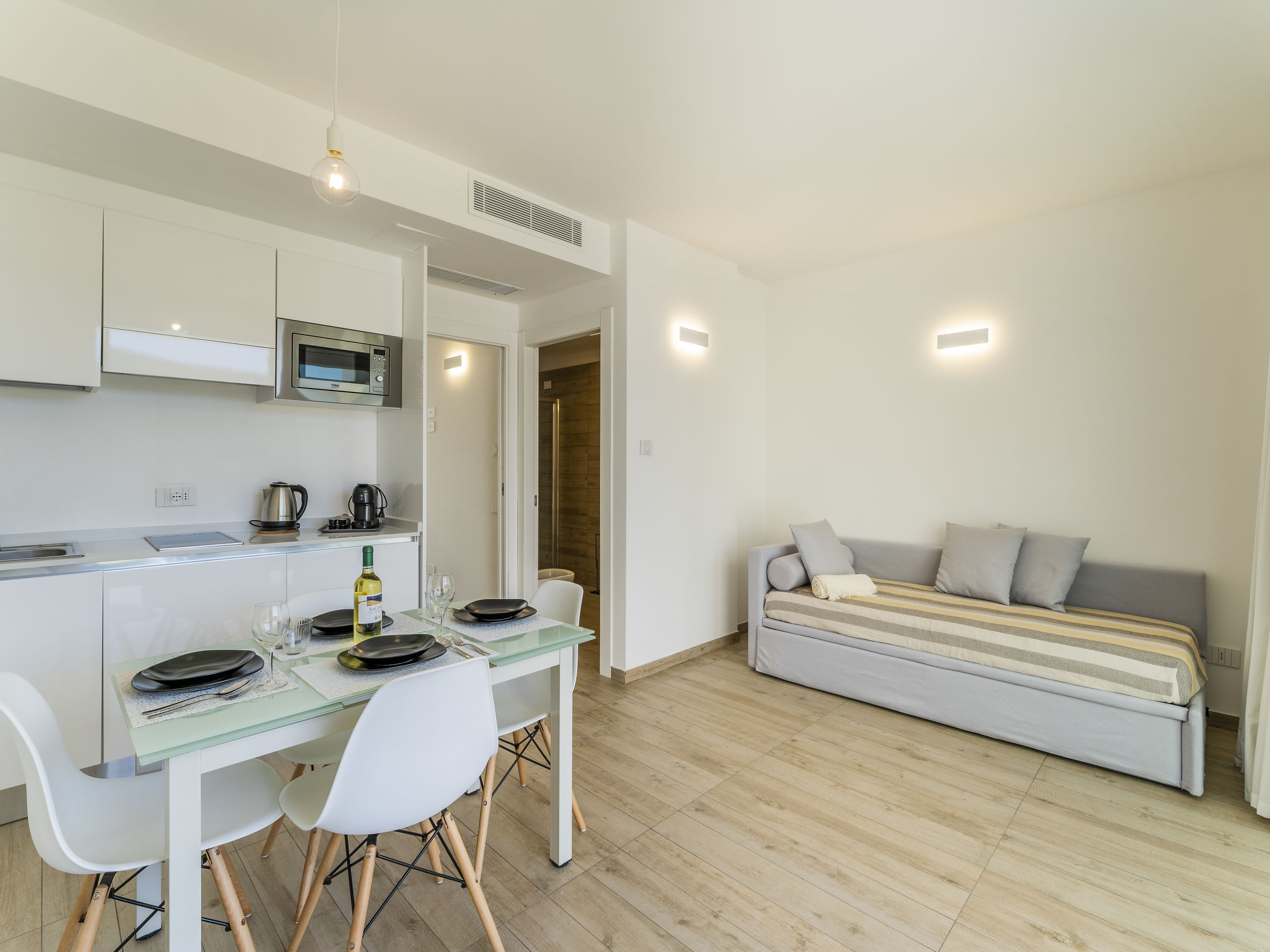 "Capo Falcone Charming Apartment (STI260)", 2-Zimmer-Wohnung 38 m2. Hell, komfortabel und stilvoll eingerichtet: Wohn-/Schlafzimmer mit 1 Doppeldiwanbett (Länge 180 cm), Esstisch und Sat-TV. 1 Doppelzimmer. Kochnische (2 Induktionskochplatten, Toaster, Wasserkocher, Mikrowelle, elektrische Kaffeemaschine). Dusche/Bidet/WC. Klimaanlage. Balkon oder Terrasse. Terrassenmöbel, Balkonmöbel. Zur Verfügung: Kinderhochstuhl, Haartrockner. Internet (Wireless LAN). Bitte beachten: Nichtraucher-Unterkunft. 1 kleines Haustier/Hund erlaubt. Rauchmelder.