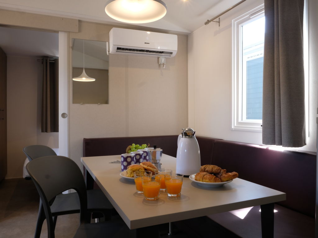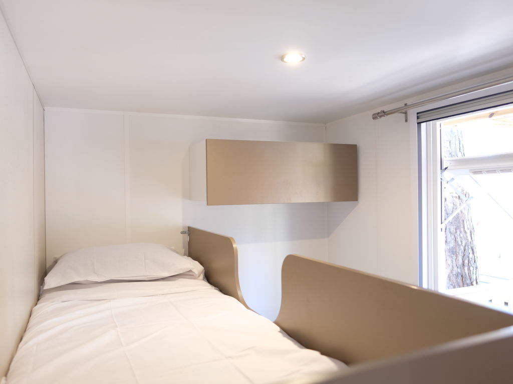"Happy Standard Extra", 3-Zimmer-Mobilheim 25 m2. Objekt geeignet für 5 Erwachsene + 1 Kind. Zweckmässig eingerichtet: Wohn-/Schlafzimmer mit 1 Diwanbett, Esstisch, E-Heizung und Klimaanlage. 1 Zimmer mit 1 franz. Bett (140 cm). 1 Zimmer mit 1 x 2 Etagenbetten (70 cm), 1 Ausziehbett. Offene Küche (4 Kochplatten). Dusche/WC. Terrasse teilweise überdacht. Terrassenmöbel, Elektrogrill (mobil), Liegestühle (2). Bitte beachten: Nichtraucher-Unterkunft.