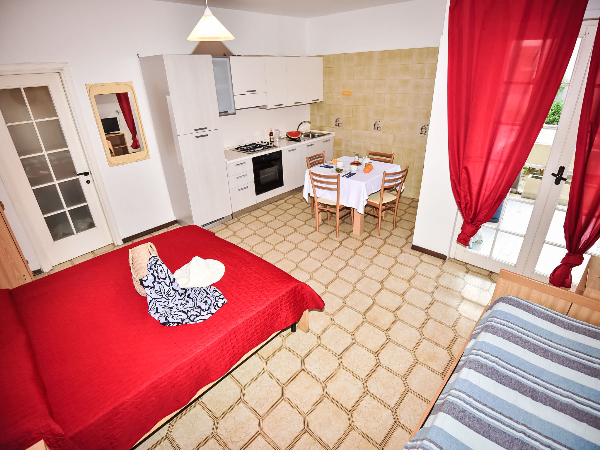 1-Zimmer-Studio 30 m2. Einfach und zweckmässig eingerichtet: Wohn-/Esszimmer mit 1 Doppeldiwanbett, 1 Doppelbett und TV. Ausgang zum Balkon. Kochnische (4 Kochplatten). Dusche/Bidet/WC. Balkon. Balkonmöbel. Zur Verfügung: Waschmaschine. 1 Haustier/Hund erlaubt.
