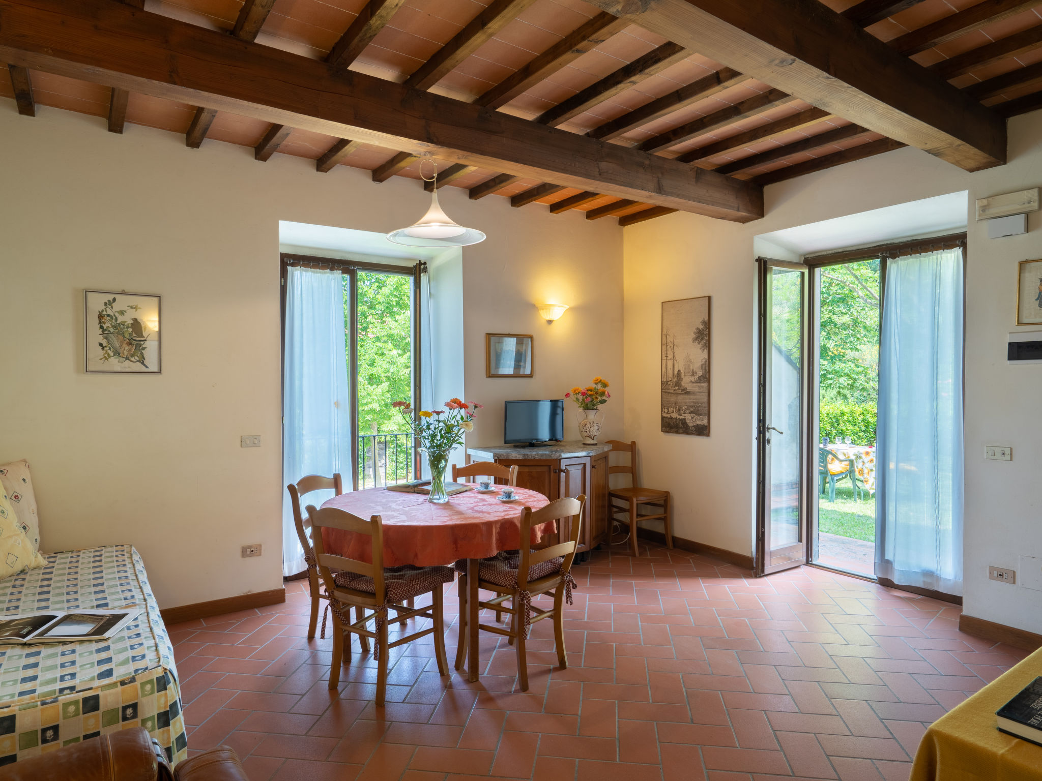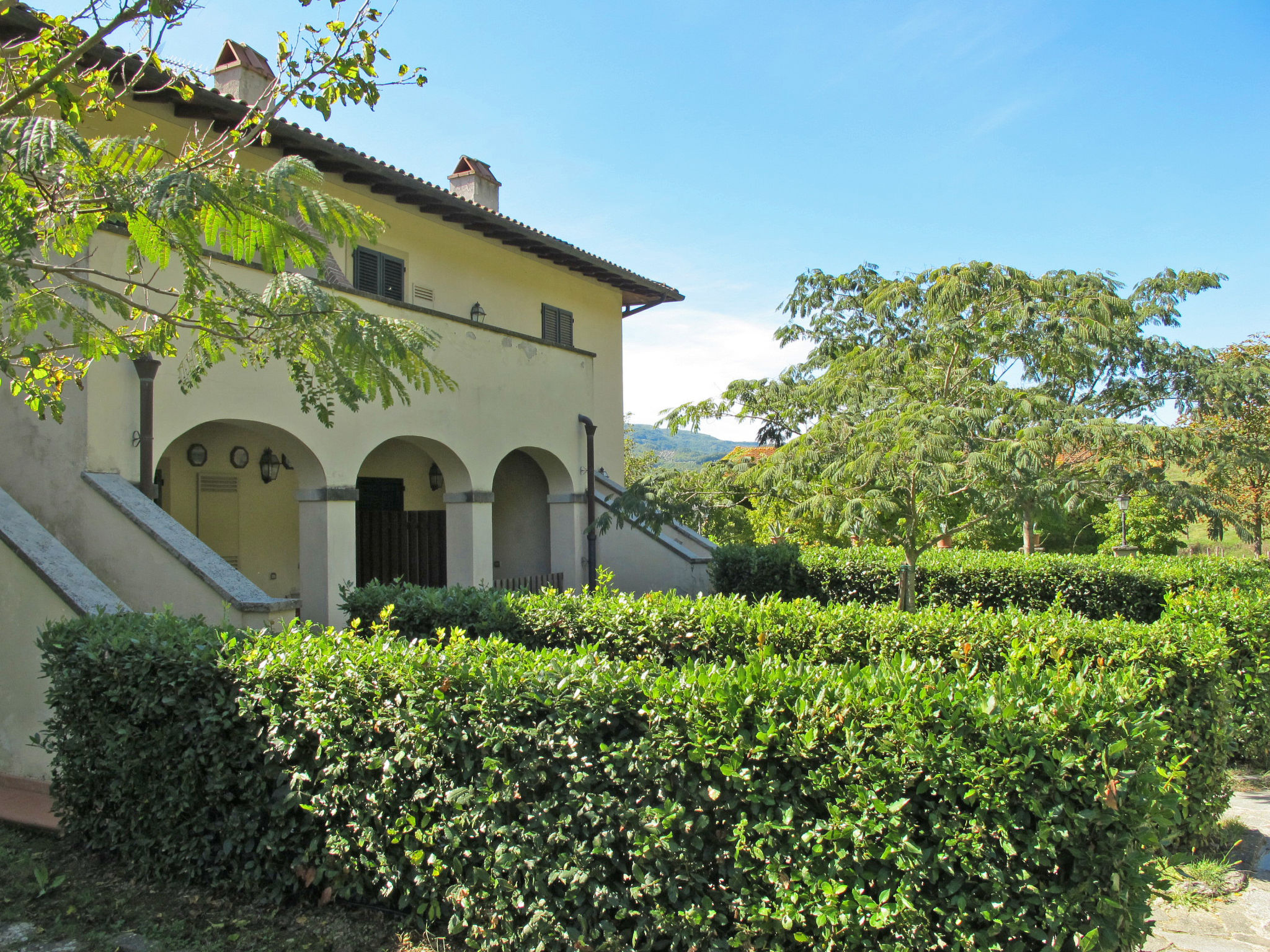 Rustikal, alleinstehend auf Weingut Landwirtschaftlicher Betrieb "Vigna La Corte", auf 2 Stockwerken, aus dem 16. Jahrhundert, umgeben von Bäumen, Wiesen und Feldern. 3 Häuser in der Residenz. 13 Wohnungen in der Residenz. 2 km vom Zentrum von Dicomano, 7.2 km vom Zentrum von Vicchio, 45 km vom Zentrum von Firenze, alleinstehende, erhöhte Lage am Hang. Zur Mitbenutzung: Grundstück 60 ha mit Pflanzen und Bäumen, Wiese, Schwimmbad (16 x 8 m, 140 cm tief, saisonale Verfügbarkeit: 01.Mai.-01.Okt.). Aussendusche, Tischtennis, Laube, Terrasse, Gartenmöbel, Grill. In der Anlage: Empfang, Wireless LAN, Tischfussball, Waschmaschine (zur Mitbenutzung). Zur Verfügung: Fahrräder. Zufahrt (500 m Naturweg). Parkplatz (überdacht) auf dem Grundstück. Supermarkt 2 km, Restaurant 2 km, Bahnstation "Dicomano" 2 km. Auf dem Grundstück Tierhaltung. Ab Hof Verkauf von bäuerlichen Produkten. Bitte beachten: Eisenbahnlinie 1 km vom Haus.