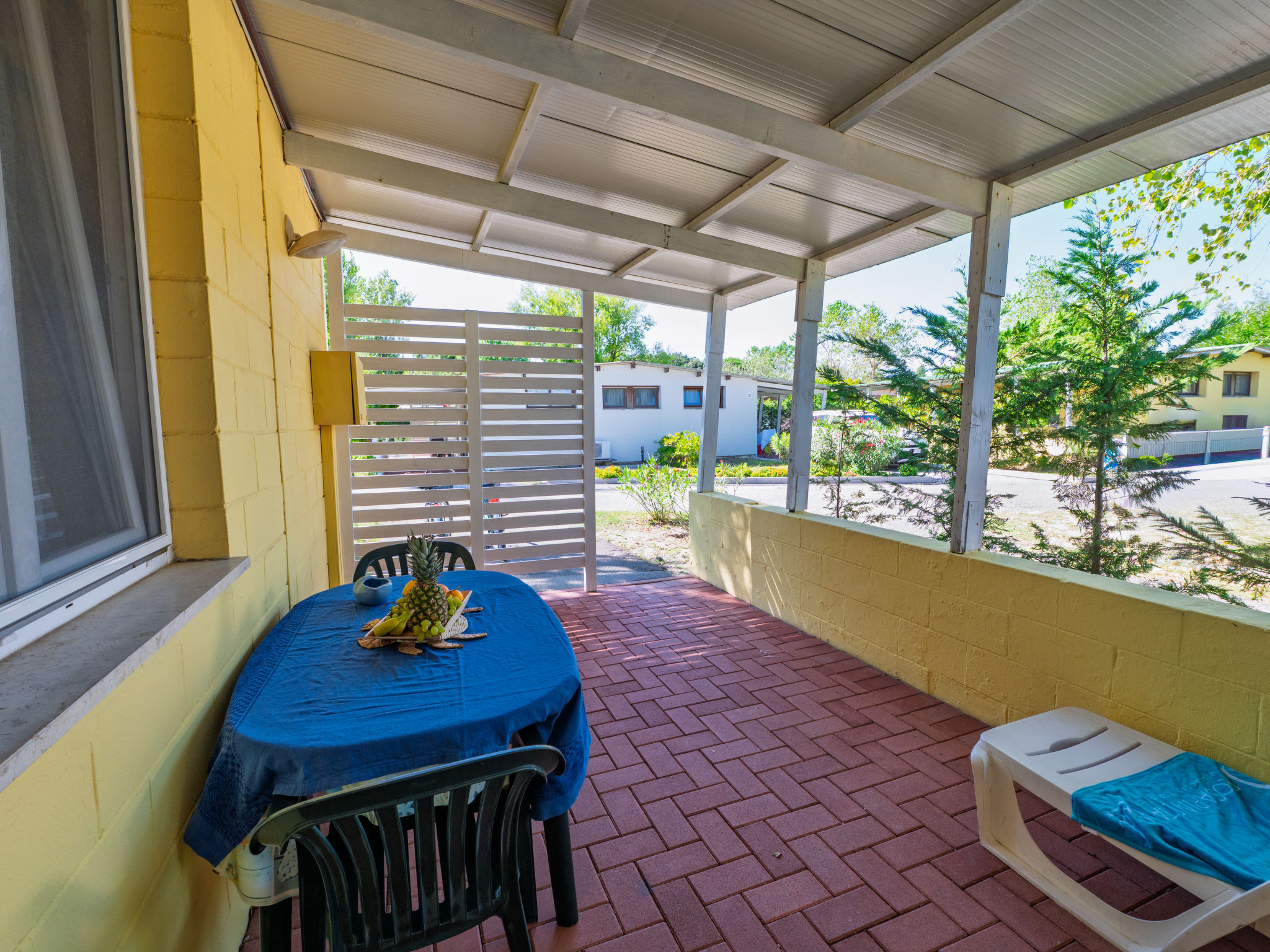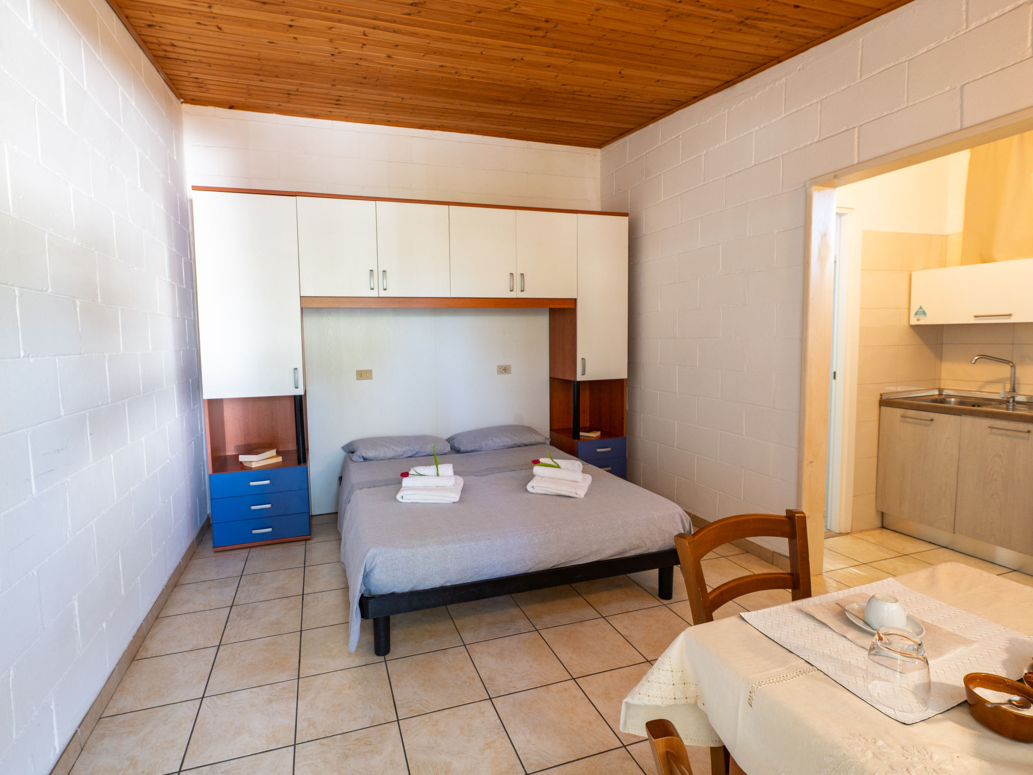 1-Zimmer-Bungalow, ca. 20 m². Wohn-/Schlafraum mit 2 Einzelbetten, Essplatz, Küchenzeile (4 Flammen, Mikrowelle, Kühl-/Gefrierkombination). Dusche/WC.