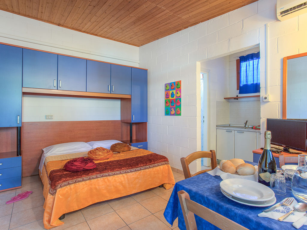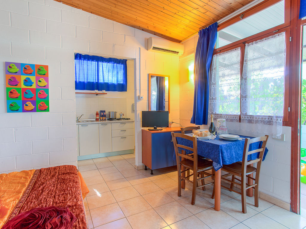 1-Zimmer-Bungalow, ca. 20 m². Wohn-/Schlafraum mit 2 Einzelbetten, Essplatz, Küchenzeile (4 Flammen, Mikrowelle, Kühl-/Gefrierkombination). Dusche/WC.