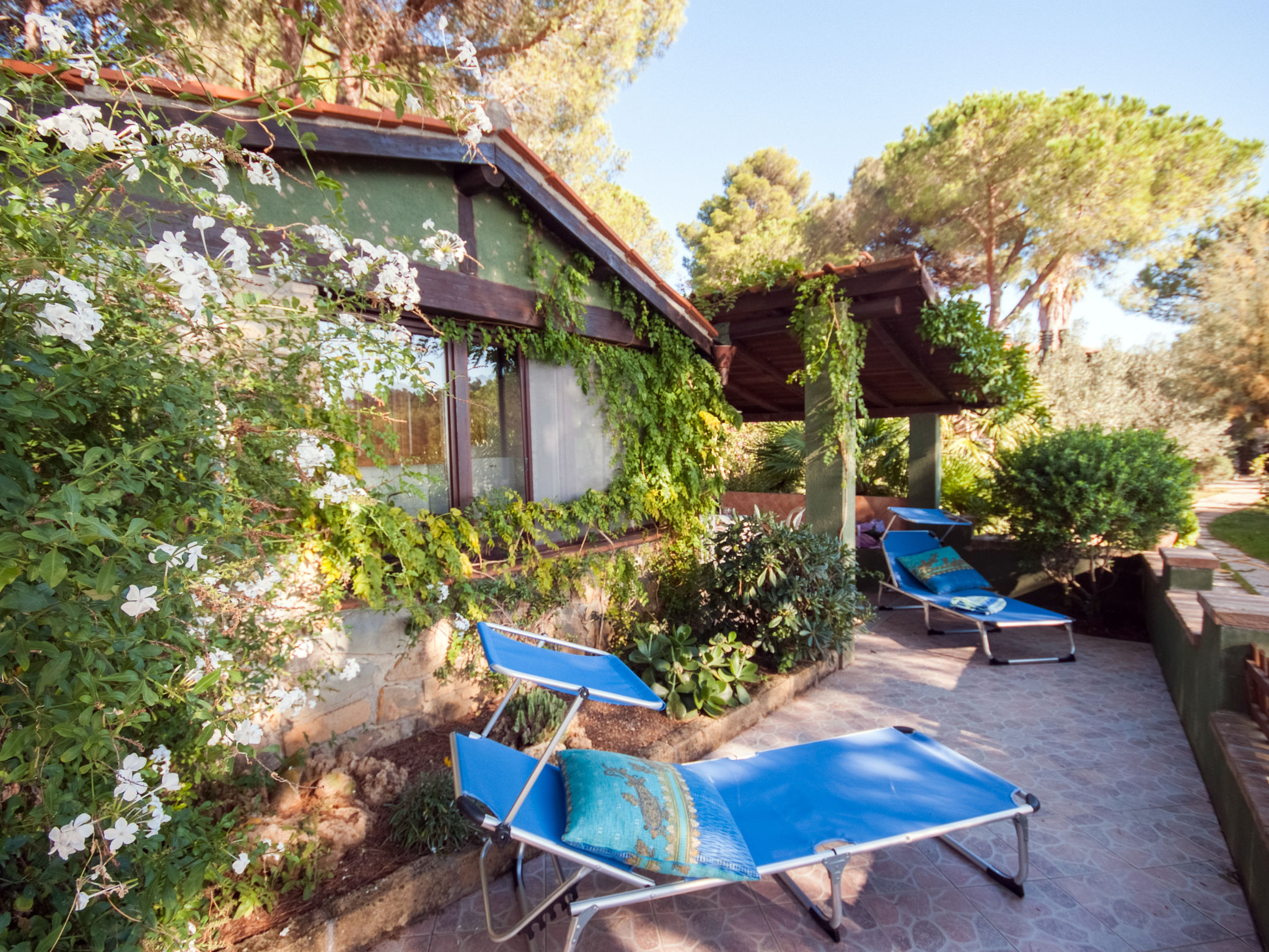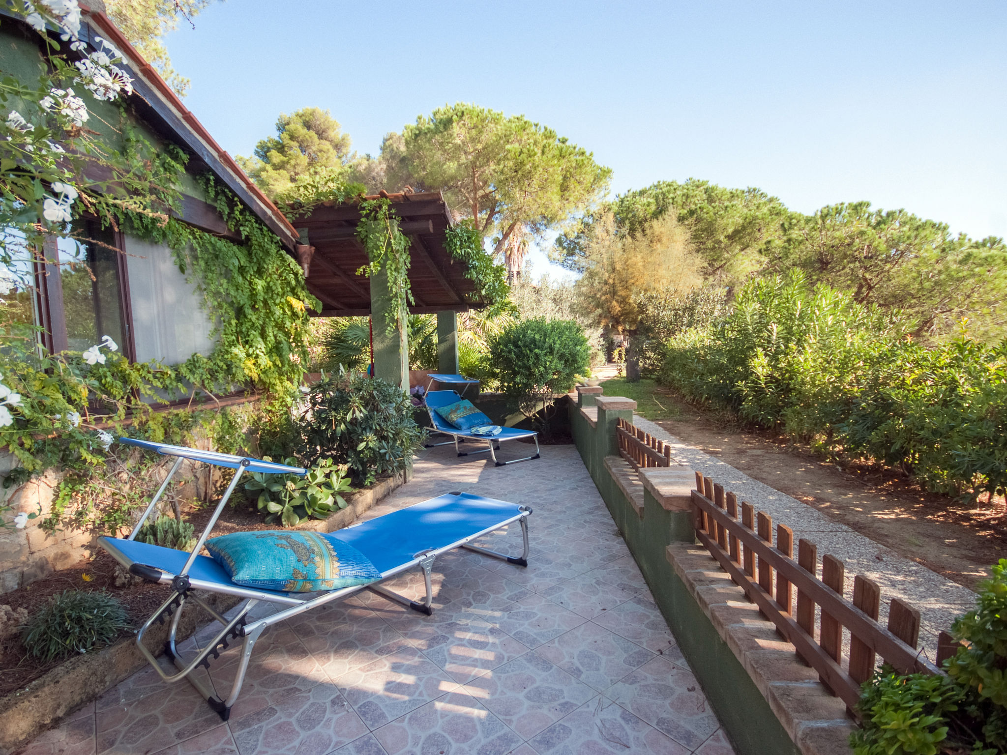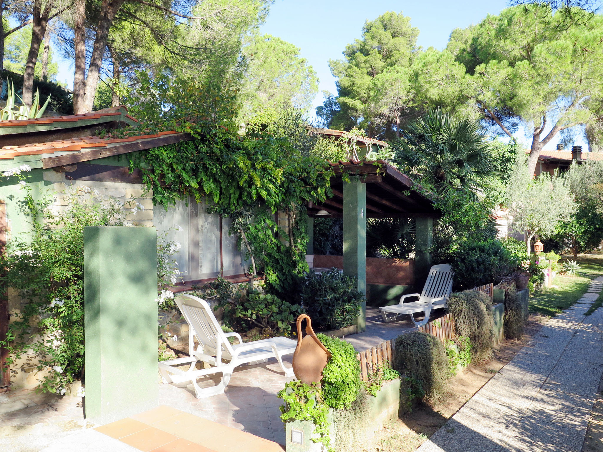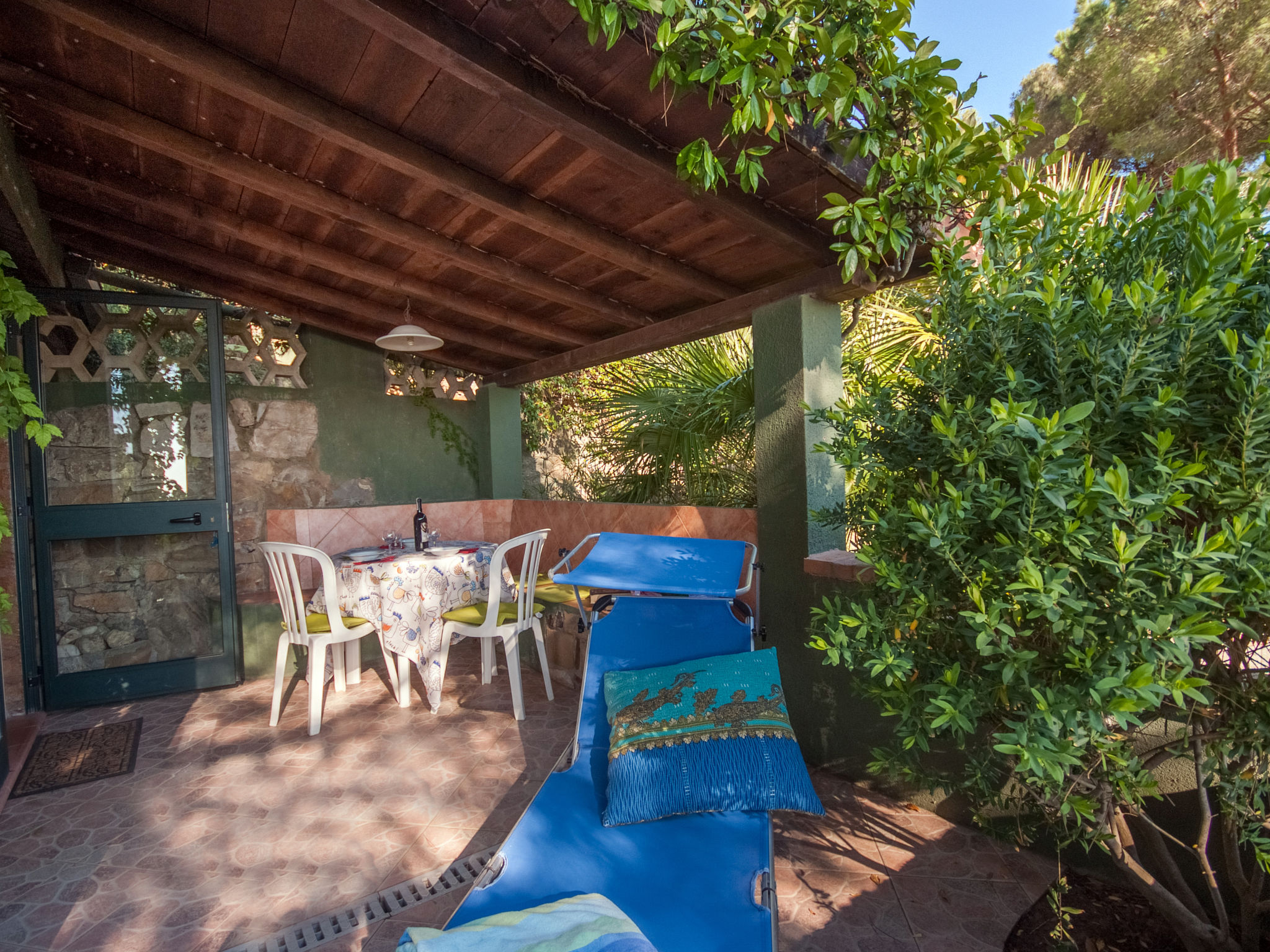 2-Zimmer-Haus 25 m2, im Erdgeschoss. Zweckmässig und gemütlich eingerichtet: 1 Zimmer mit 1 franz. Bett (150 cm), Ventilator. Wohnküche (2 Flammen) mit Esstisch, Internationale TV-Sender. Ausgang zur Terrasse. Dusche/Bidet/WC. Keine Heizmöglichkeit. Terrasse überdacht. Terrassenmöbel, Liegestühle (1). Sicht auf den Garten und das Meer. Zur Verfügung: Fliegengitter, Babybett, Haartrockner. Parkplatz Nr. 1. Bitte beachten: Nichtraucher-Unterkunft. Maximal 1 Haustier/Hund erlaubt.