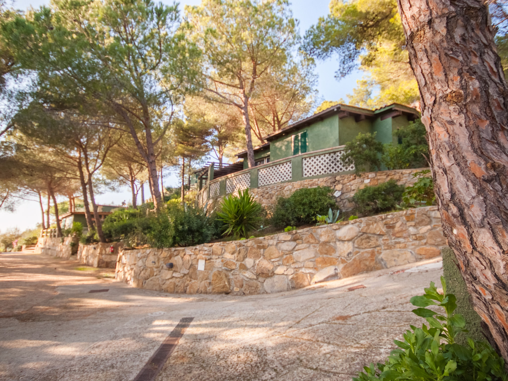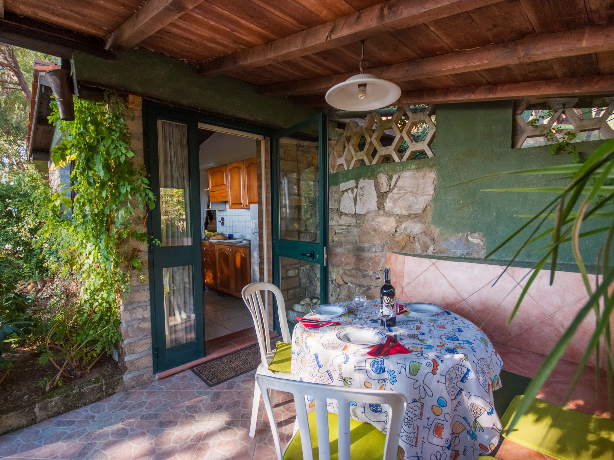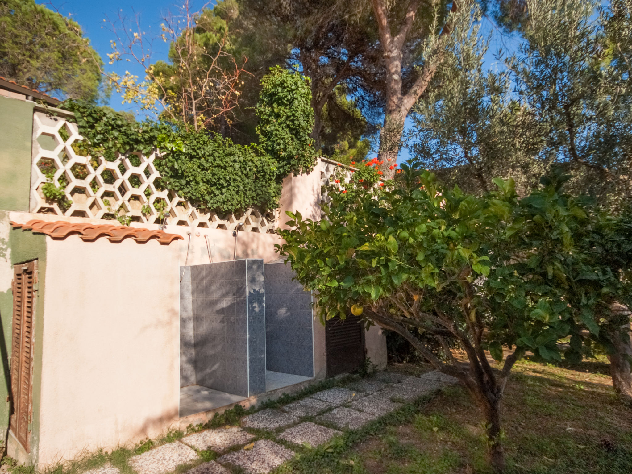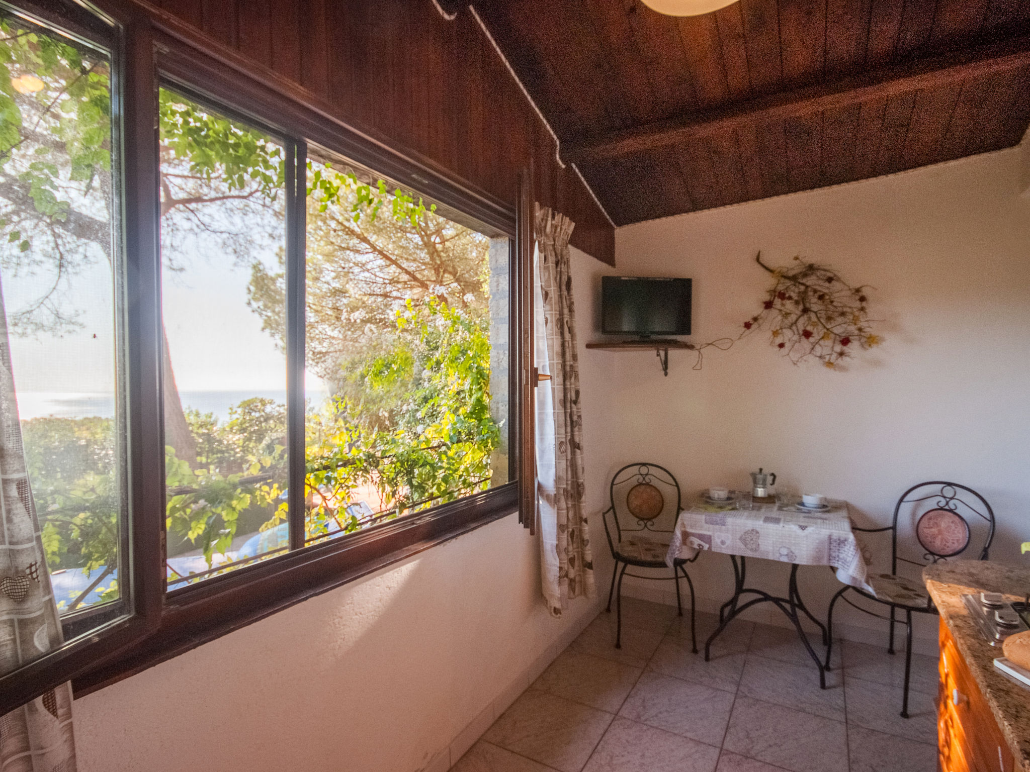 2-Zimmer-Haus 25 m2, im Erdgeschoss. Zweckmässig und gemütlich eingerichtet: 1 Zimmer mit 1 franz. Bett (150 cm), Ventilator. Wohnküche (2 Flammen) mit Esstisch, Internationale TV-Sender. Ausgang zur Terrasse. Dusche/Bidet/WC. Keine Heizmöglichkeit. Terrasse überdacht. Terrassenmöbel, Liegestühle (1). Sicht auf den Garten und das Meer. Zur Verfügung: Fliegengitter, Babybett, Haartrockner. Parkplatz Nr. 1. Bitte beachten: Nichtraucher-Unterkunft. Maximal 1 Haustier/Hund erlaubt.