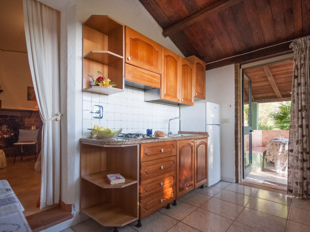 2-Zimmer-Haus 25 m2, im Erdgeschoss. Zweckmässig und gemütlich eingerichtet: 1 Zimmer mit 1 franz. Bett (150 cm), Ventilator. Wohnküche (2 Flammen) mit Esstisch, Internationale TV-Sender. Ausgang zur Terrasse. Dusche/Bidet/WC. Keine Heizmöglichkeit. Terrasse überdacht. Terrassenmöbel, Liegestühle (1). Sicht auf den Garten und das Meer. Zur Verfügung: Fliegengitter, Babybett, Haartrockner. Parkplatz Nr. 1. Bitte beachten: Nichtraucher-Unterkunft. Maximal 1 Haustier/Hund erlaubt.