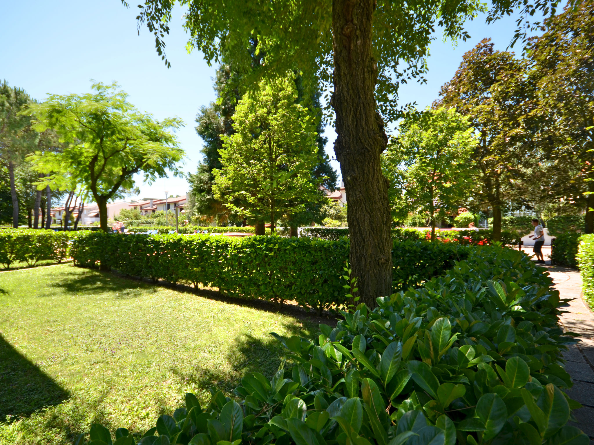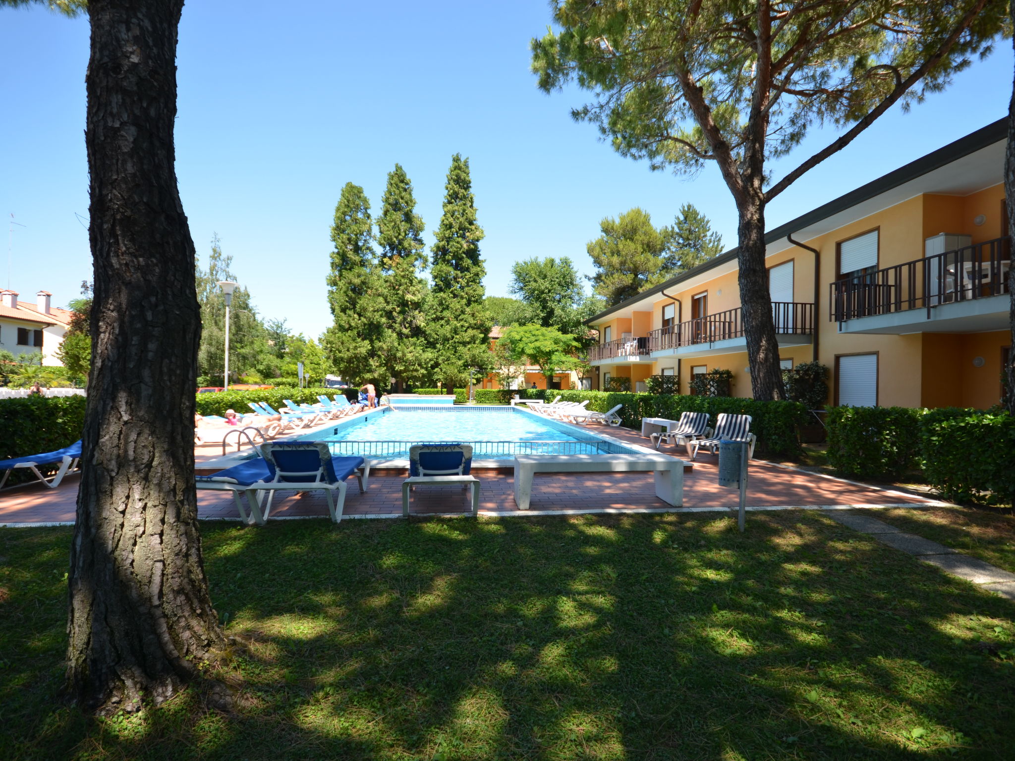 Das VILLAGGIO GELSOMINI, eine kleine Ferienanlage mit 20 Wohnungen, liegt auf einem hübsch angelegten, umzäunten Grundstück in Bibione-Spiaggia, ca. 1300 m vom Strand entfernt. Supermarkt ca. 400 m, nächstes Restaurant ca. 650 m. Pool (16 x 6,5 m, ca. 15.05.-15.09.) mit Kinderbecken (3,3 x 6,5 m) und Sonnenliegen. Im Poolbereich Internetzugang (WLAN, € 15/Woche). Pro Wohnung 1 nummerierter Parkplatz auf dem Grundstück, weitere Parkmöglichkeiten an der Straße. Alle Wohnungen haben separaten Eingang. BIB 570 mit teilüberdachter Terrrasse, kleinem Gartenanteil und Mobiliar, BIB 571 mit teilüberdachtem, möbliertem Balkon. Feriengerechte Einrichtung. Sat-TV (deutsche Programme), Safe. Klimaanlage mit Kühl-/Heizfunktion (nicht in allen Räumen). Hinweis: Gruppen werden nicht akzeptiert. Strandservice: Von ca. Ende April bis ca. Ende September sind jeweils 1 Liegestuhl, 1 Sonnenliege und 1 Sonnenschirm pro Wohnung im Mietpreis enthalten. Shuttleservice: Von ca. 04.06.-09.09. kostenloser Shuttlebus zum Strandabschnitt 'Via delle Colonie' bei den Thermen (täglich im 30-Minuten-Rhythmus, von 9-19.30 h). Europacard: Unsere Gäste erhalten u.a. pro Person/Aufenthalt 1 Einladung zu einer Spaghetti-Party im Freien (ca. Anfang Juni bis ca. Mitte September). Fahrradverleih: € 16/Person/Woche (Kaution € 50/Rad).