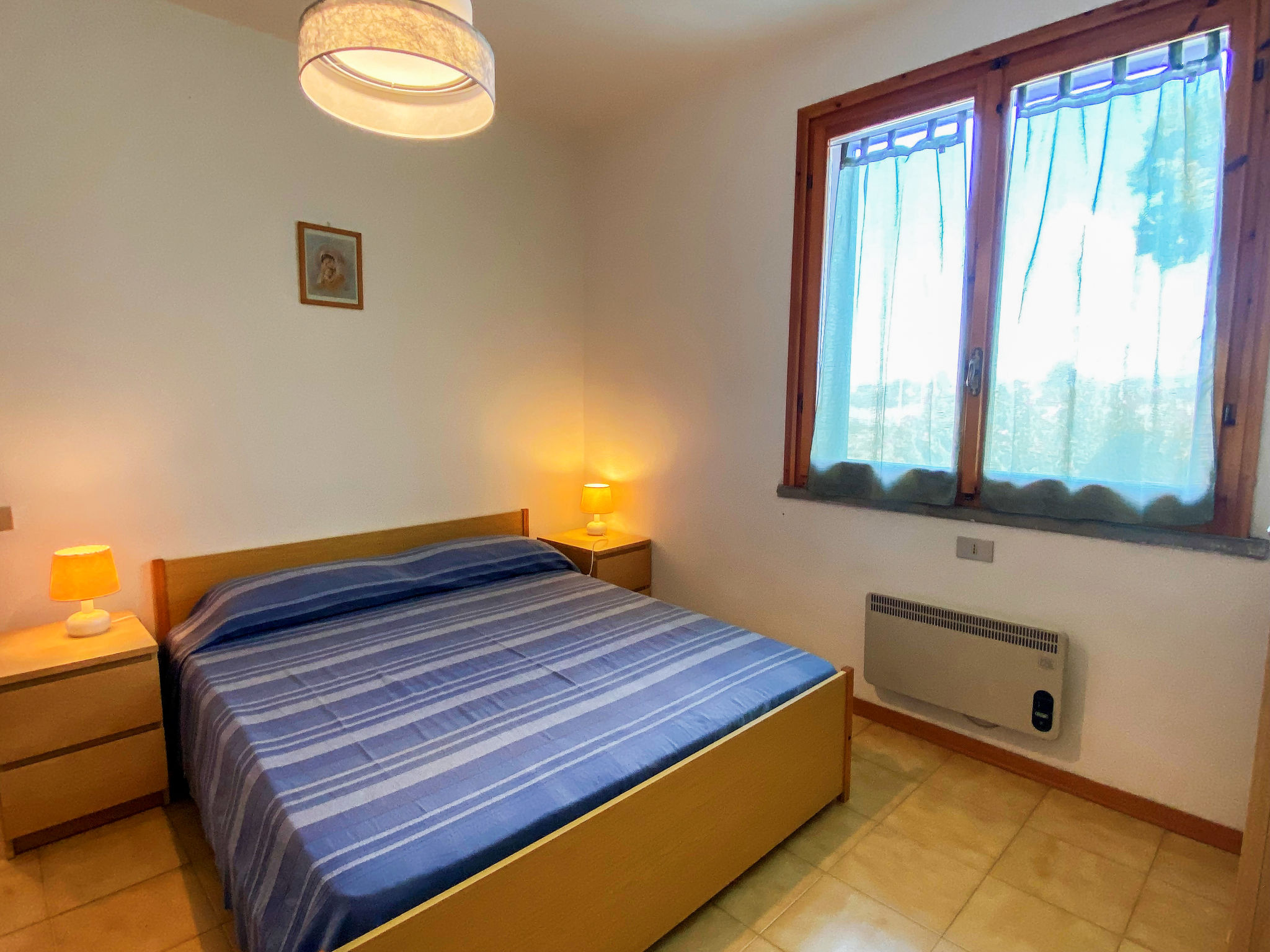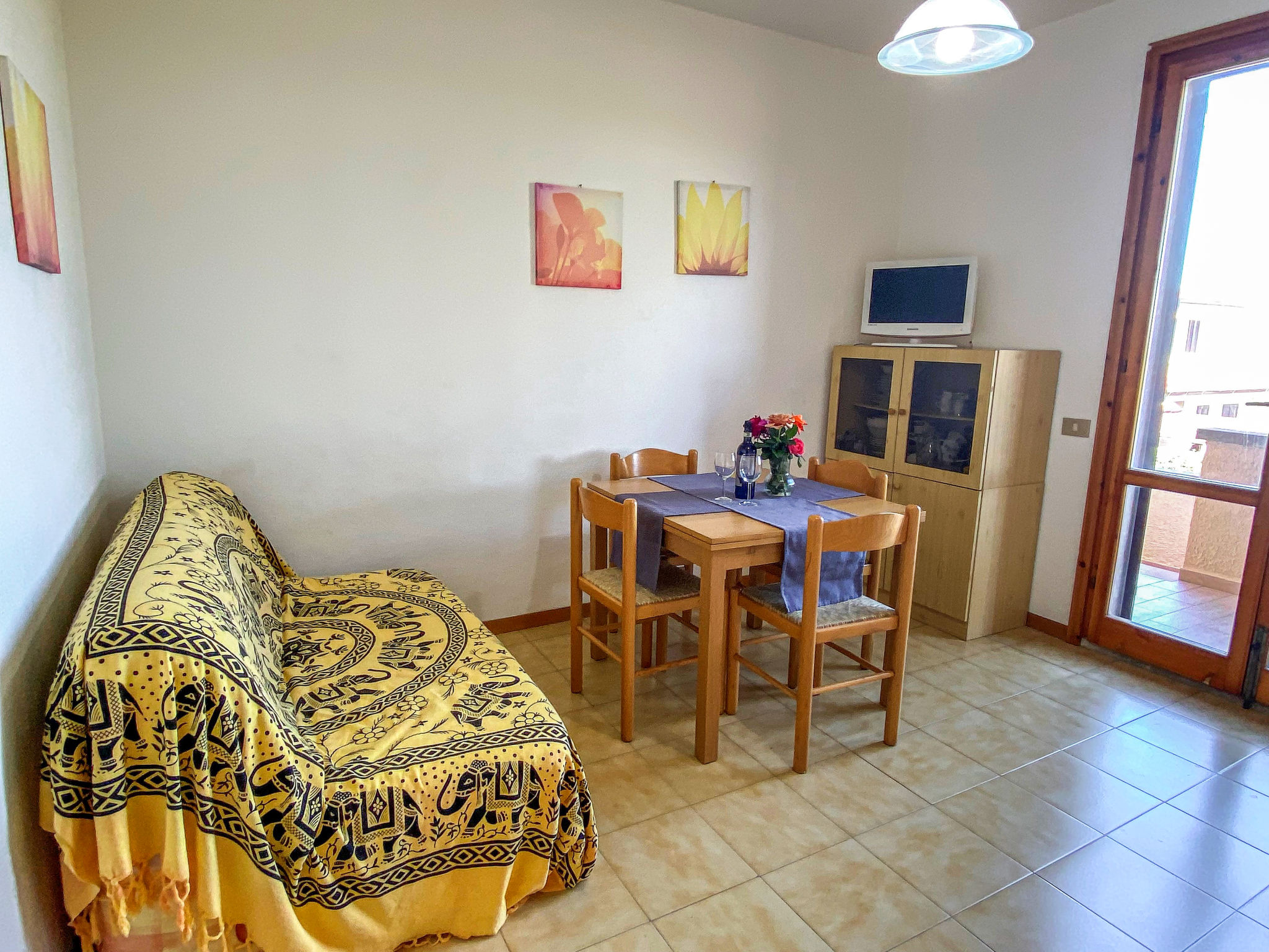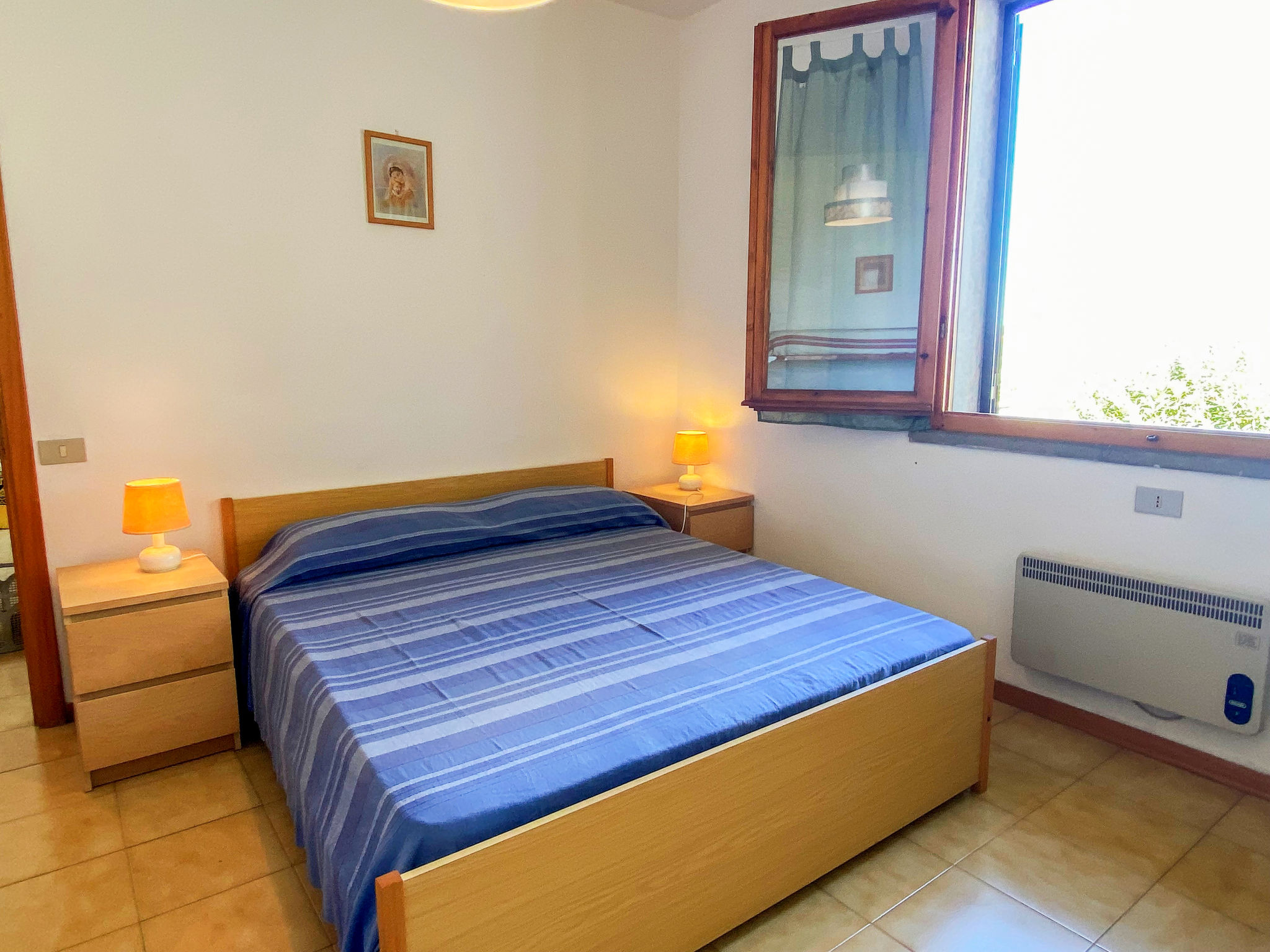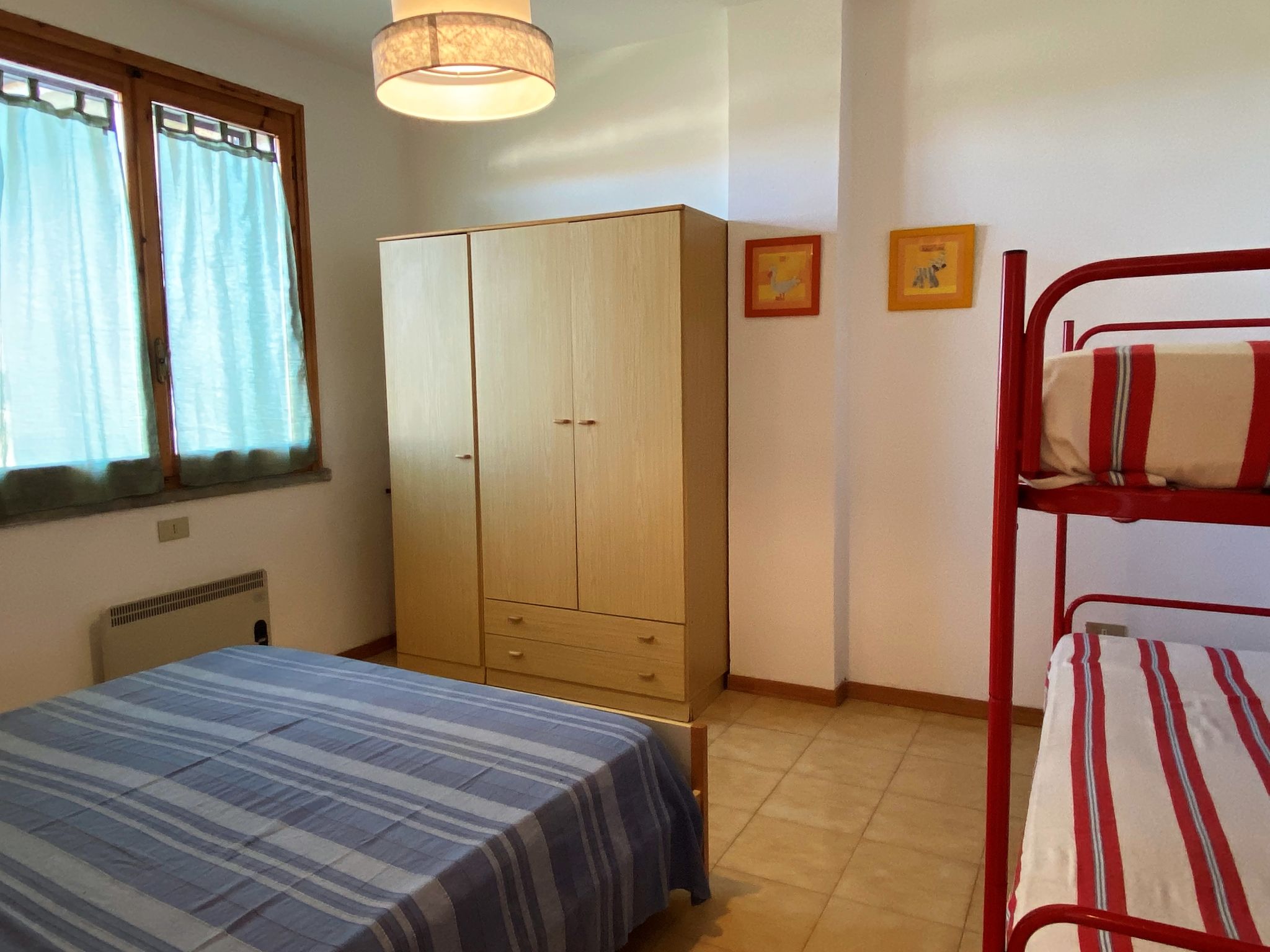 "Palazzeta II", 2-Zimmer-Wohnung 40 m2 im 1. Stock. Zweckmässig eingerichtet: Wohn-/Schlafzimmer mit 1 Diwanbett und Esstisch. 1 Zimmer mit 1 x 1 Etagenbetten (80 cm), 1 Doppelbett (80 cm). Kochnische (4 Flammen). Dusche/WC. E-Heizung. Terrasse. Terrassenmöbel. Zur Verfügung: Babybett. Parkplatz (1 Auto). 1 Haustier/Hund erlaubt.