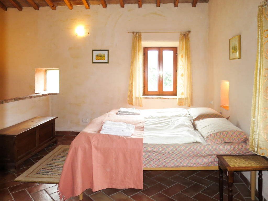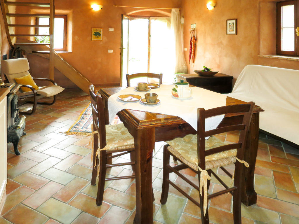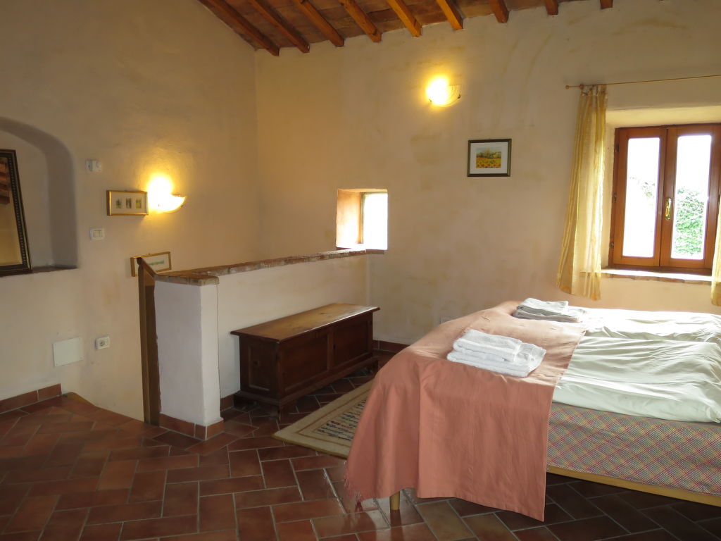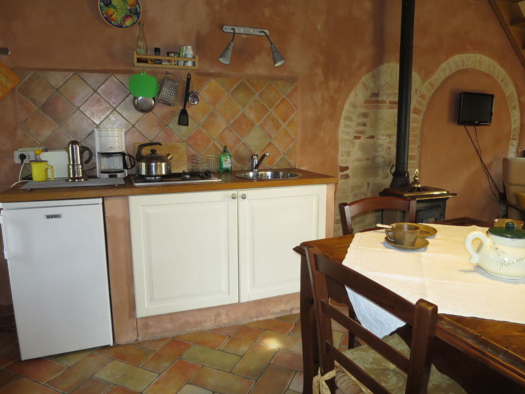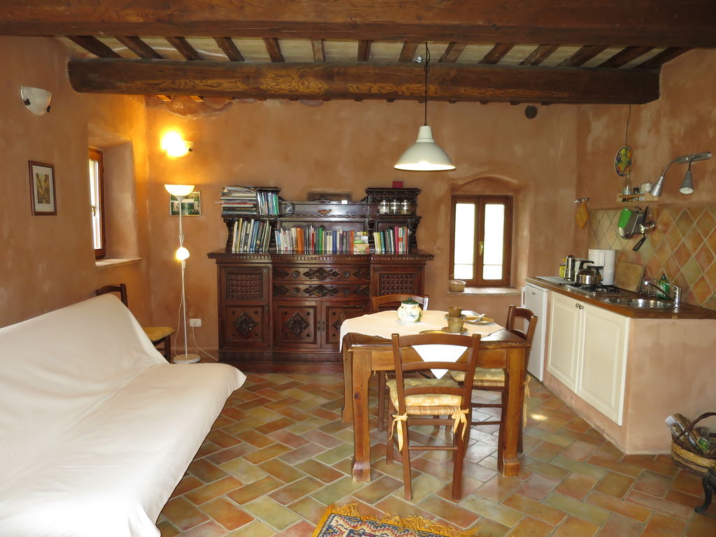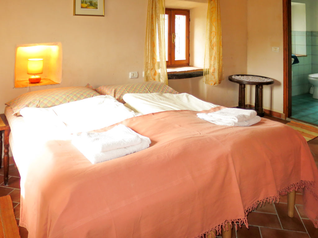 "Podere Calmaino", 2-Zimmer-Haus 50 m2 auf 2 Stockwerken. Gemütlich eingerichtet: Wohn-/Schlafzimmer mit 1 Doppeldiwanbett (160 cm), Schwedenofen, Esstisch und Sat-TV. Offene Küche (2 Flammen, Mikrowelle, elektrische Kaffeemaschine). Obergeschoss: 1 offenes Zimmer mit 1 franz. Bett (160 cm, Länge 190 cm), Dusche/WC und Warmluftheizung. Liegestühle (2). Zur Verfügung: Internet (Wireless LAN, gratis). Maximal 1 Haustier/Hund erlaubt. Flexibilität bei der Bettenaufteilung: Es stehen mehr Schlafmöglichkeiten zur Verfügung als die maximal zugelassene Personenzahl, diese darf dennoch nicht überschritten werden.