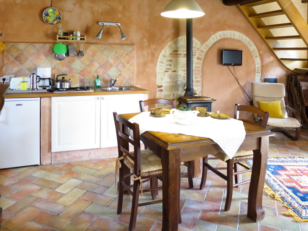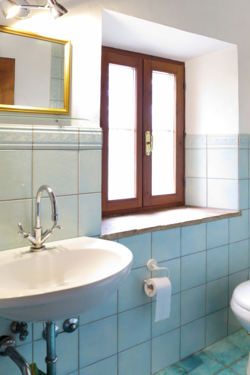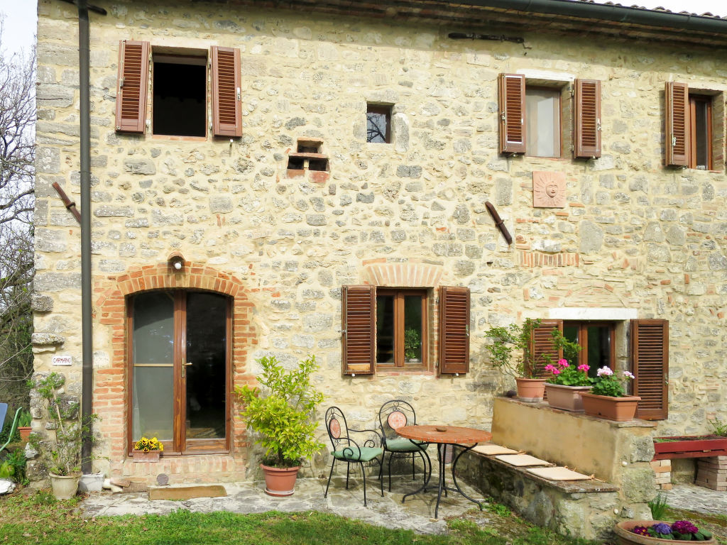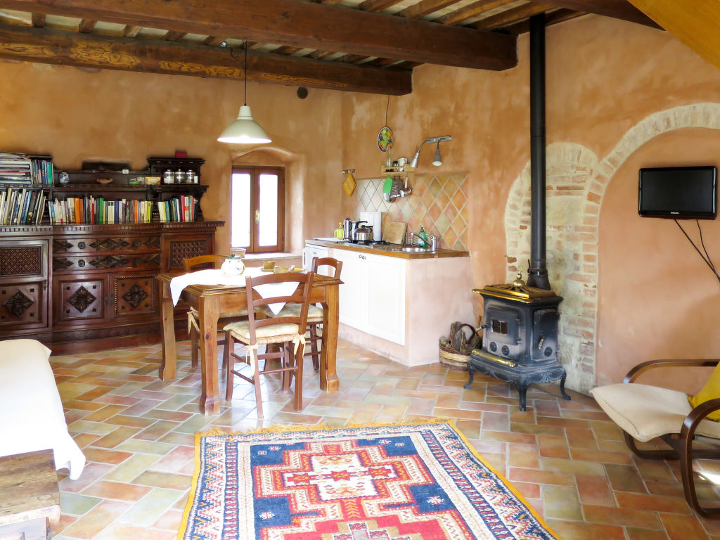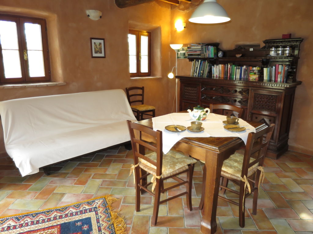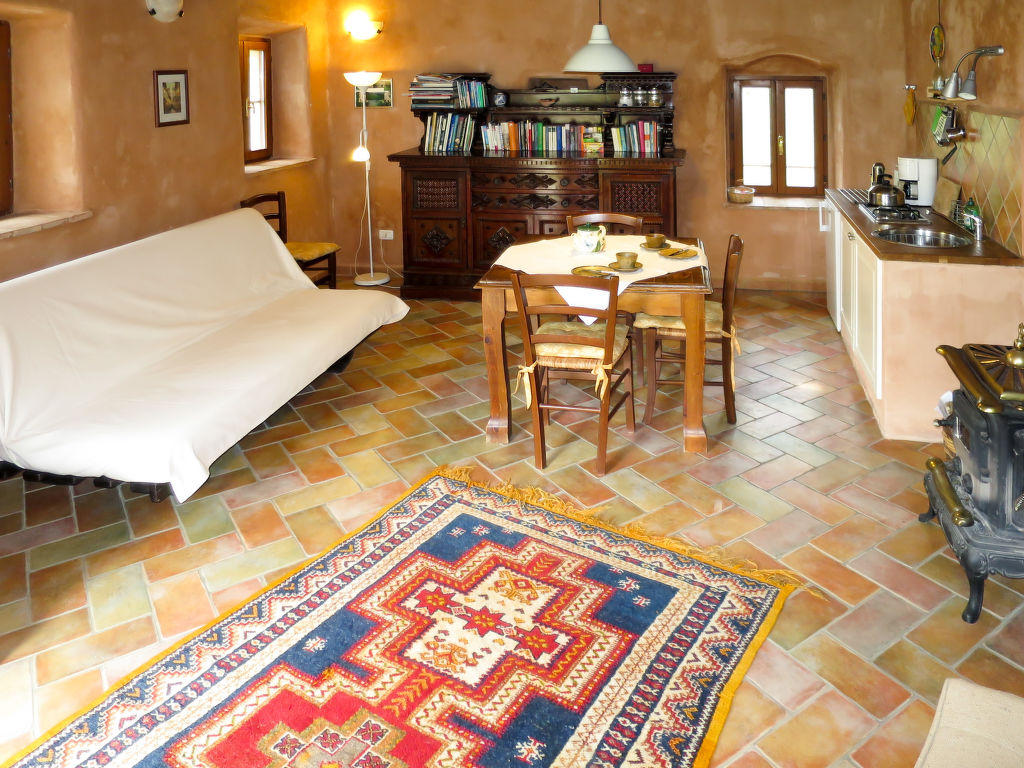 "Podere Calmaino", 2-Zimmer-Haus 50 m2 auf 2 Stockwerken. Gemütlich eingerichtet: Wohn-/Schlafzimmer mit 1 Doppeldiwanbett (160 cm), Schwedenofen, Esstisch und Sat-TV. Offene Küche (2 Flammen, Mikrowelle, elektrische Kaffeemaschine). Obergeschoss: 1 offenes Zimmer mit 1 franz. Bett (160 cm, Länge 190 cm), Dusche/WC und Warmluftheizung. Liegestühle (2). Zur Verfügung: Internet (Wireless LAN, gratis). Maximal 1 Haustier/Hund erlaubt. Flexibilität bei der Bettenaufteilung: Es stehen mehr Schlafmöglichkeiten zur Verfügung als die maximal zugelassene Personenzahl, diese darf dennoch nicht überschritten werden.