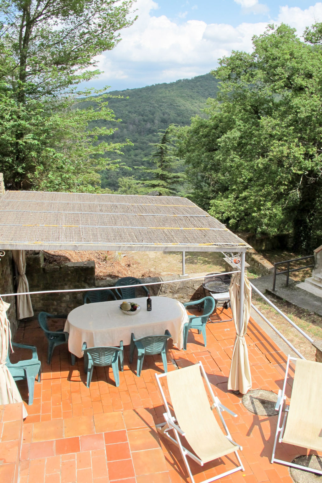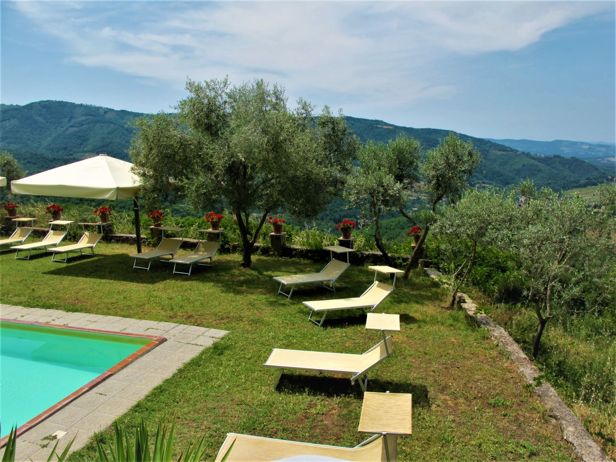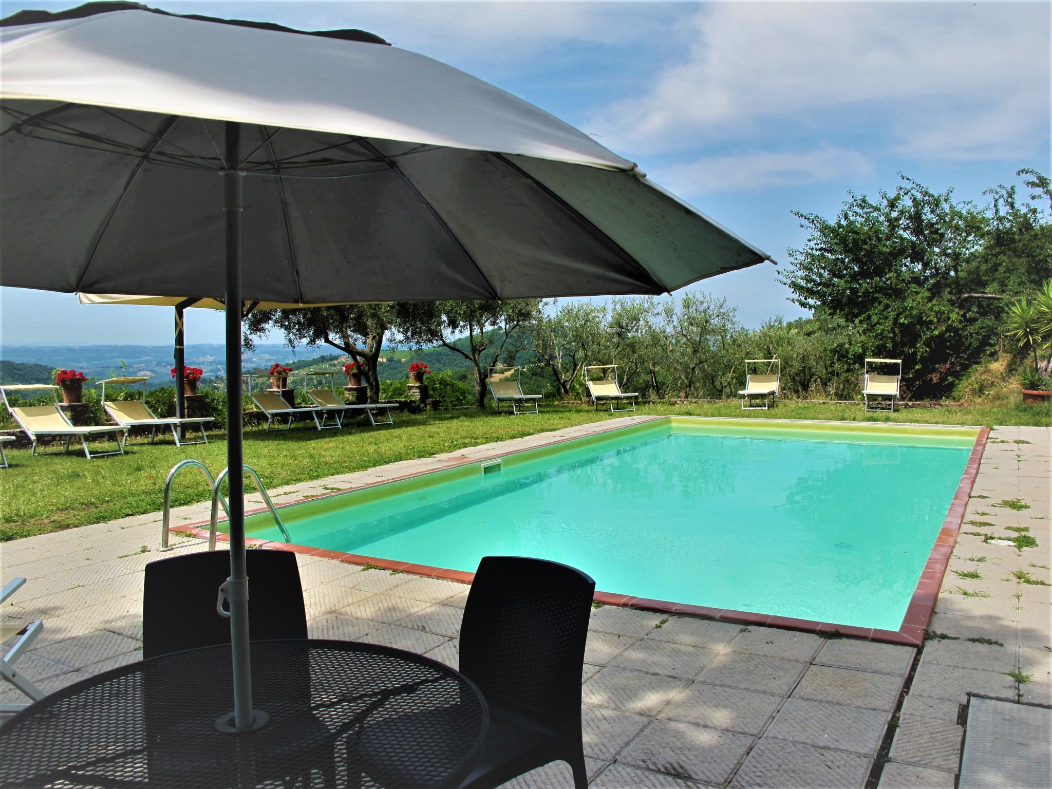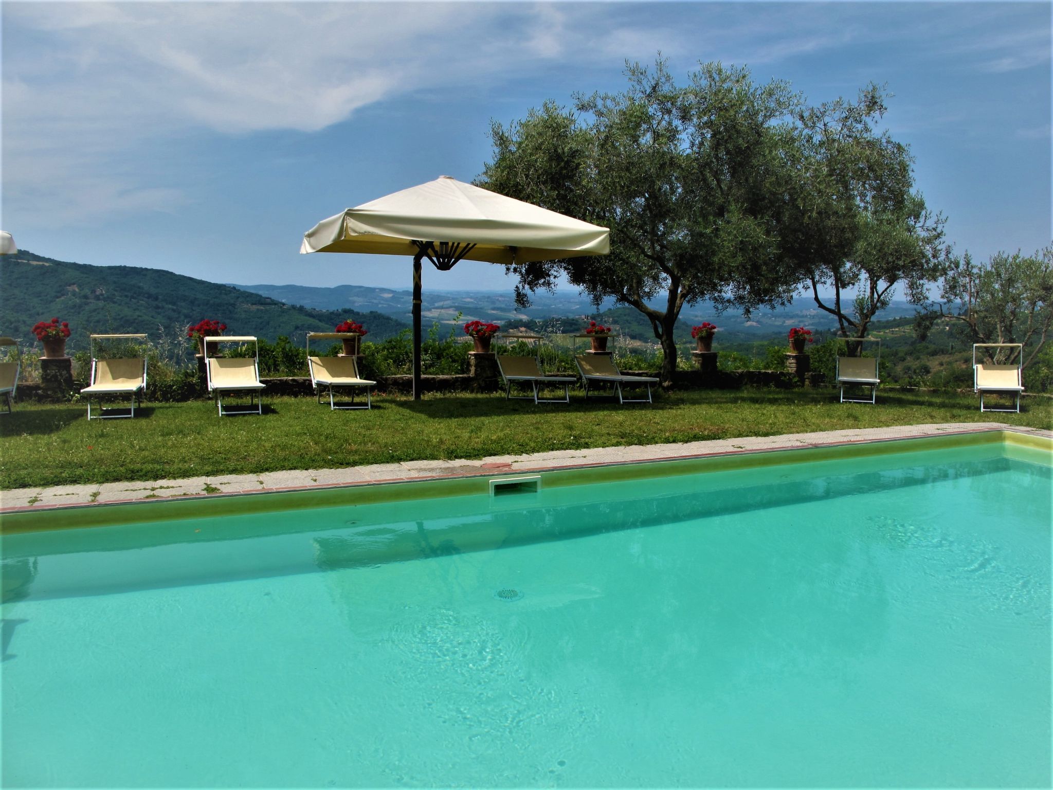 Alleinstehendes Herrenhaus "Panzalla", umgeben von Feldern und Weinbergen. 6 Wohnungen in der Residenz. Mietobjekt bestehend aus Haupt- und Nebengebäude, 4 km vom Zentrum von San Polo in Chianti, 16 km vom Zentrum von Impruneta, 31 km vom Zentrum von Firenze, alleinstehende, sonnige, erhöhte Lage, im Grünen. Zur Mitbenutzung: naturbelassenes Grundstück, Terrassengarten mit Bäumen, Wiese, Schwimmbad (10 x 5 m, saisonale Verfügbarkeit: 01.Mai.-01.Okt.). Aussendusche, Terrasse, Gartenmöbel, Grill. Im Hause: Empfang, Restaurant, Internetzugang, Wireless LAN, Waschmaschine (zur Mitbenutzung). 2 km lange holprige Zufahrt (Naturweg). Parkplatz auf dem Grundstück. Supermarkt 4 km, Restaurant 4 km, Bäckerei 4 km, Bushaltestelle "San Polo in Chianti" 4 km. Golfplatz 13 km. Nahe gelegene Sehenswürdigkeiten: Greve in Chianti 20 km, Radda in Chianti 38 km, San Gimignano 58 m, Siena 75 m, Arezzo 65 m. Bitte beachten: Fahrzeug empfohlen. Geeignet für Familien, Babyausstattung (inkl.). Es ist möglich einen Kochkurs zu buchen. Ab Hof Verkauf von bäuerlichen Produkten. Der Besitzer wohnt auf dem gleichen Grundstück. Eigentümer hat einen Hund. Alle Häuser/Wohnungen sind individuell eingerichtet.