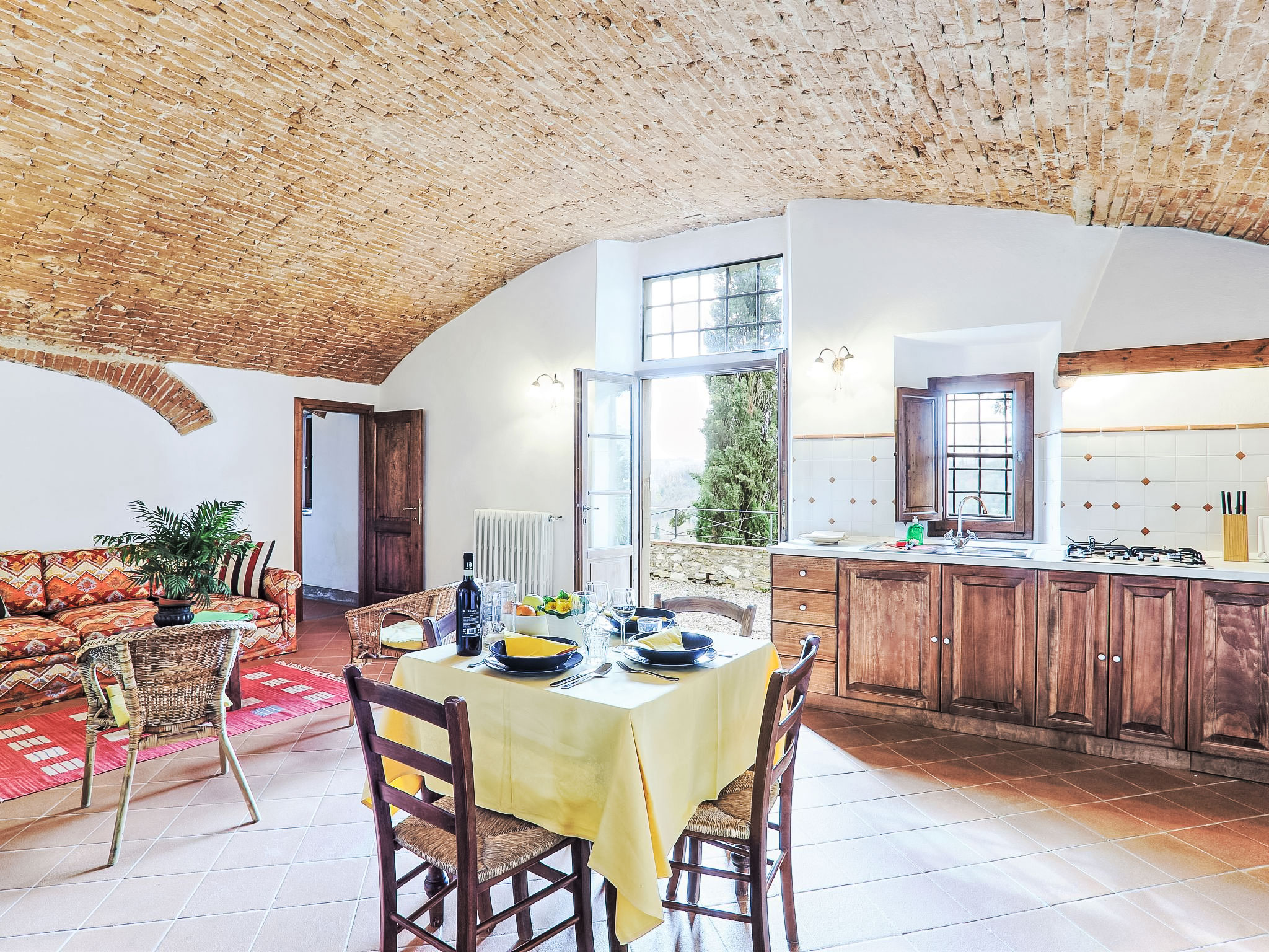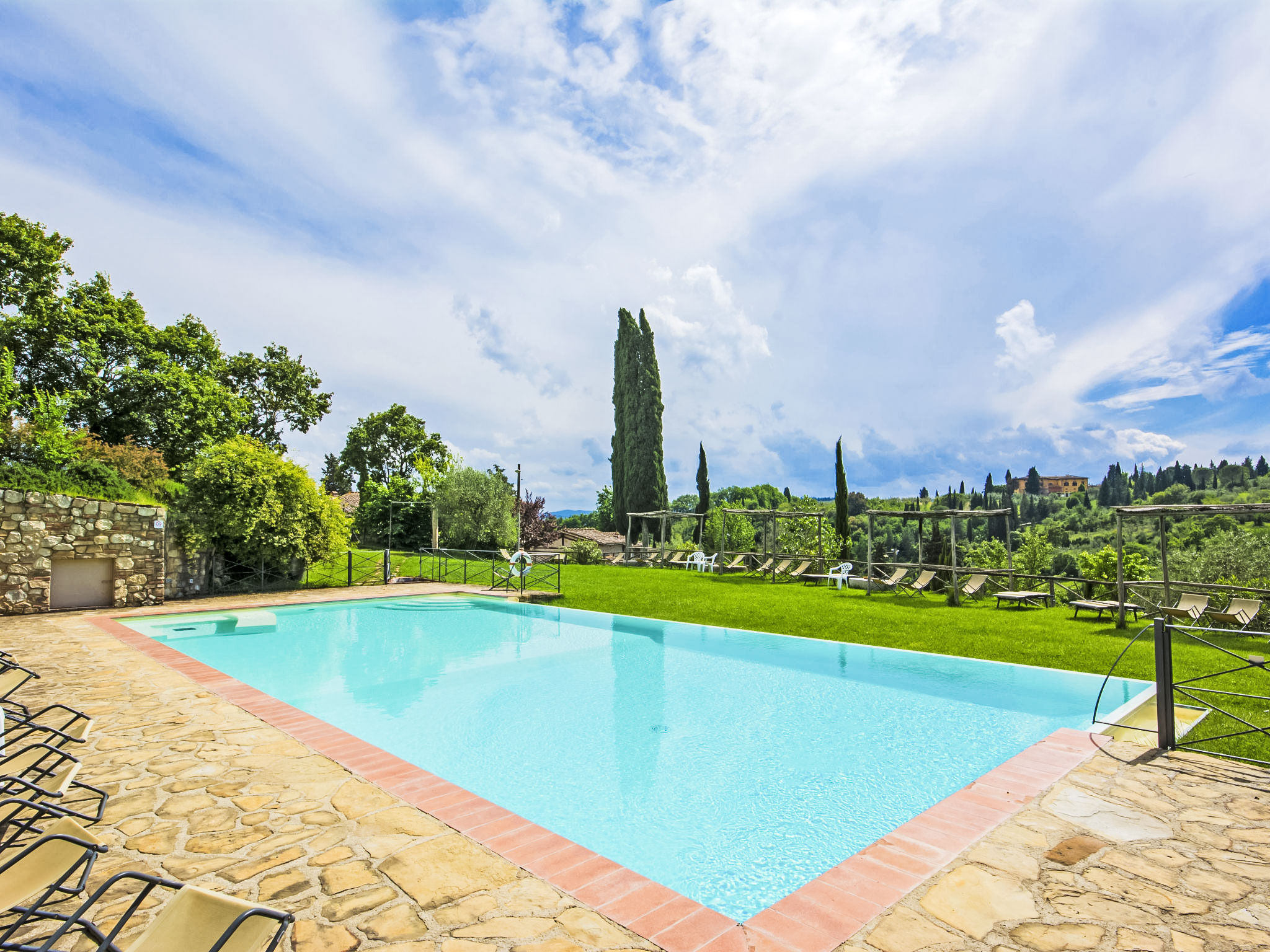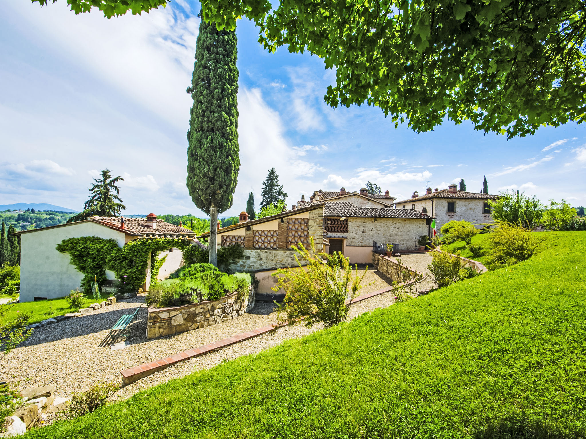 10 km von Firenze: Das Ferienlandgut Borgo Bottaia ist ein alter Weiler aus dem 17.Jh., an einem Hügel gelegen welcher Florenz umgibt. Das Anwesen liegt in einer von Olivenhainen, Rebbergen und Zypressen geprägten Landschaft. Das Haus wurde vollständig renoviert, wobei die ursprüngliche Bauweise des typischen Landhauses beibehalten wurde. Borgo Bottaia verfügt über 15 Wohnungen, alle mit einem sep. Eingang versehen und geschmackvoll eingerichtet. Grosser Privat-Parkplatz mit CCTV-Überwachungskameras. Das Landgut befindet sich in einem grossen Garten, ideal um sich zu entspannen und Spaziergänge zu unternehmen. Das herrliche Schwimmbecken mit Panoramasicht, Hydromassage und das Sonnendeck liegen nur wenige Meter von den Wohnungen entfernt. Feriensiedlung "Il Borgo", renoviert im Jahre 2009. 15 Wohnungen im Ferienhaus. 10 km vom Zentrum von Firenze, 19 km vom Zentrum von Greve in Chianti, 70 km vom Zentrum von Siena, erhöhte Lage auf einem Hügel, im Grünen. Zur Mitbenutzung: Garten (eingezäunt), Schwimmbad (14 x 7 m, 140 cm tief, saisonale Verfügbarkeit: 05.Mai.-29.Sep.). Aussendusche, Gartenmöbel, Kinderspielplatz. In der Anlage: Empfang, Wireless LAN, Waschmaschine (zur Mitbenutzung), Heizung vor Ort zu zahlen (01.11.-15.04.), Heizung nur verfügbar von 01.11. bis 15.04.. Zufahrt bis zum Haus (200 m Naturweg). Parkplatz beim Haus. Einkaufsgeschäft 1 km, Lebensmittelgeschäft 1 km, Supermarkt 1 km, Restaurant 1 km, Bar 1 km, Bushaltestelle "Grassina 31 - 32" 1 km, Sandstrand "Versilia" 120 km. Golfplatz (18 Loch) 4 km, Tennishalle 7 km. Nahe gelegene Sehenswürdigkeiten: Fiesole 14 km, San Casciano in Val di Pesa 20 km, Panzano 27 km, Outlet The Mall 30 km, Pisa 95 km.