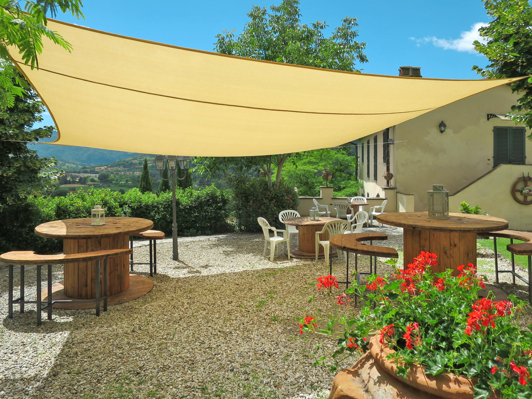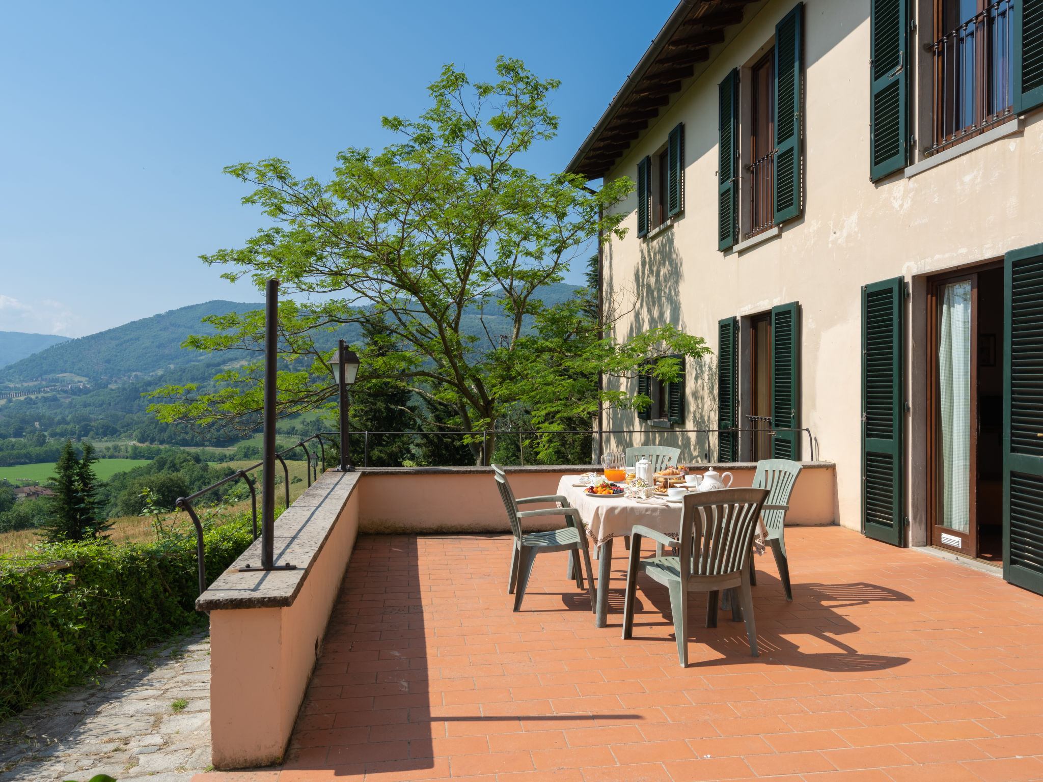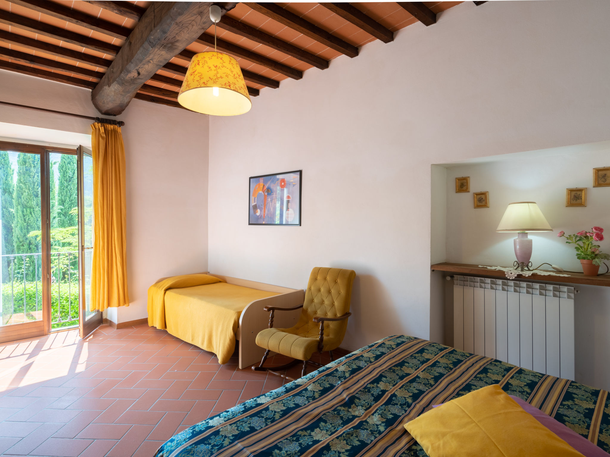 Rustikal, alleinstehend auf Weingut Landwirtschaftlicher Betrieb "Vigna La Corte", auf 2 Stockwerken, aus dem 16. Jahrhundert, umgeben von Bäumen, Wiesen und Feldern. 3 Häuser in der Residenz. 13 Wohnungen in der Residenz. 2 km vom Zentrum von Dicomano, 7.2 km vom Zentrum von Vicchio, 45 km vom Zentrum von Firenze, alleinstehende, erhöhte Lage am Hang. Zur Mitbenutzung: Grundstück 60 ha mit Pflanzen und Bäumen, Wiese, Schwimmbad (16 x 8 m, 140 cm tief, saisonale Verfügbarkeit: 01.Mai.-01.Okt.). Aussendusche, Tischtennis, Laube, Terrasse, Gartenmöbel, Grill. In der Anlage: Empfang, Wireless LAN, Tischfussball, Waschmaschine (zur Mitbenutzung). Zur Verfügung: Fahrräder. Zufahrt (500 m Naturweg). Parkplatz (überdacht) auf dem Grundstück. Supermarkt 2 km, Restaurant 2 km, Bahnstation "Dicomano" 2 km. Auf dem Grundstück Tierhaltung. Ab Hof Verkauf von bäuerlichen Produkten. Bitte beachten: Eisenbahnlinie 1 km vom Haus.