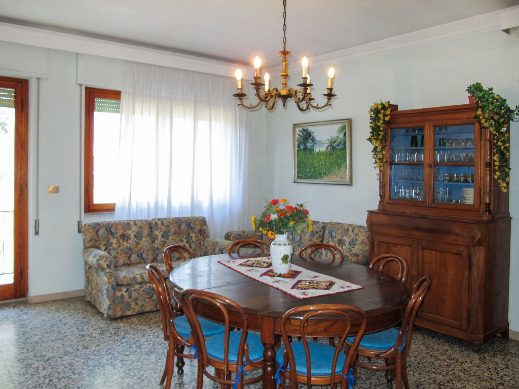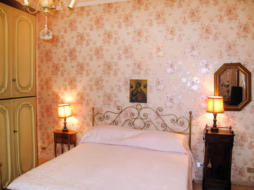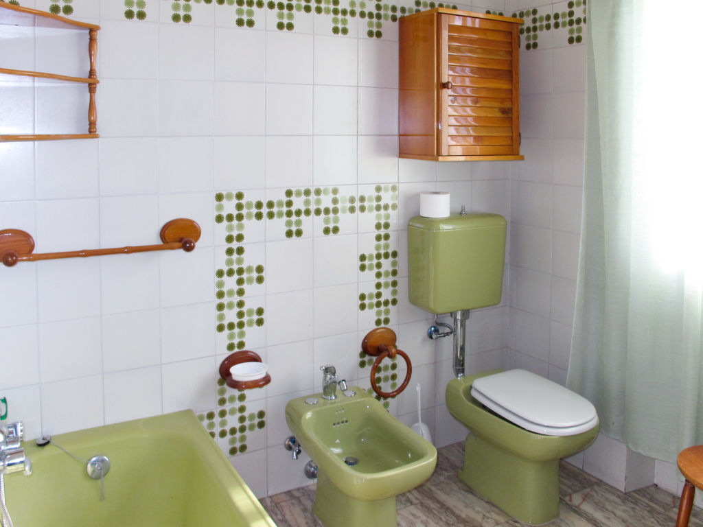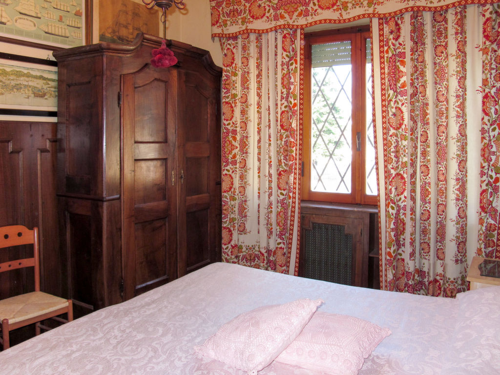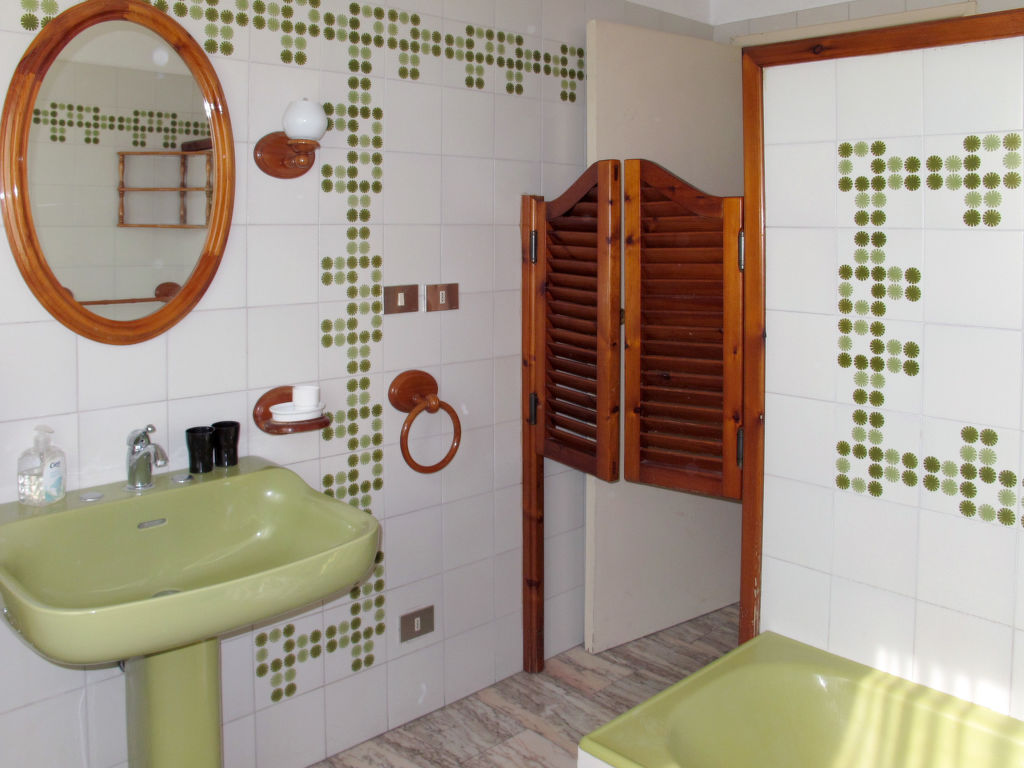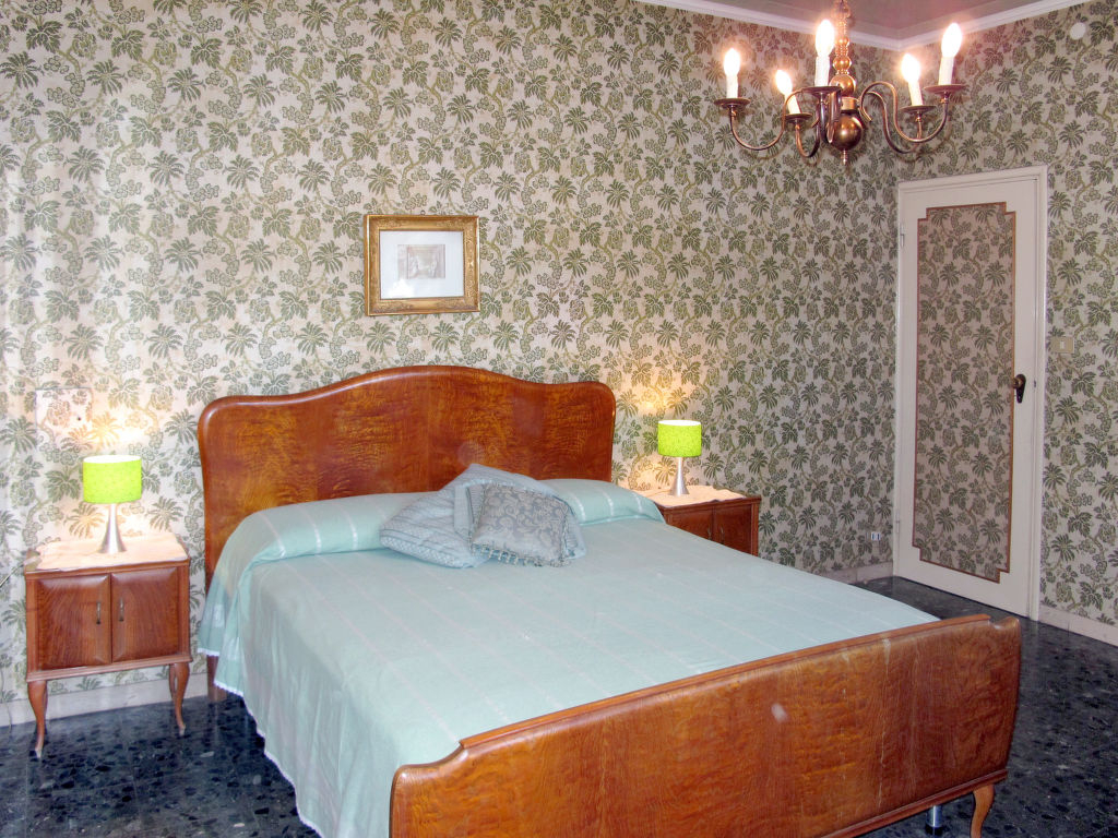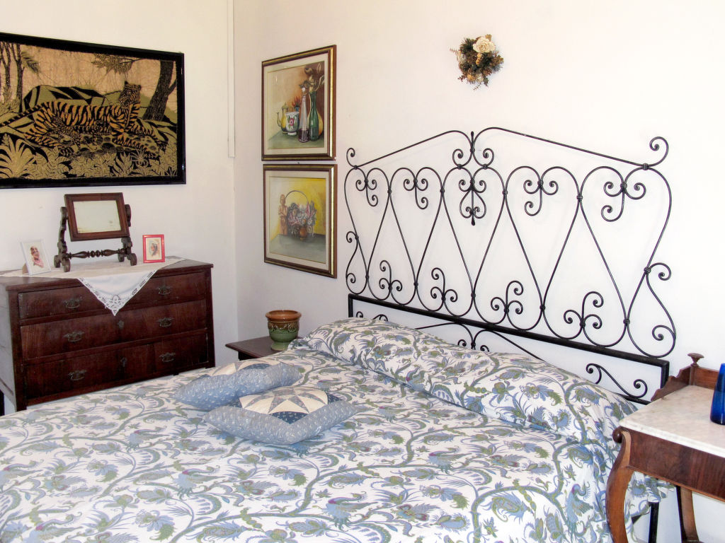 7-Zimmer-Haus 265 m2 auf 2 Stockwerken, im erhöhten Erdgeschoss. Einfach und antik eingerichtet: Wohnzimmer mit Sat-TV. Ausgang zum Balkon. 1 Zimmer mit 2 Betten (80 cm). 1 Zimmer mit 1 franz. Bett (160 cm). 1 Doppelzimmer. Grosse Küche (Backofen, Geschirrspüler, 4 Flammen, Toaster, Tiefkühler, elektrische Kaffeemaschine) mit Esstisch, Sat-TV. Dusche/Bidet/WC. Obergeschoss: 1 Zimmer mit 1 franz. Bett (160 cm). 1 Doppelzimmer. Ausgang zum Balkon. Esszimmer mit Esstisch. Ausgang zum Garten. Wohnzimmer mit Sat-TV. Küche (Backofen, Geschirrspüler, 4 Flammen, Tiefkühler, elektrische Kaffeemaschine). 2 Bäder/Bidet/WC. G-Heizung. Teppichboden. 2 kleine Balkone, Gartensitzplatz. Terrassenmöbel, Gartengrill (mobil), Liegestühle (4). Zur Verfügung: Waschmaschine, Bügeleisen, Kinderhochstuhl. Bitte beachten: Nichtraucher-Unterkunft.