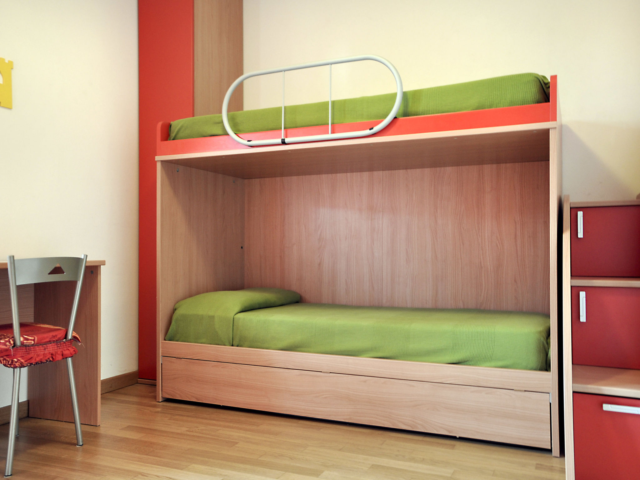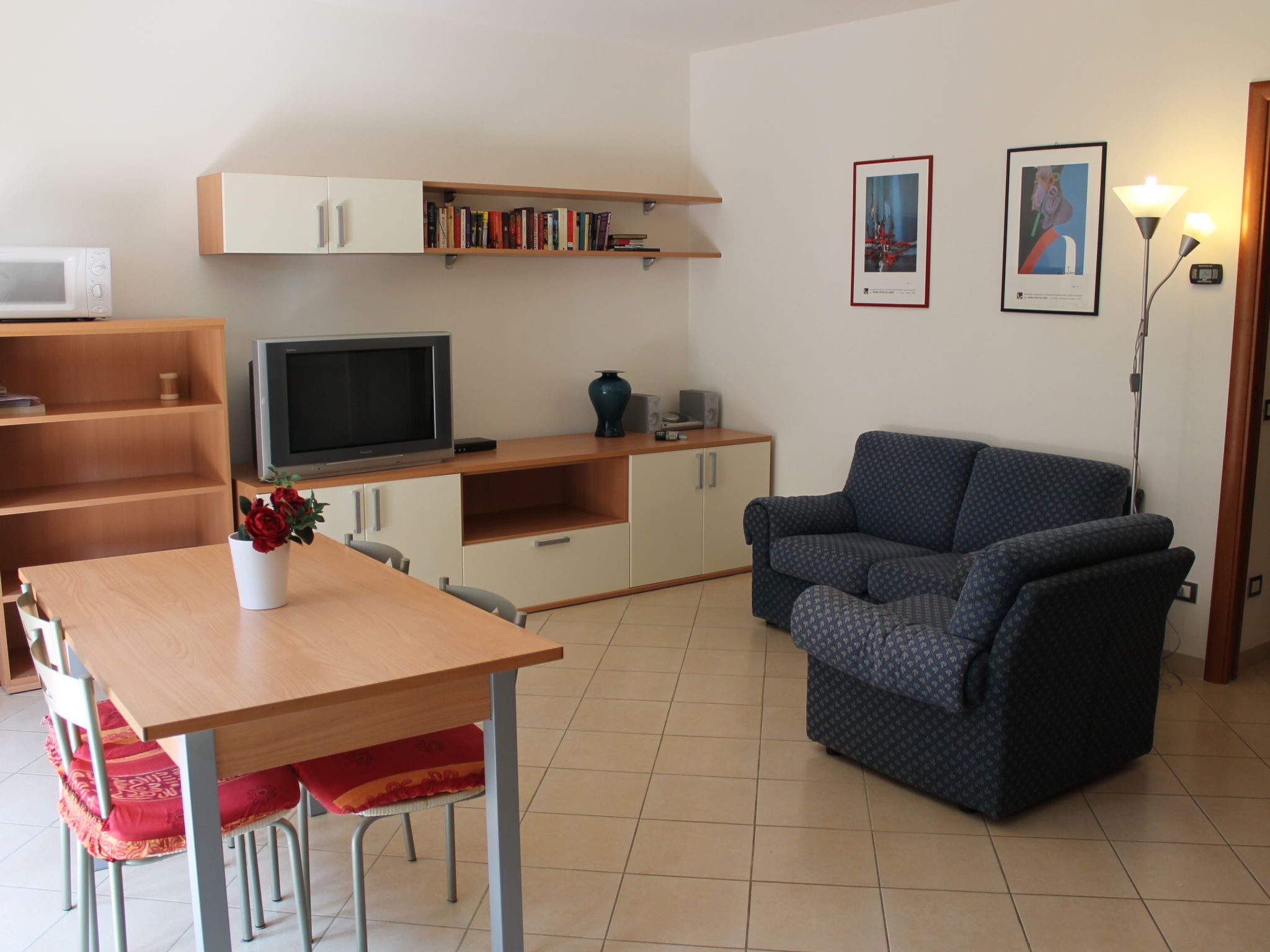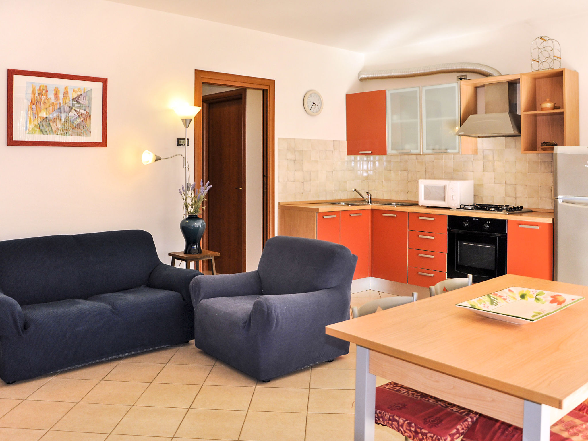 3-Zimmer-Wohnung, Erdgeschoss, ca. 55 m². Wohnraum mit Sitzcouch, Essplatz, Küchenzeile (4 Flammen, Backofen, Kühl-/Gefrierkombination). Doppelzimmer. Schlafzimmer mit Etagenbett und Ausziehbett. Dusche/WC. CIR:M0230530572