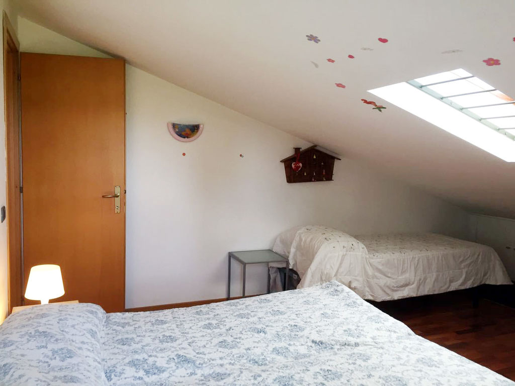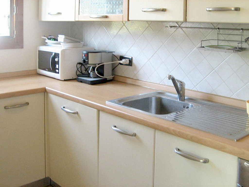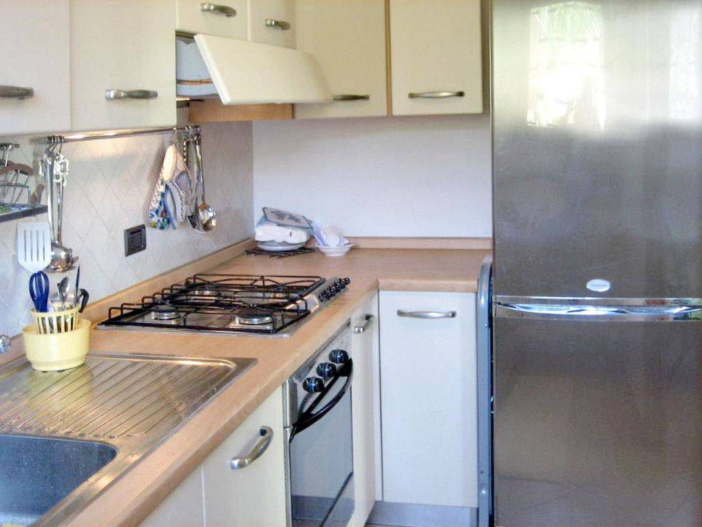5-Zimmer-Reihenhaus, 3 Etagen, ca. 130 m². Untergeschoss: Wohnraum mit Sitzgruppe und Kamin. Doppelzimmer. Bad/WC. Erdgeschoss: Wohnraum mit Essplatz und Terrassenausgang. Küche (4 Flammen, Backofen, Mikrowelle, Kühlschrank, Gefrierschrank, Geschirrspüler). Sep.WC. 1. Etage (Dachschräge, eingeschränkte Stehhöhe): Doppelzimmer. Zweibettzimmer. Dusche/WC.