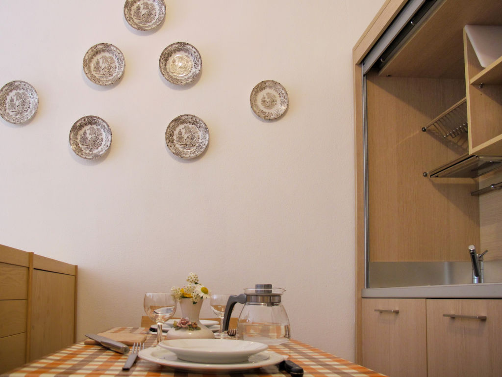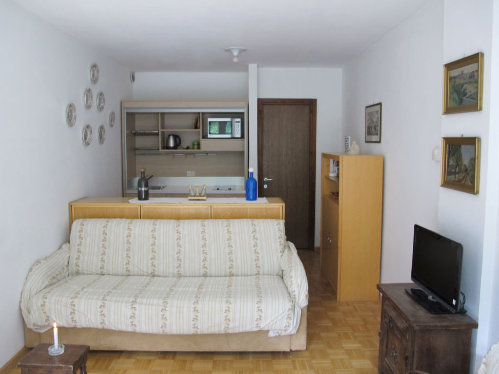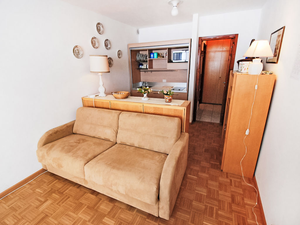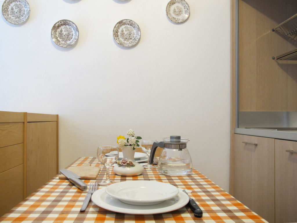 1-Zimmer-Wohnung 30 m2, im erhöhten Erdgeschoss. Einfach und zweckmässig eingerichtet: Wohn-/Schlafzimmer mit 1 Doppeldiwanbett und 1 x 2 Etagenbetten, TV (Flachbildschirm). Kochnische (2 Kochplatten, Geschirrspüler, Mikrowelle) mit kleinem Esstisch. Dusche/Bidet/WC. Heizung nur verfügbar von 01.12. bis 01.05. Abstellkammer. Sicht auf die Berge und das Tal. Bitte beachten: Nichtraucher-Unterkunft. 1 Haustier/Hund erlaubt. 022113-AT-783806
