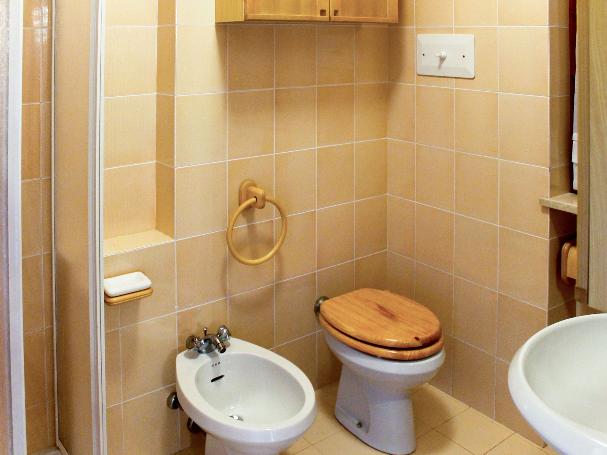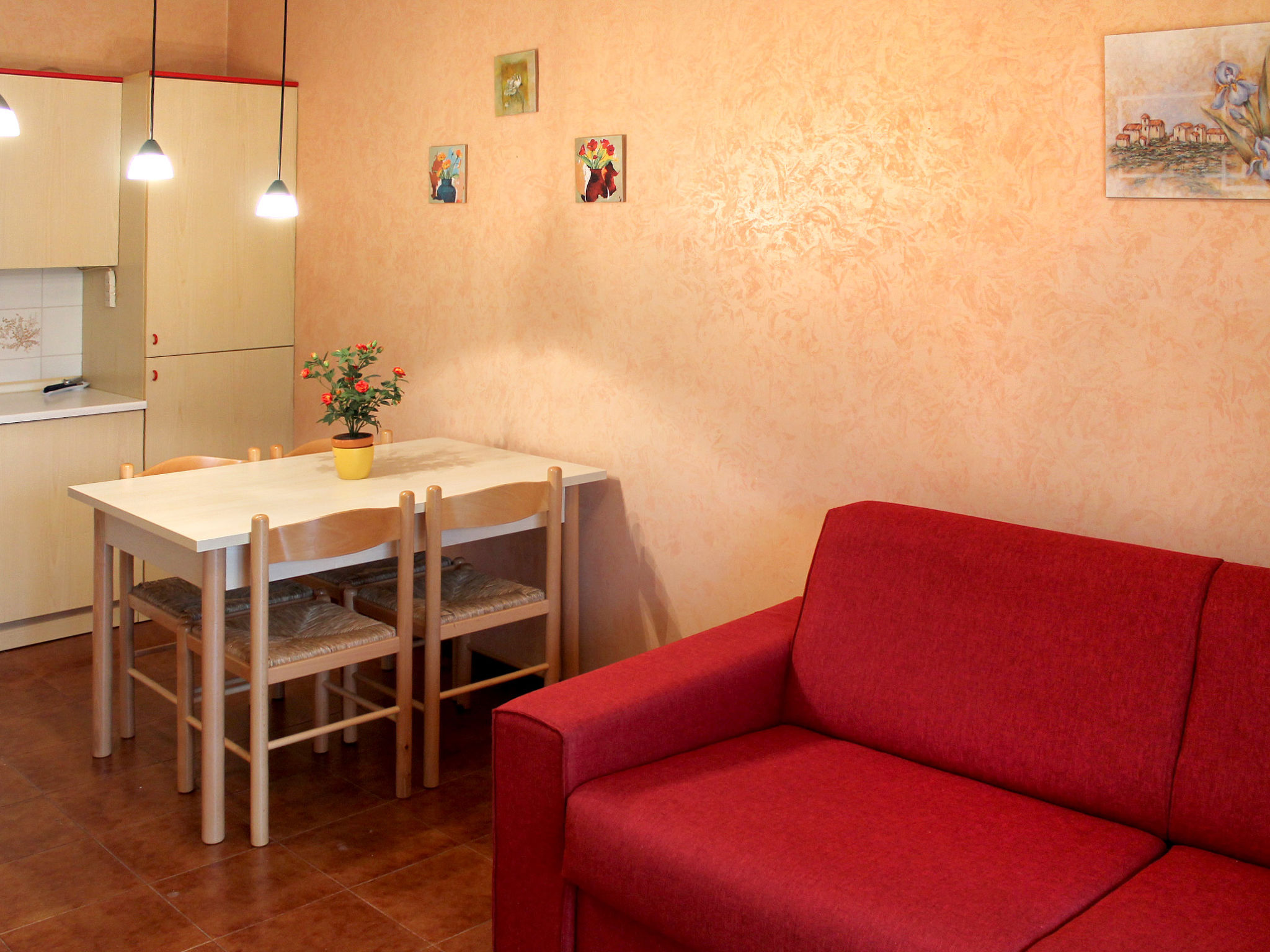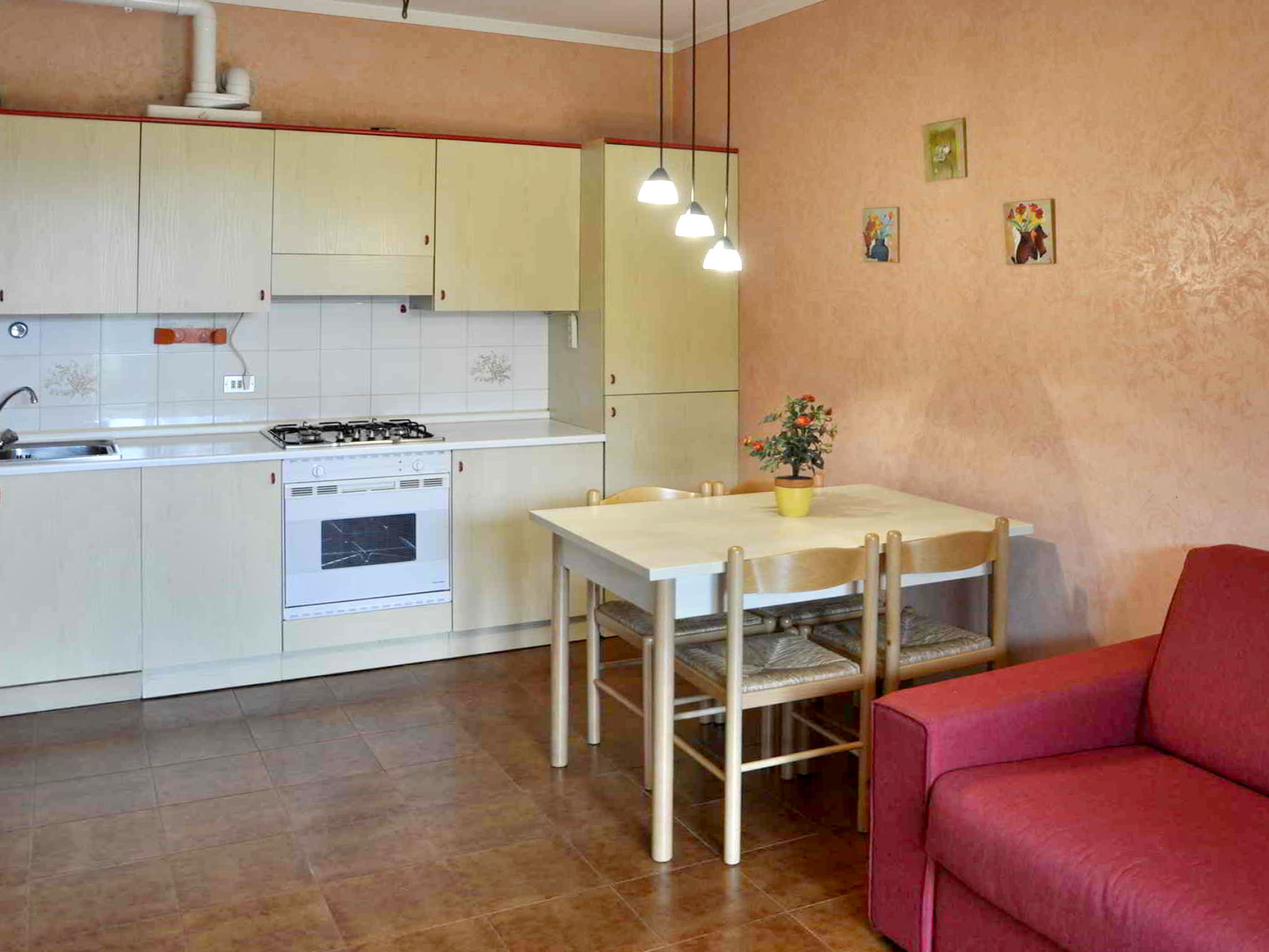 2-Zimmer-Wohnung, Erdgeschoss, ca. 40 m². Wohn-/Schlafraum mit Doppelbettcouch, Essplatz, Küchenzeile (4 Flammen, Backofen, Kühlschrank), Terrassenausgang. Schlafzimmer mit Doppelbettcouch. Dusche/WC. CIR: M0230430568
