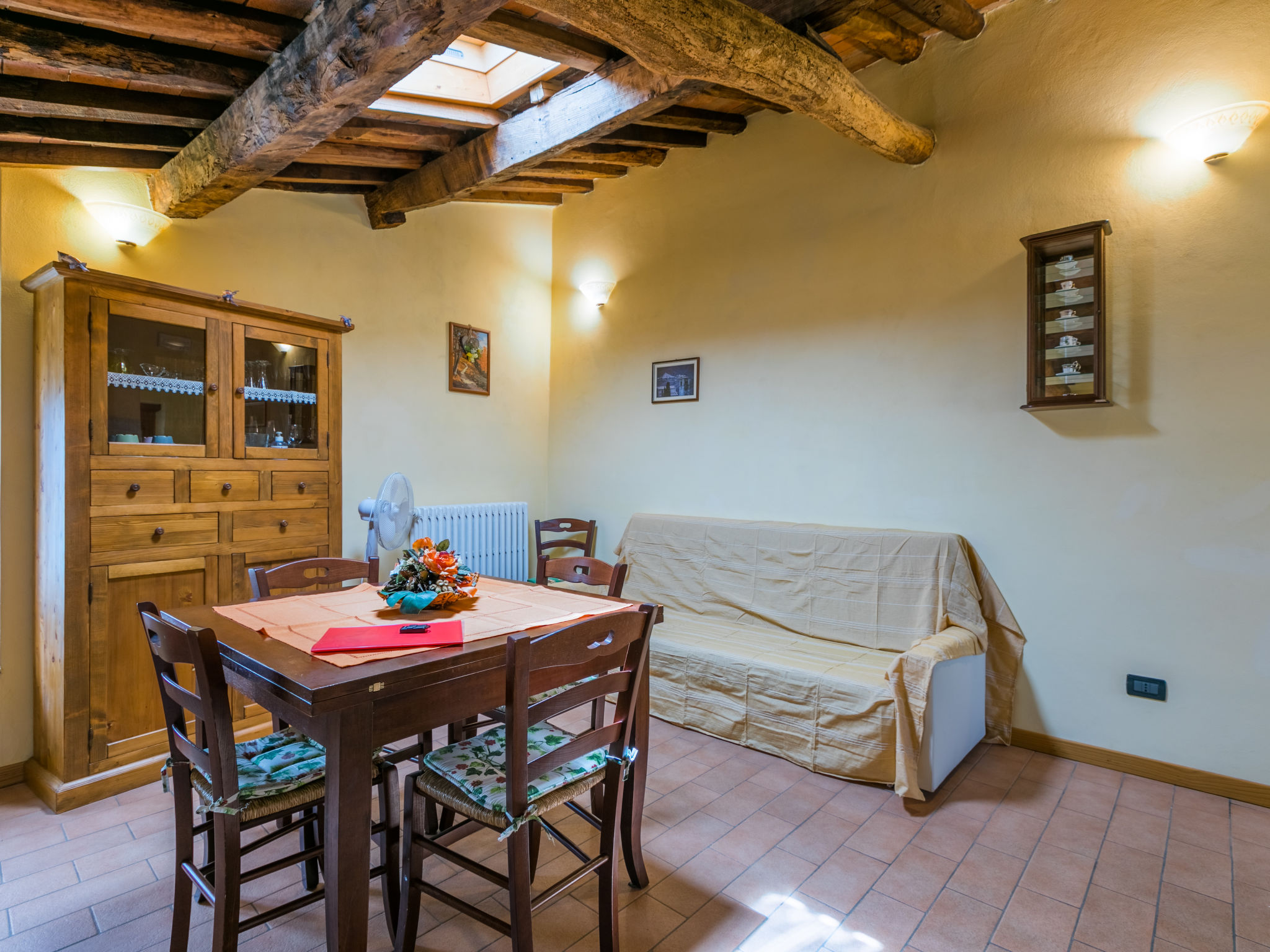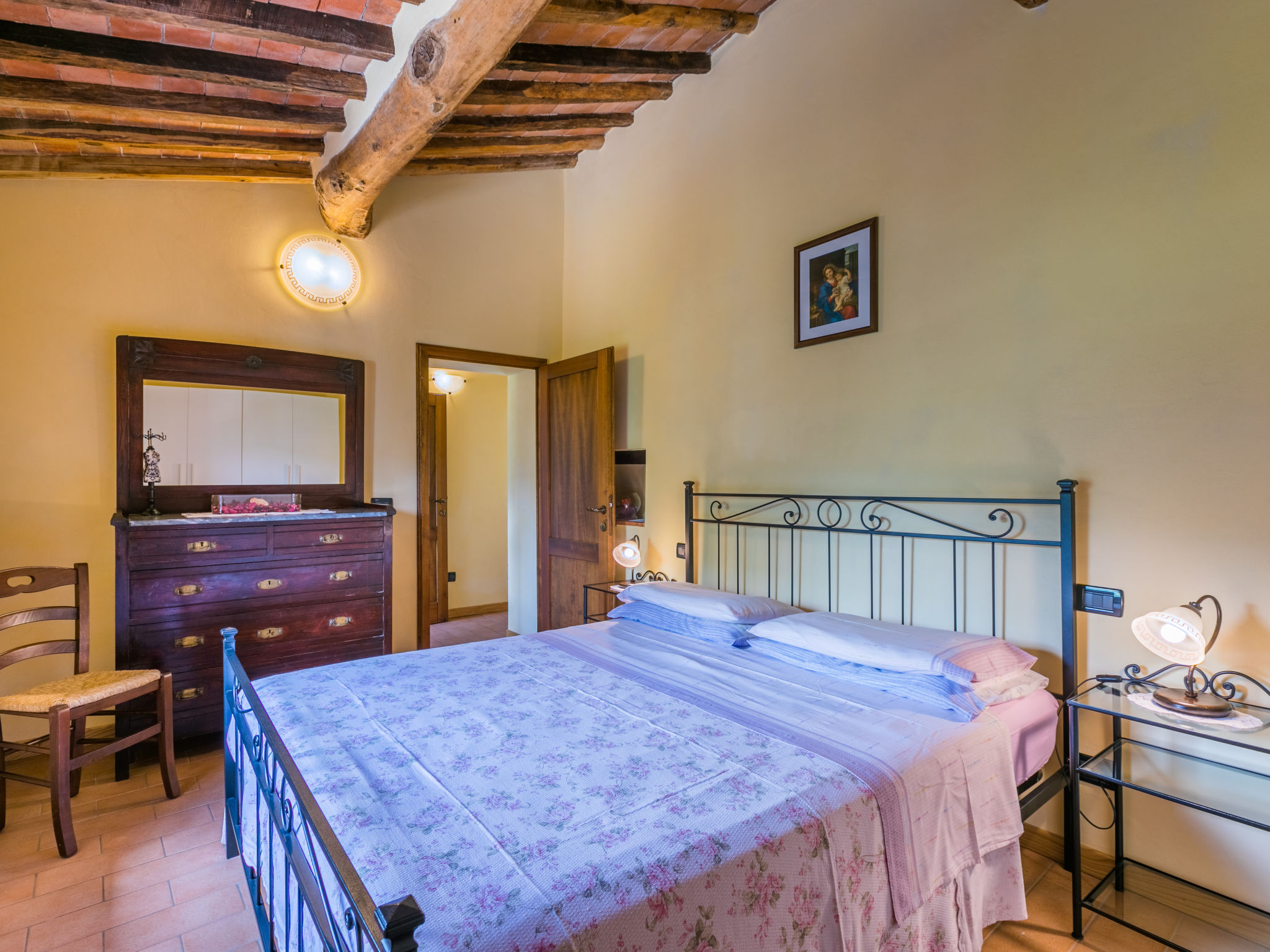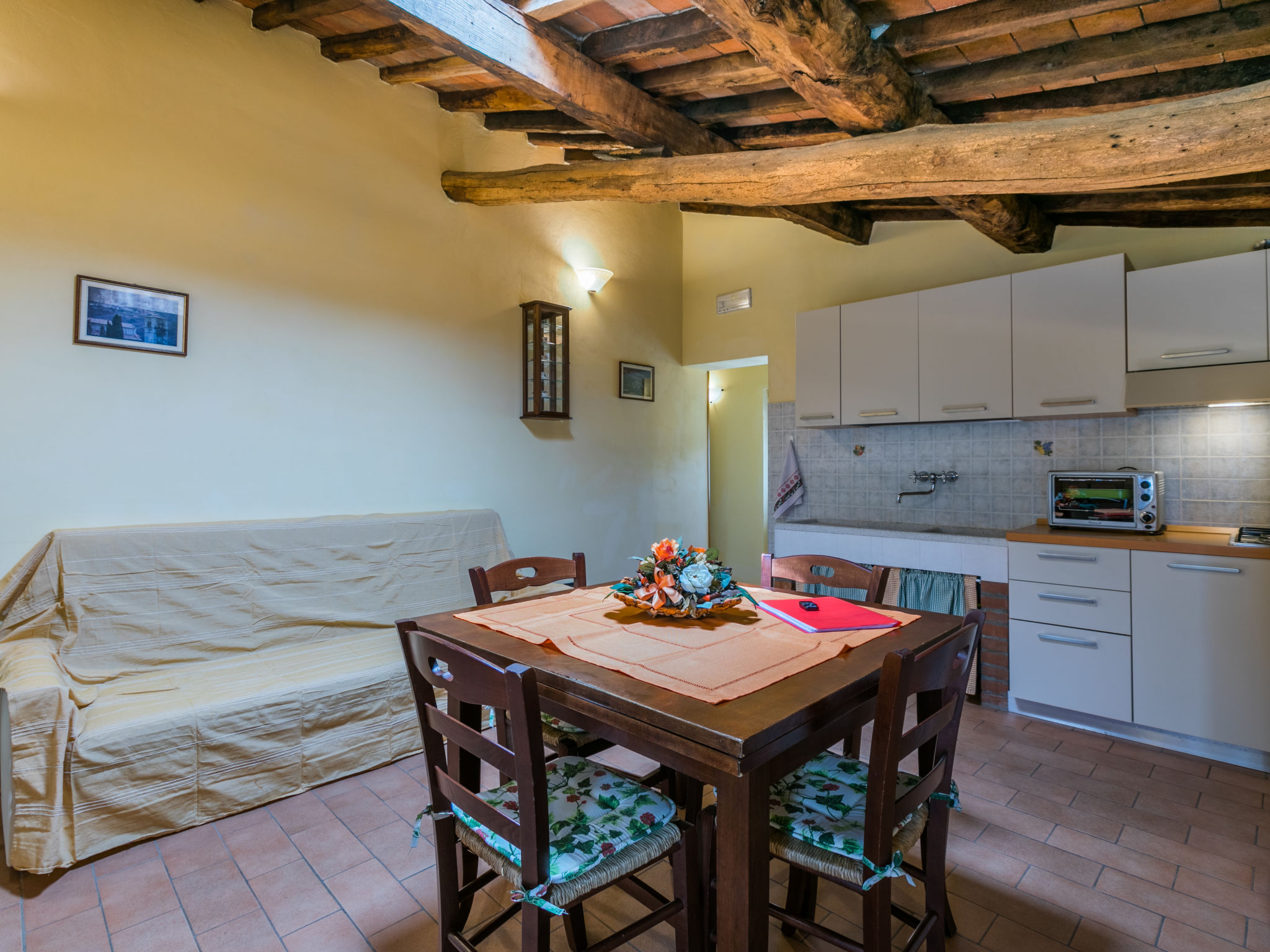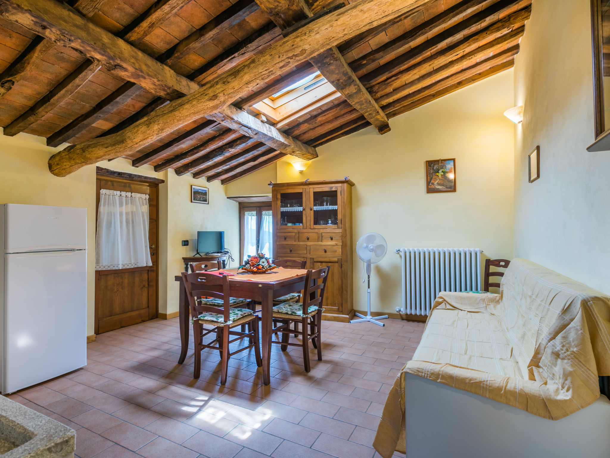 "Poggetto Pellegrini", 3-Zimmer-Wohnung 57 m2 im 1. Stock. Objekt geeignet für 3 Erwachsene + 1 Kind. Schön und rustikal eingerichtet: Wohn-/Esszimmer mit Esstisch und Sat-TV. 1 Zimmer mit 1 franz. Bett (160 cm). 1 abgeschrägtes Zimmer mit 2 Betten. Offene Küche (Mini-Backofen, 4 Flammen, Tiefkühler, elektrische Kaffeemaschine). Dusche/WC. Heizung. Terrasse. Terrassenmöbel, Gartengrill, Liegestühle. Panoramasicht. Zur Verfügung: Bügeleisen, Fliegengitter. Internet (Wireless LAN, gratis). Bitte beachten: Nichtraucher-Unterkunft. Eigener Eingang.
