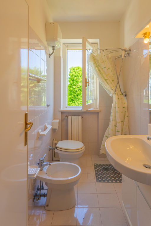 6-Zimmer-Haus, 3 Etagen (Hanglage), ca. 200 m². Zugang über Außentreppe in Hochparterre: Wohnraum mit Sitzcouch und Kamin, offenes Esszimmer. Küche (4 Flammen, Backofen, Geschirrspüler, Kühl-/Gefrierkombination, Kaffeemaschine), Terrassenausgang. Dusche/WC. Vom Esszimmer Treppe ins Obergeschoss: 2 Doppelzimmer. Zweibettzimmer. Bad/Dusche/WC. Vom Esszimmer Treppe ins Tiefparterre (hochgelegenes Fenster): Wohnraum mit Sitzgruppe, Kamin, Essplatz, Küchenzeile (4 Flammen, Backofen, Kühlschrank).
