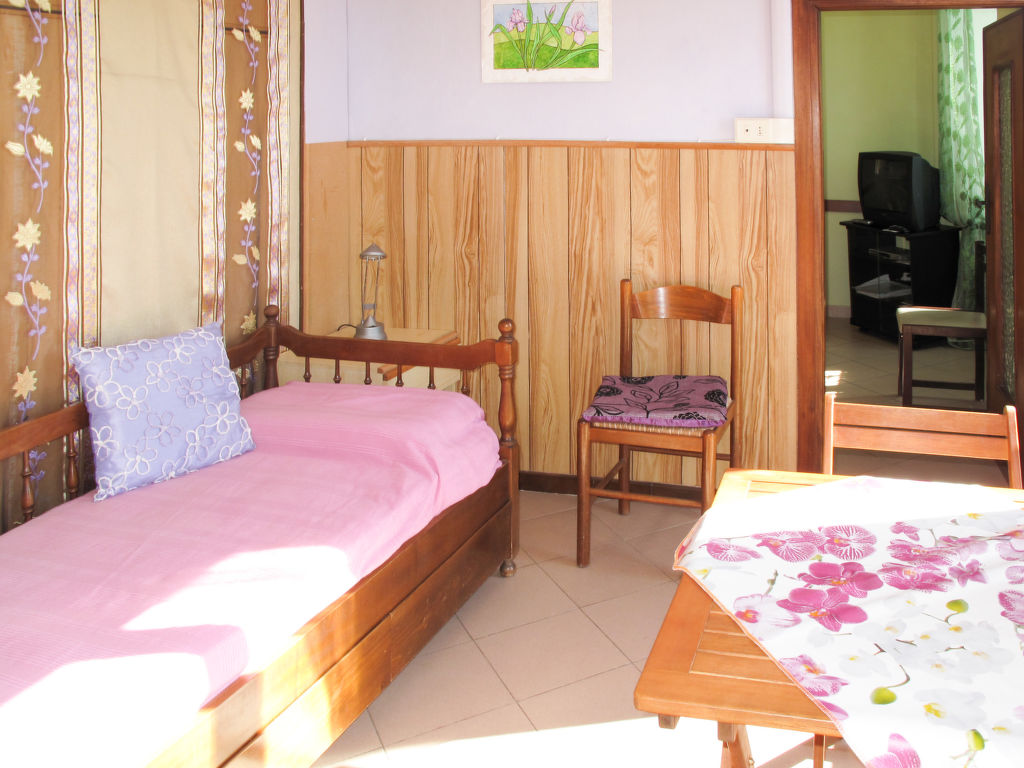 3-Zimmer-Wohnung, 1. Etage, ca. 70 m². Von der Hangseite ebenerdiger Eingang. Wohn-/Schlafraum mit Einzelbett (0,80 m breit), Essplatz für 2 Personen und Balkonausgang. Küche (4 Flammen, Backofen, Mikrowelle, Kühl-/Gefrierkombination, Kaffeemaschine, Wasserkocher, Toaster) mit Essplatz. Schlafzimmer mit franz. Bett (1,60 m breit). Zweibettzimmer (Betten 0,80 m breit). Dusche/Bidet/WC. CITRA: 008021-LT-0048