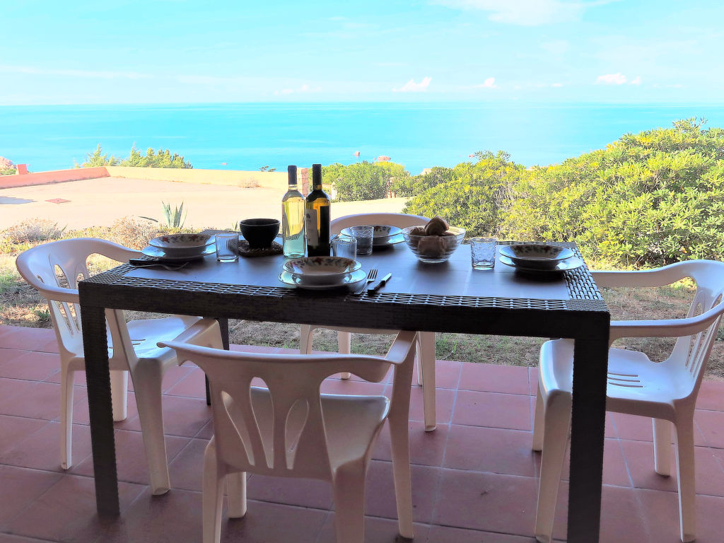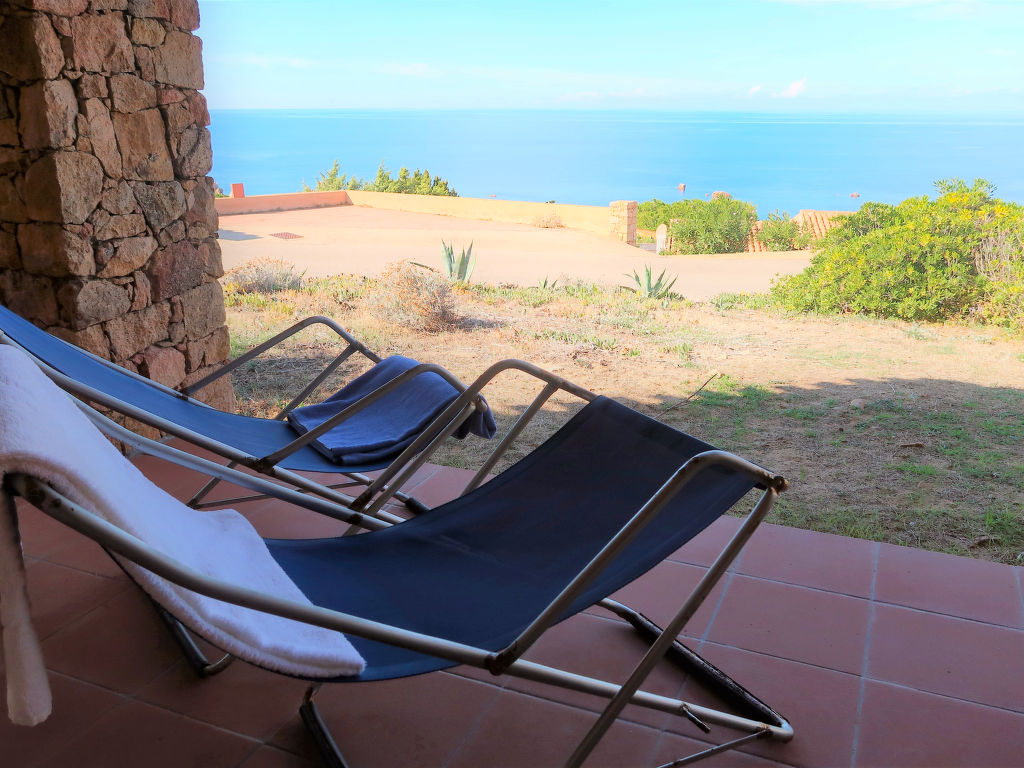 3-Zimmer-Reihenhaus 70 m2, im Erdgeschoss. Einfach eingerichtet: Wohn-/Schlafzimmer mit 1 Doppeldiwanbett (1 x 140 cm), TV. 1 Doppelzimmer. 1 Zimmer mit 2 Betten. Kochnische (4 Kochplatten, Backofen, Tiefkühler). Dusche/WC. Terrasse überdacht. Terrassenmöbel. Sicht auf das Meer. Zur Verfügung: Waschmaschine. Parkplatz. 1 Haustier/Hund erlaubt.