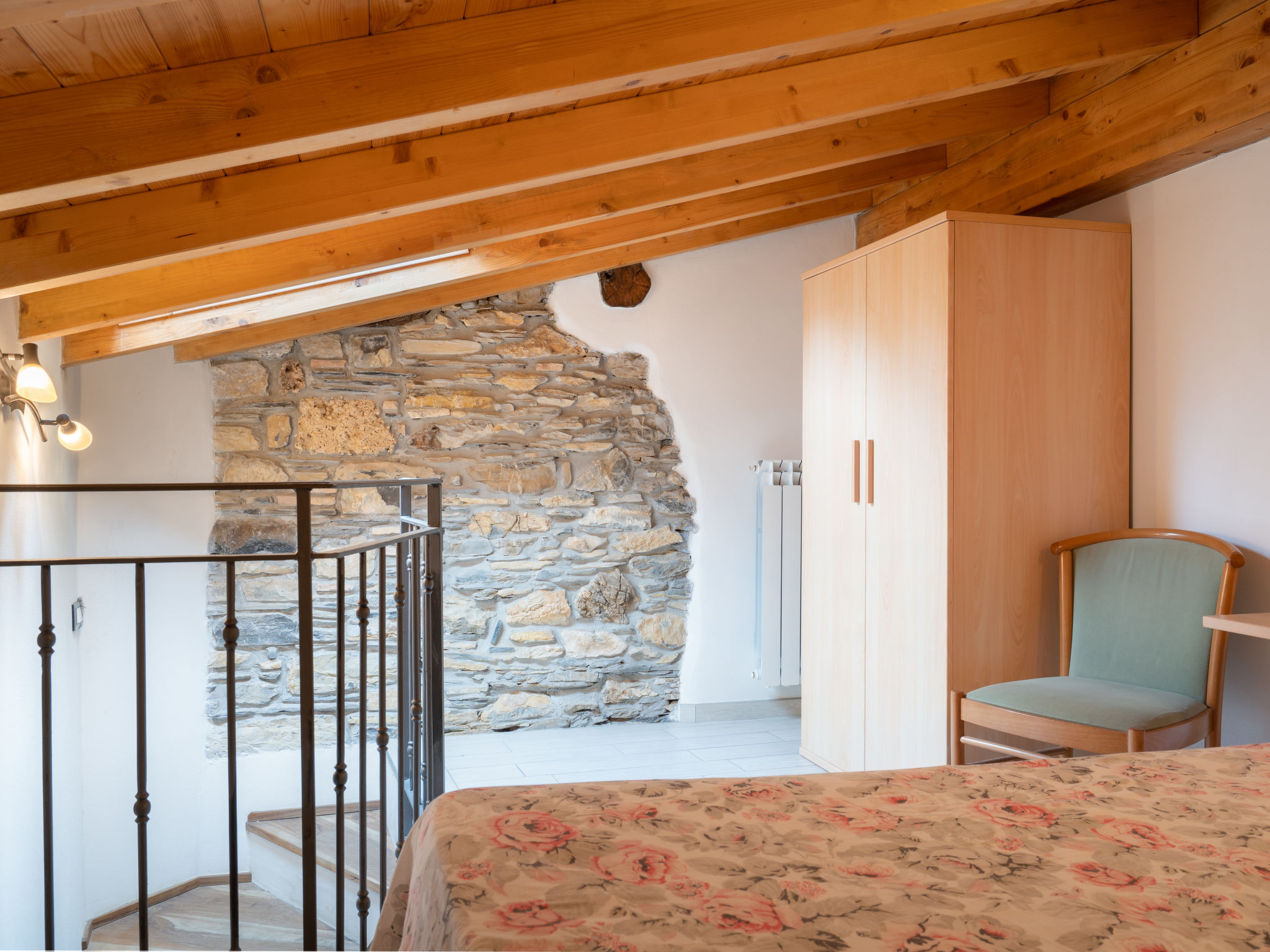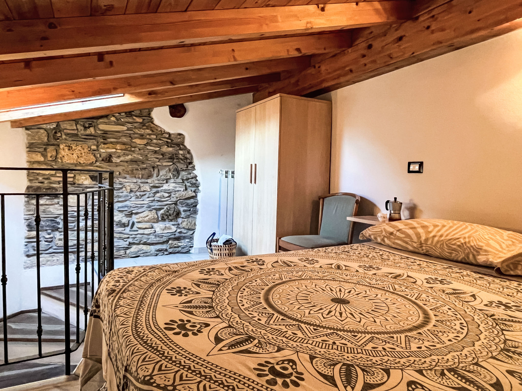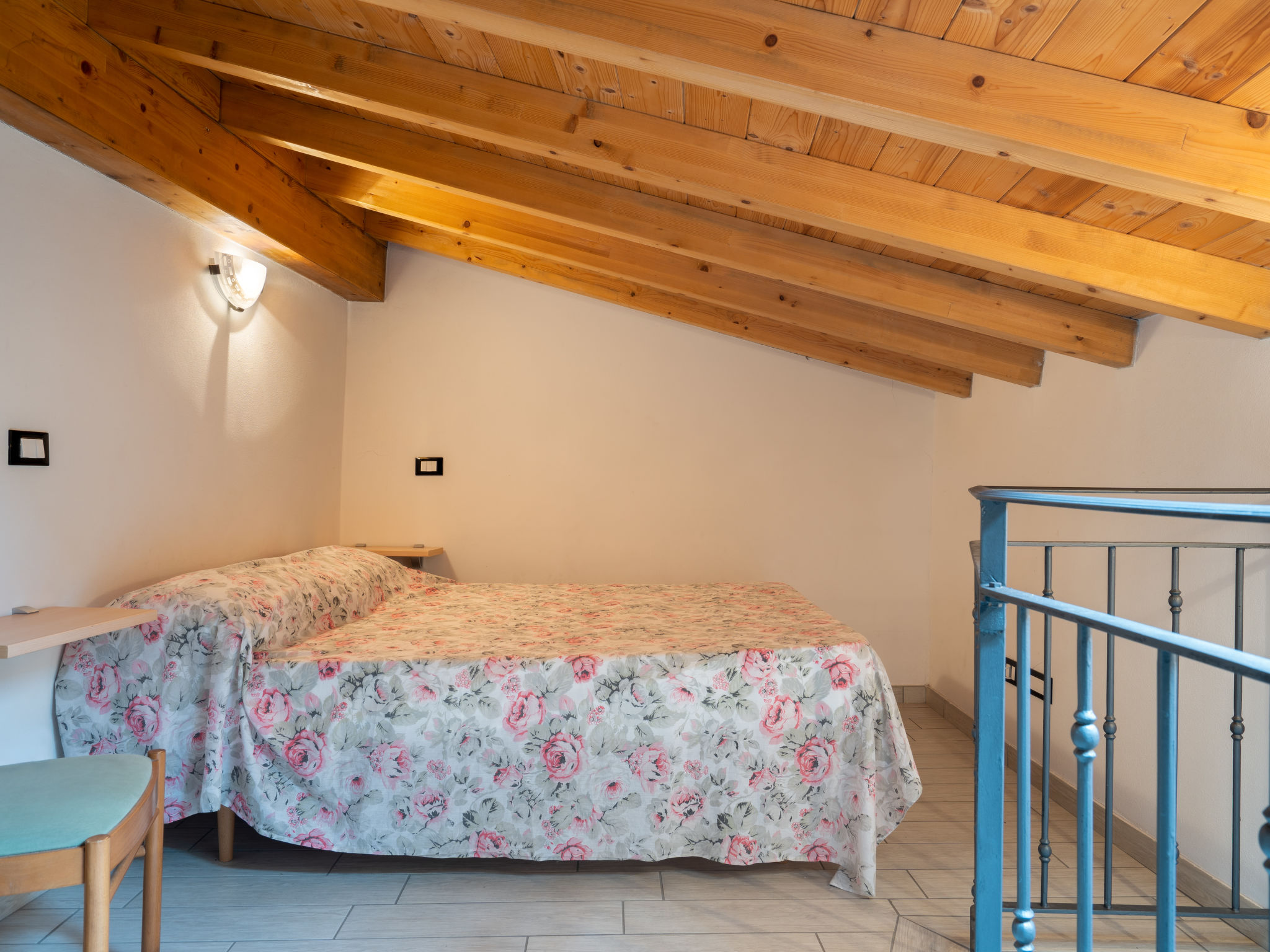 2-Zimmer-Hausteil, 2 Etagen, ca. 35 m². Separater Zugang über Außentreppe. Wohn-/Schlafraum mit Doppelbettcouch (1,60 m breit), Essplatz für 8 Personen und Küchenzeile (4 Flammen, Backofen, Kühl-/Gefrierkombination, Kaffeemaschine, Wasserkocher, Toaster), Ausgang ins Freie. Dusche/WC. Vom Wohnraum Treppe zum Dachgeschoss (Dachschräge, eingeschränkte Stehhöhe) direkt in Schlafzimmer mit franz. Bett (1,60 m breit, Zimmer nicht durch Tür abgeschlossen). CITR: 008047-AGR-0003