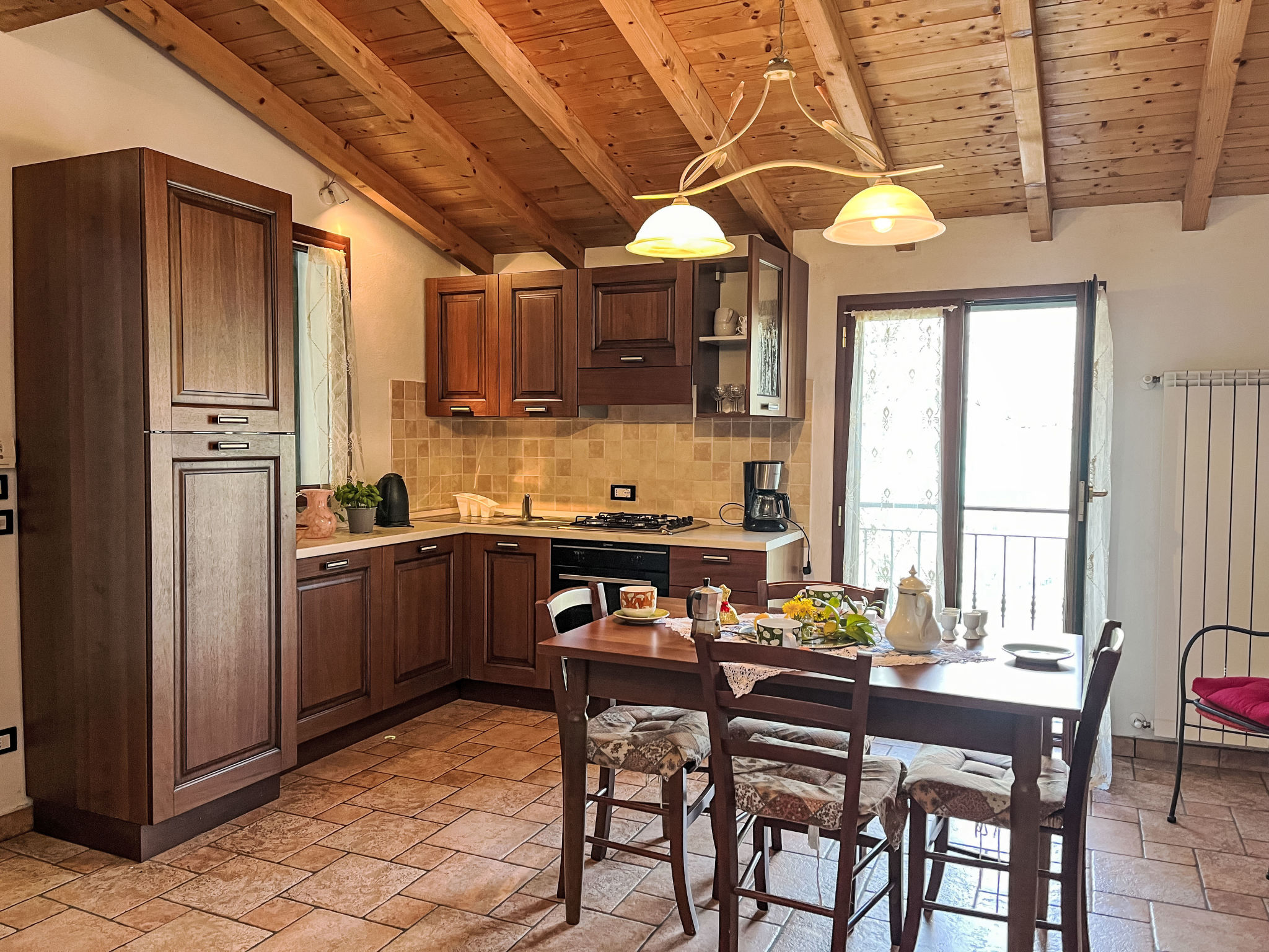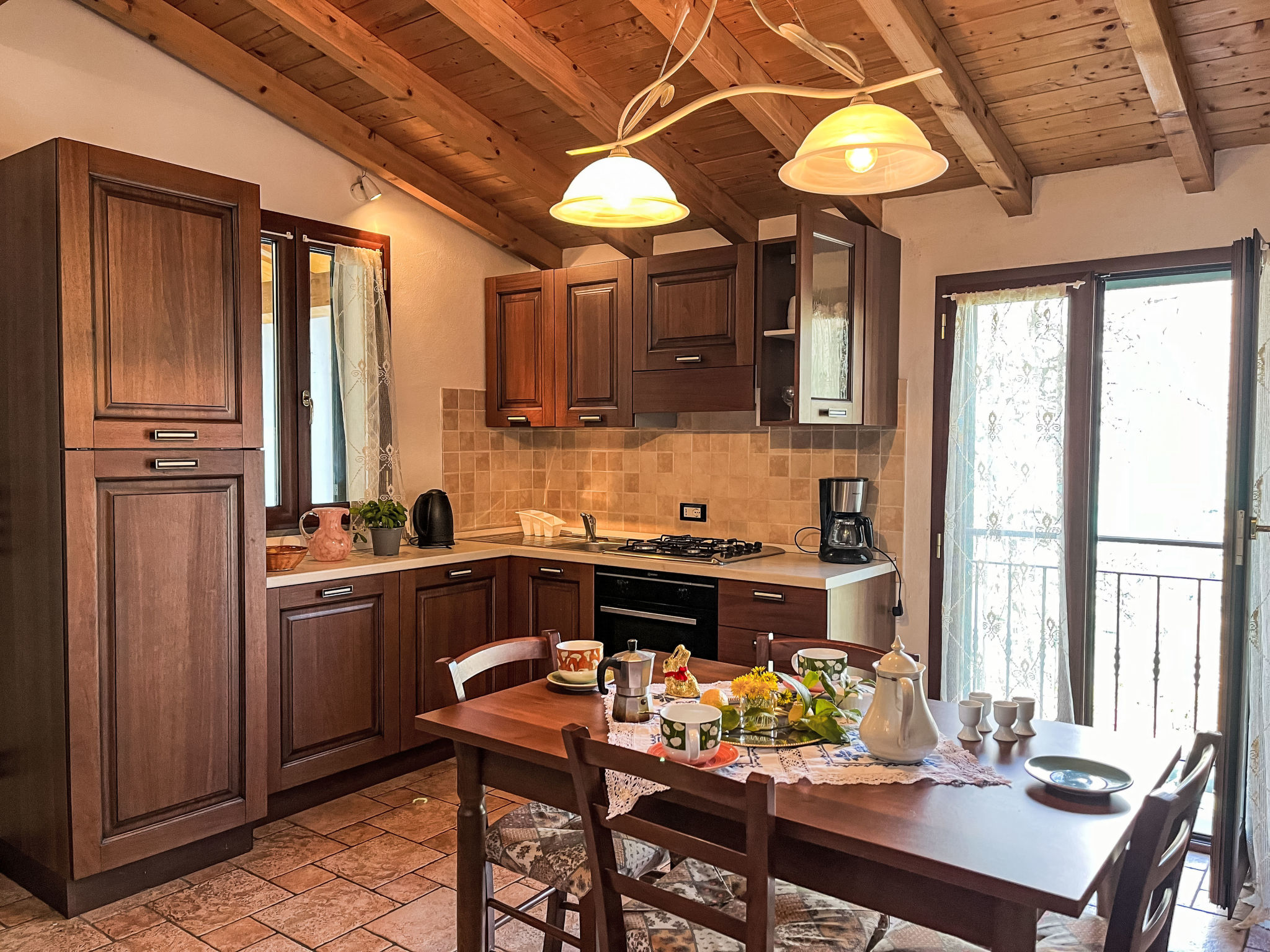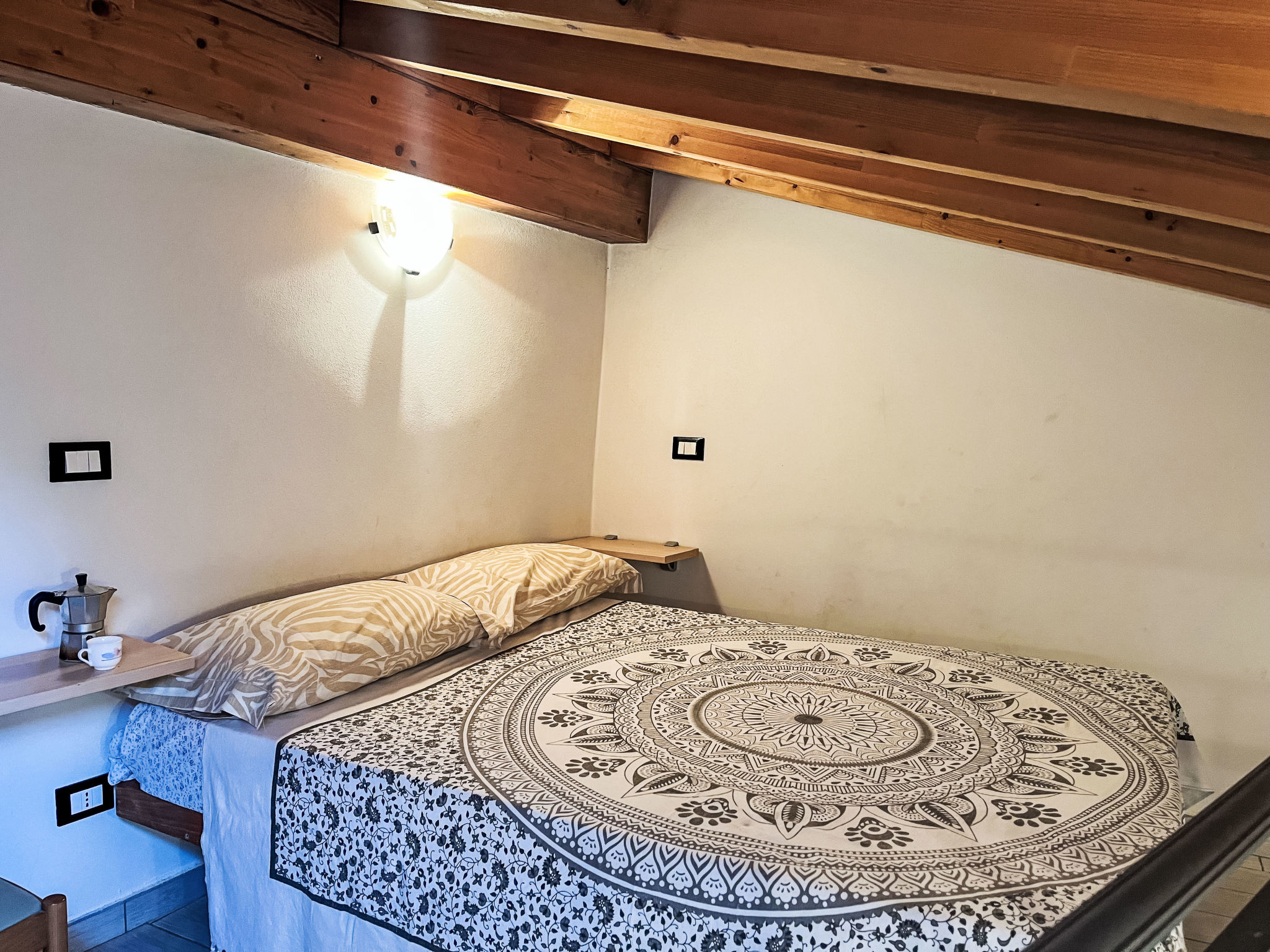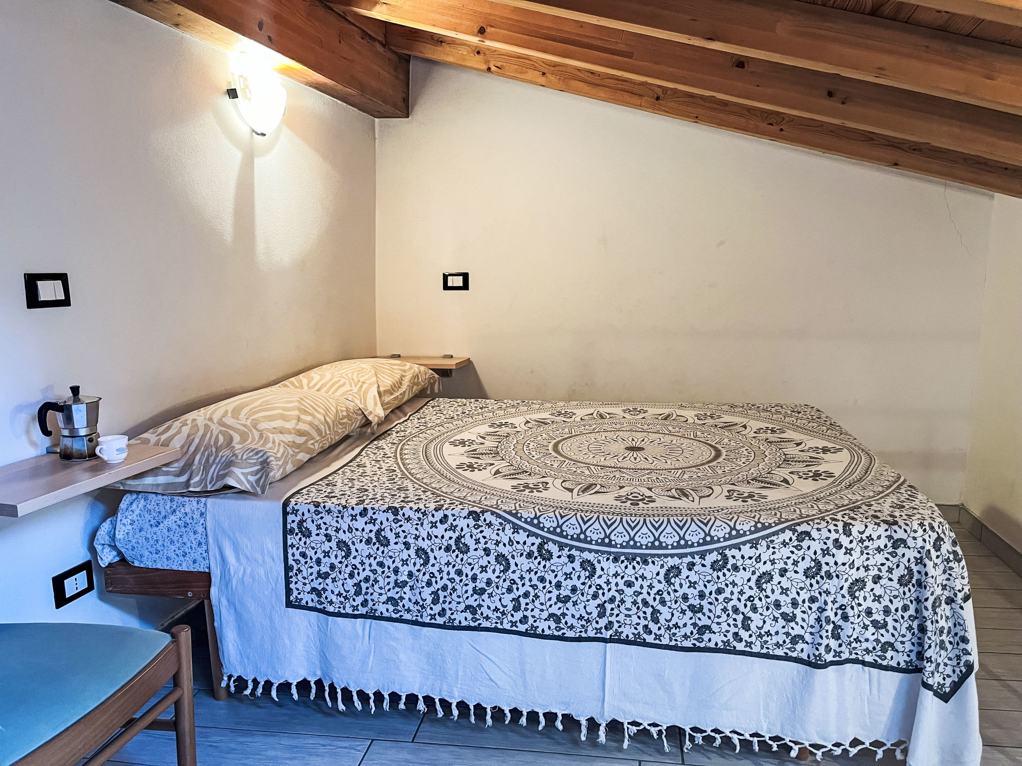 2-Zimmer-Hausteil, 2 Etagen, ca. 35 m². Separater Zugang über Außentreppe. Wohn-/Schlafraum mit Doppelbettcouch (1,60 m breit), Essplatz für 8 Personen und Küchenzeile (4 Flammen, Backofen, Kühl-/Gefrierkombination, Kaffeemaschine, Wasserkocher, Toaster), Ausgang ins Freie. Dusche/WC. Vom Wohnraum Treppe zum Dachgeschoss (Dachschräge, eingeschränkte Stehhöhe) direkt in Schlafzimmer mit franz. Bett (1,60 m breit, Zimmer nicht durch Tür abgeschlossen). CITR: 008047-AGR-0003