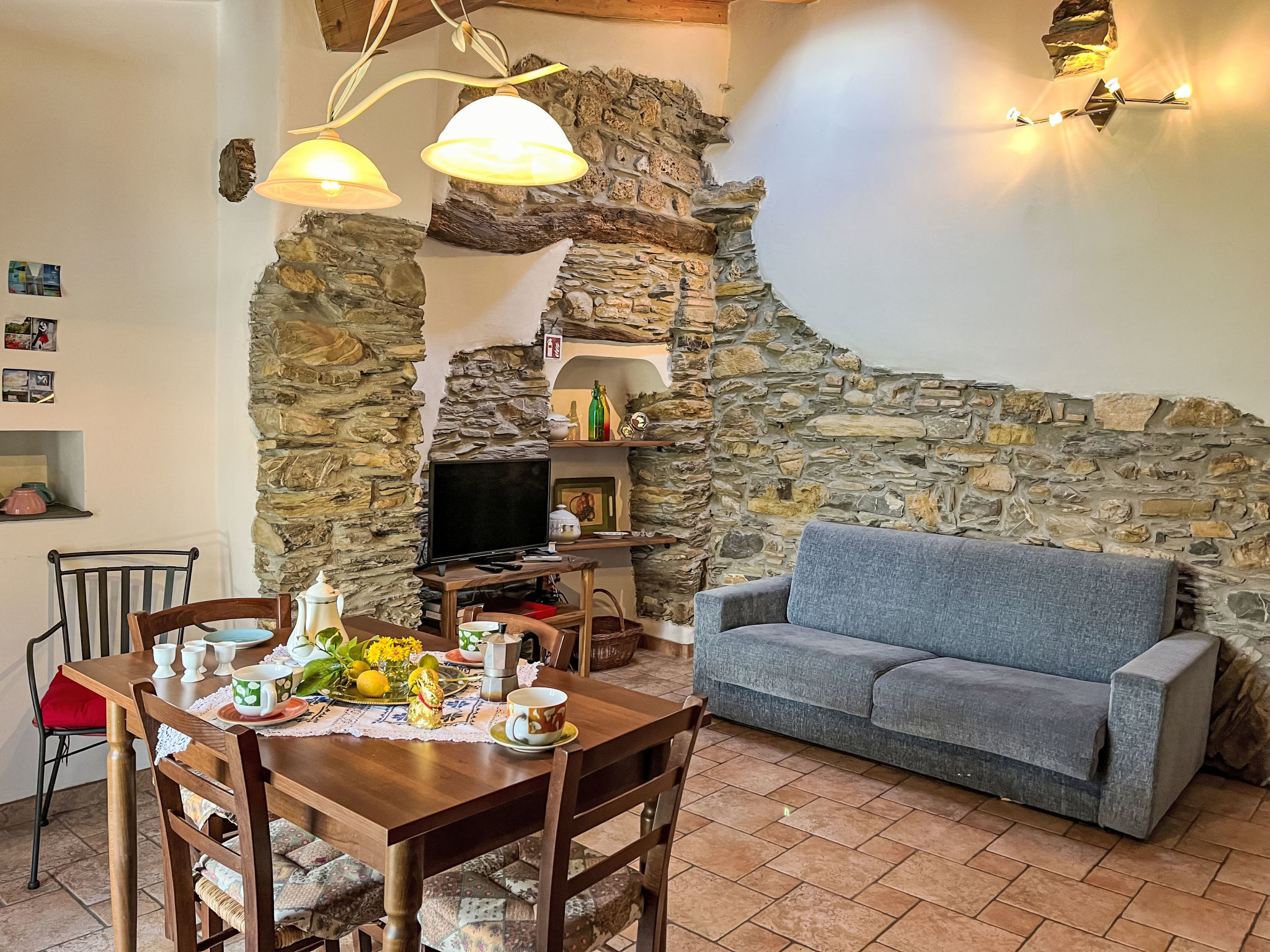 Das 2014 renovierte Dorfhaus mit den beiden Hausteilen CA DA CIASSA (VLO 130) und CA DA PRIMA PORTA (VLO 131) liegt in der Ortsmitte von Valloria. Nächste Einkaufsmöglichkeit in Prelà, 4 km. Zu den Fels-, Kies- und Sandstränden von Imperia 14 km. Tavole mit Felsbadebecken 4 km. Das Restaurant 'Antiche Bontà di Valloria' (ca. 50 m) bietet für unsere Feriengäste ein reichhaltiges Frühstück (€ 5 pro Person) sowie ein mehrgängiges ligurisches Spezialitäten-Menü (€ 25 pro Person, Bestellung und Bezahlung jeweils am Ort). Parkmöglichkeiten an der Piazza mit Dorfkirche vor dem Haus sowie auf öffentlichem Parkplatz, ca. 20 m. Abstellmöglichkeit von Fahrrädern in abschließbarem Abstellraum im Erdgeschoss. Ca. 100 m entfernt kleiner offener Grundstücksanteil (Zugang über Treppenweg). Hier pro Hausteil jeweils Freisitz mit schönem Panoramablick, Liegestühlen und Grill. Zu jedem Hausteil gehört außerdem eine kleine Terrasse mit Tisch und 2 Stühlen im Eingangsbereich (bei VLO 131 überdacht). Gute Einrichtung. Teils Natursteinwände und Holzbalkendecken. Fliesenböden. Sat-TV (deutsche Programme). Internetzugang (WLAN, inklusive). Waschmaschine. Gas-Zentralheizung.