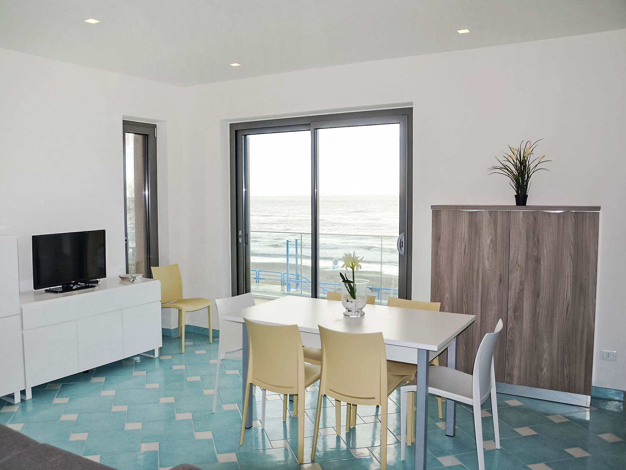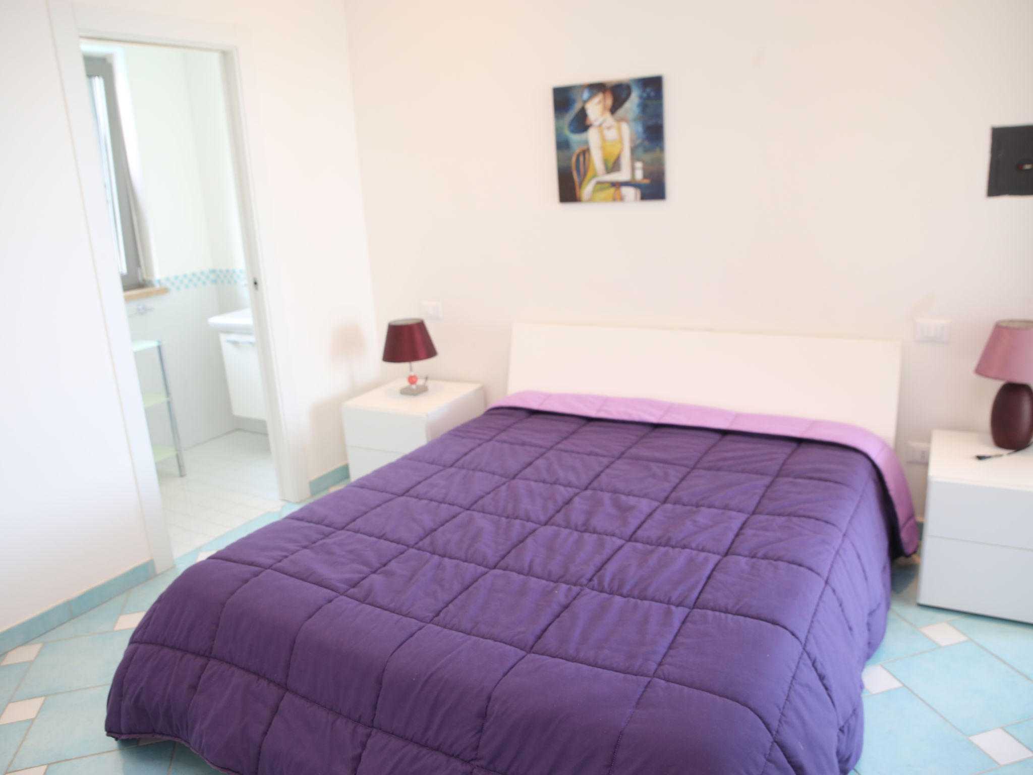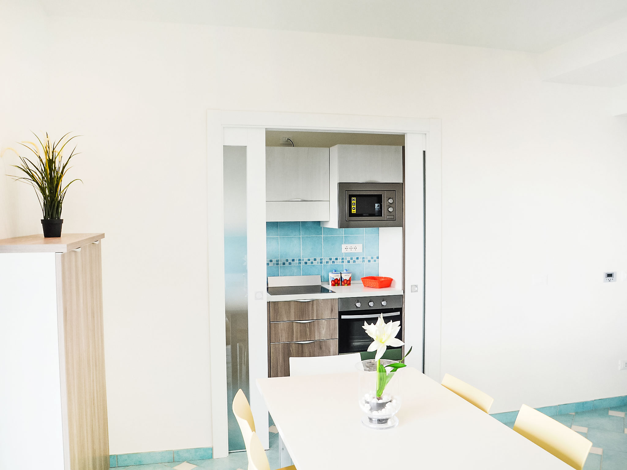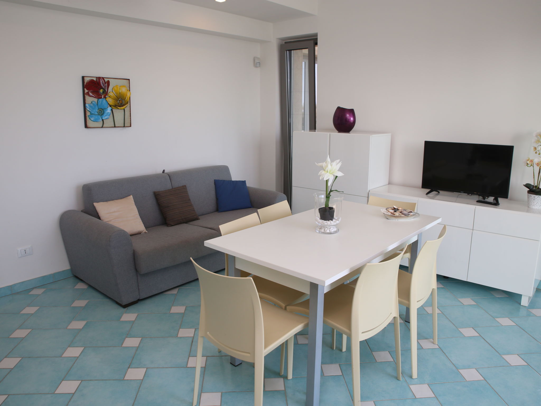 "Appartamento 3", 3-Zimmer-Wohnung 63 m2 im 1. Stock. Sehr komfortabel und modern eingerichtet: Wohn-/Esszimmer mit 1 Doppeldiwanbett und TV (Flachbildschirm). Ausgang zum Balkon. 1 Doppelzimmer mit Dusche/Bidet/WC. 1 Zimmer mit 1 x 2 Etagenbetten. Offene Küche (Backofen, Geschirrspüler, 4 Induktionskochplatten, Mikrowelle, Tiefkühler). Dusche/Bidet/WC. Heizung, Klimaanlage. Balkonmöbel. Sehr schöne Sicht auf das Meer. Zur Verfügung: Waschmaschine, Safe, Haartrockner. Internet (Wireless LAN, gratis). 1 kleines Haustier/Hund erlaubt.