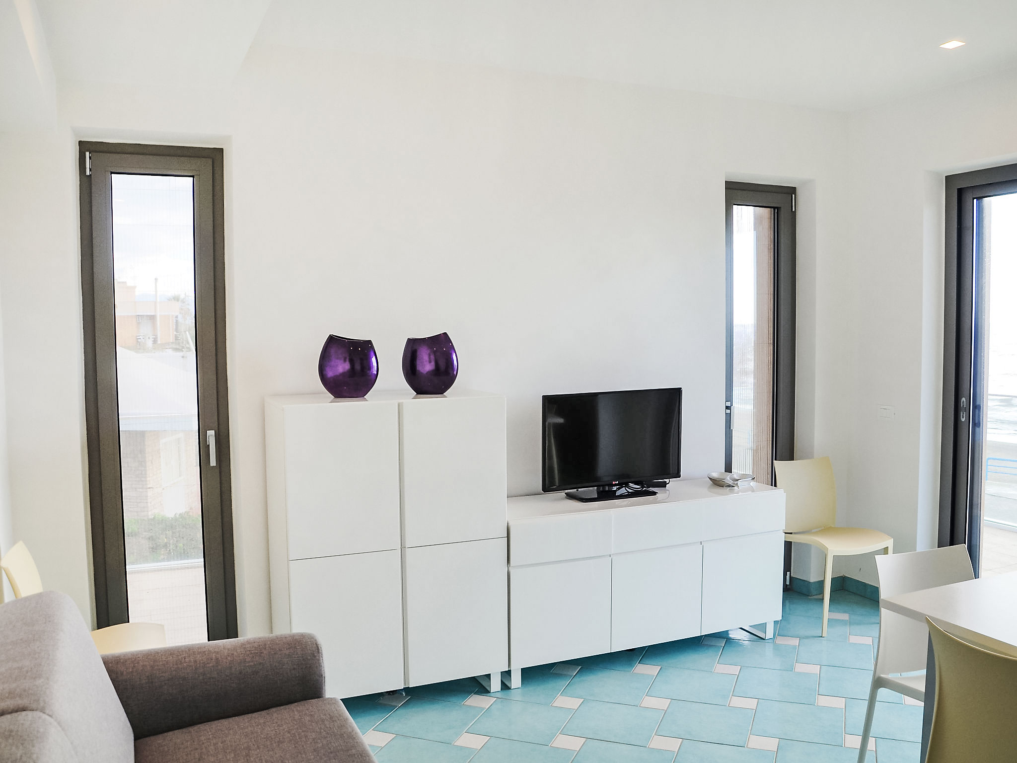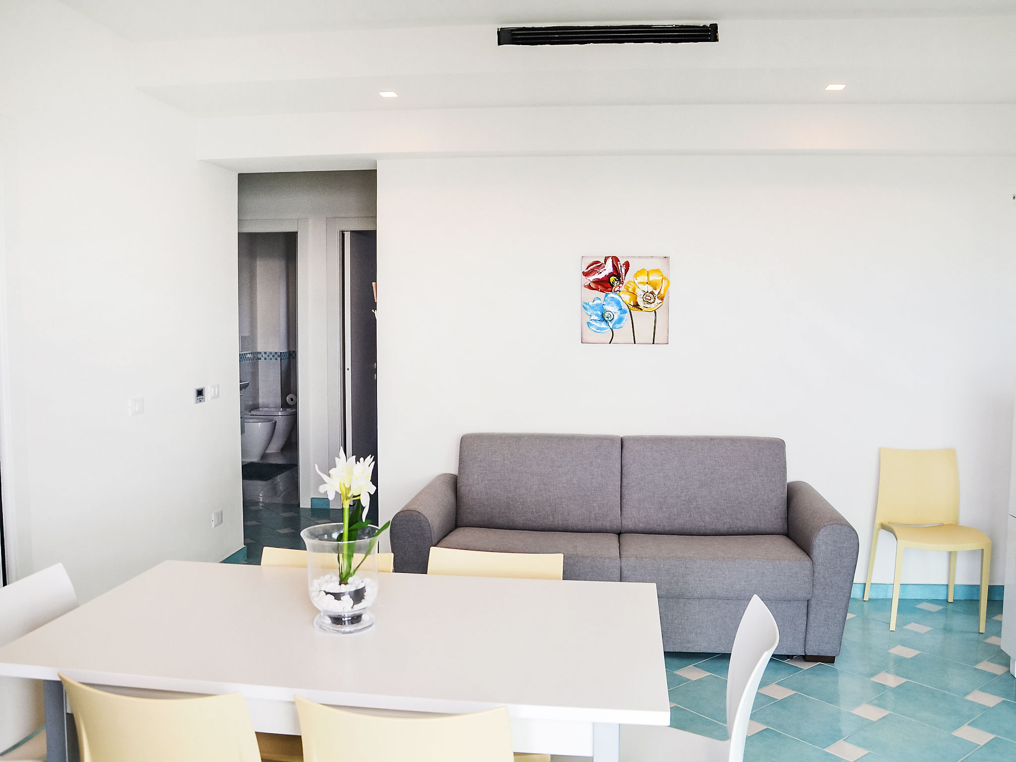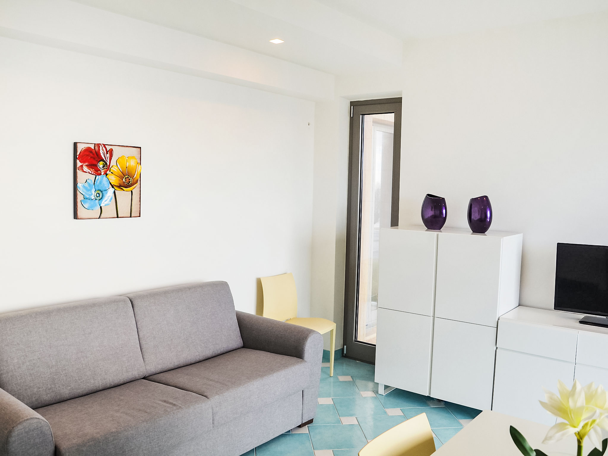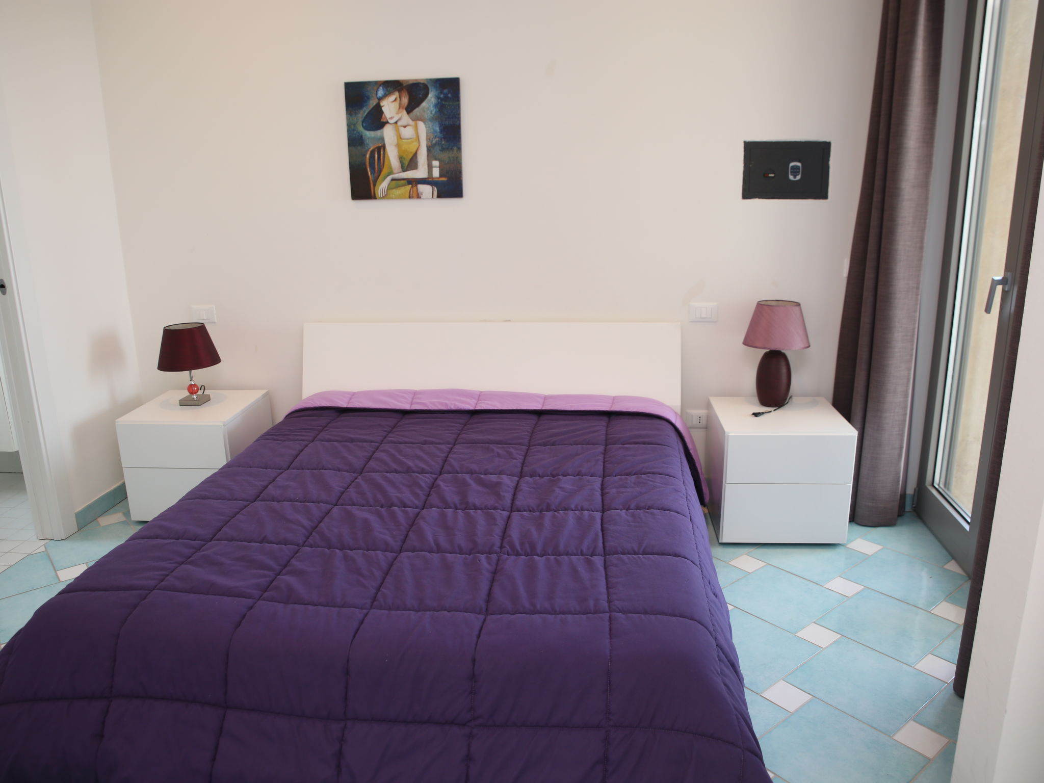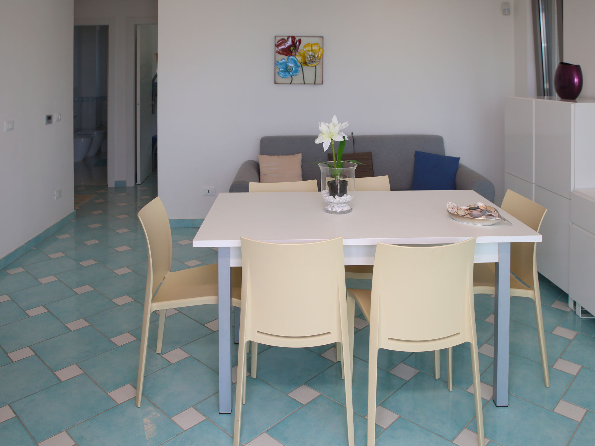 "Appartamento 3", 3-Zimmer-Wohnung 63 m2 im 1. Stock. Sehr komfortabel und modern eingerichtet: Wohn-/Esszimmer mit 1 Doppeldiwanbett und TV (Flachbildschirm). Ausgang zum Balkon. 1 Doppelzimmer mit Dusche/Bidet/WC. 1 Zimmer mit 1 x 2 Etagenbetten. Offene Küche (Backofen, Geschirrspüler, 4 Induktionskochplatten, Mikrowelle, Tiefkühler). Dusche/Bidet/WC. Heizung, Klimaanlage. Balkonmöbel. Sehr schöne Sicht auf das Meer. Zur Verfügung: Waschmaschine, Safe, Haartrockner. Internet (Wireless LAN, gratis). 1 kleines Haustier/Hund erlaubt.