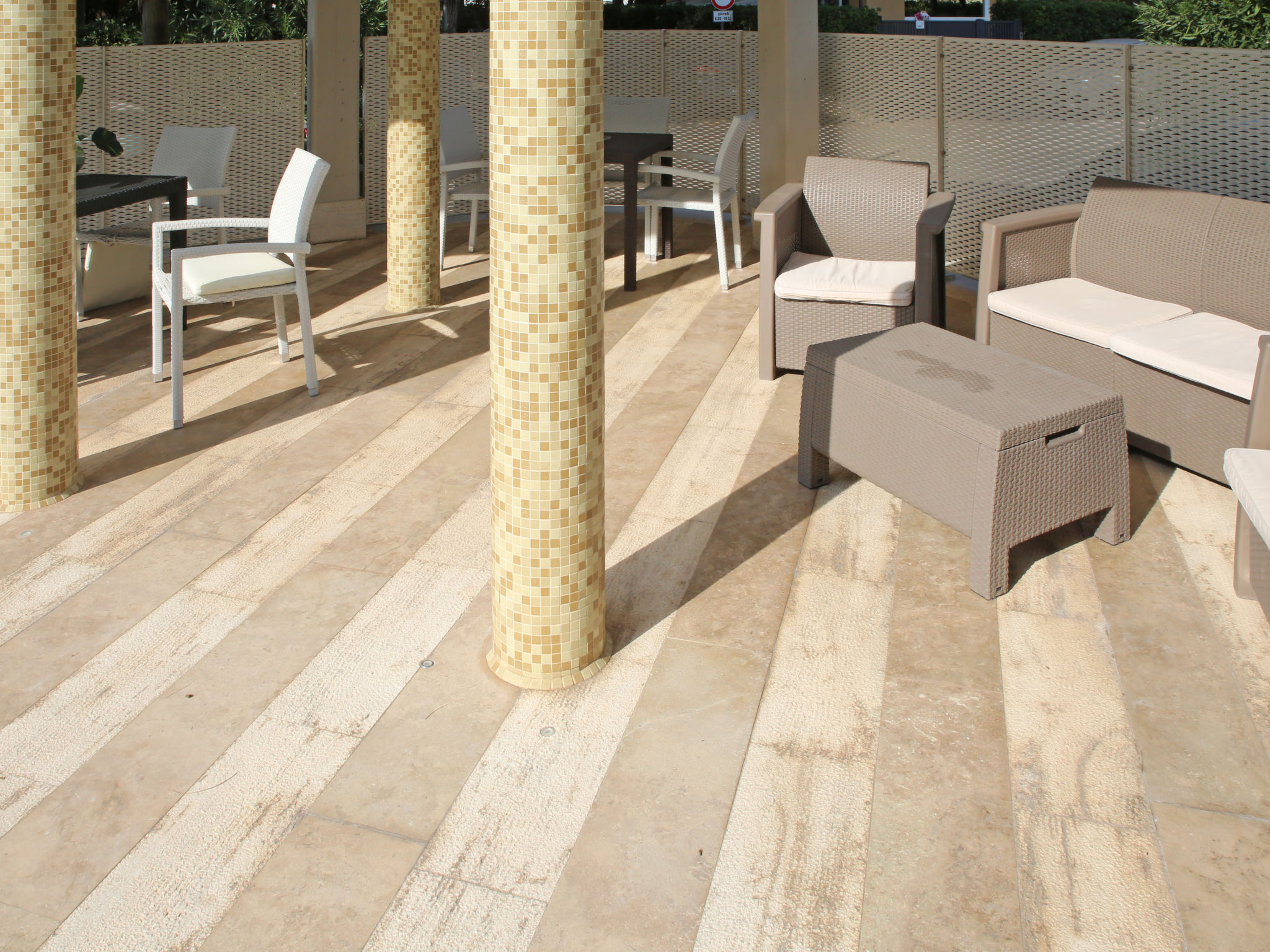 Sehr modernes, schönes, komfortables Mehrfamilienhaus "Residenza Fortunata", auf 2 Stockwerken. 4 Wohnungen im Ferienhaus. Im Ort, 2.5 km vom Zentrum von Terracina, zentrale, sonnige Lage, 10 m vom Strand, Strasse zu überqueren, Richtung Südwesten. Zur Mitbenutzung: kleiner Garten (eingezäunt), Schwimmbad (15 x 6 m, 50 - 190 cm tief, saisonale Verfügbarkeit: 15.Jun.-22.Okt.). Dusche/WC im Poolbereich, Aussendusche. Wäschewechsel 1 mal wöchentlich (zusätzlich extra). Handtuchwechsel 1 mal wöchentlich (zusätzlich extra). Wohnungsreinigung 1 mal wöchentlich möglich (extra). Öffentliche Parkplätze auf der Strasse. Supermarkt 500 m, Restaurant 200 m, Bahnstation "Terracina" 3.5 km, Sandstrand 10 m.