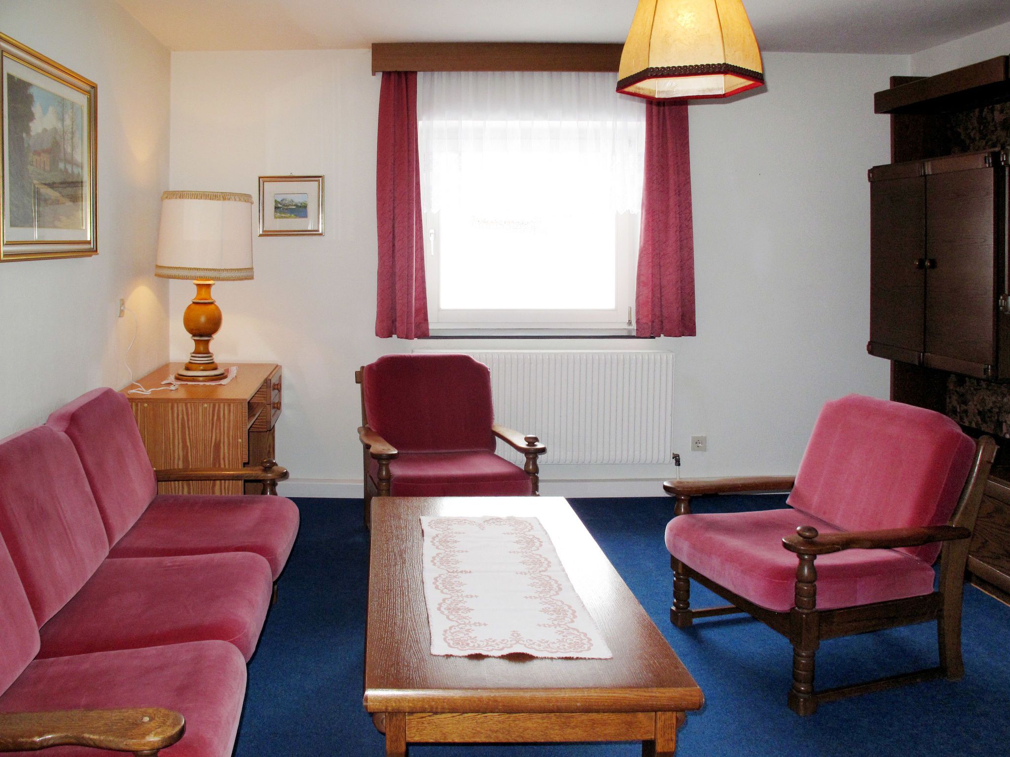3-Zimmer-Wohnung, Hochparterre, ca. 80 m². Flur. Wohnraum mit Sitzgruppe. Küche (4 Platten, Backofen, Mikrowelle, Geschirrspüler, Kühlschrank, Kaffeemaschine) mit Essecke. Doppelzimmer. Schlafzimmer mit Doppelbett und Einzelbett. Dusche/WC.