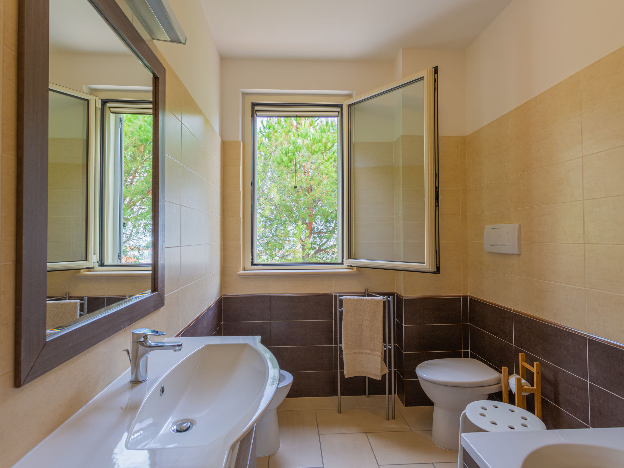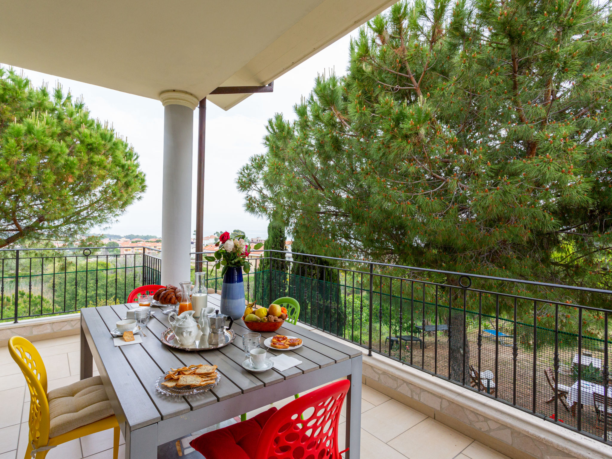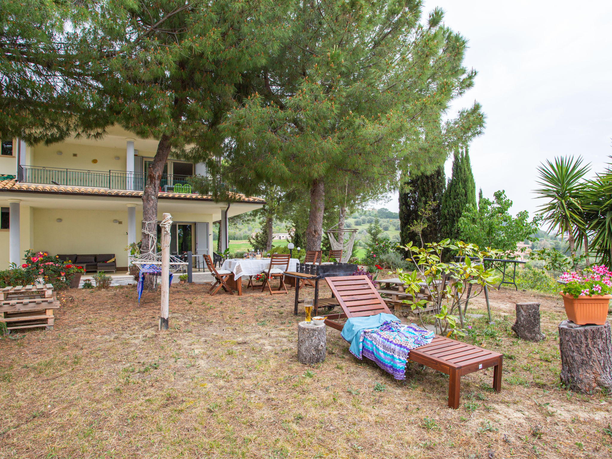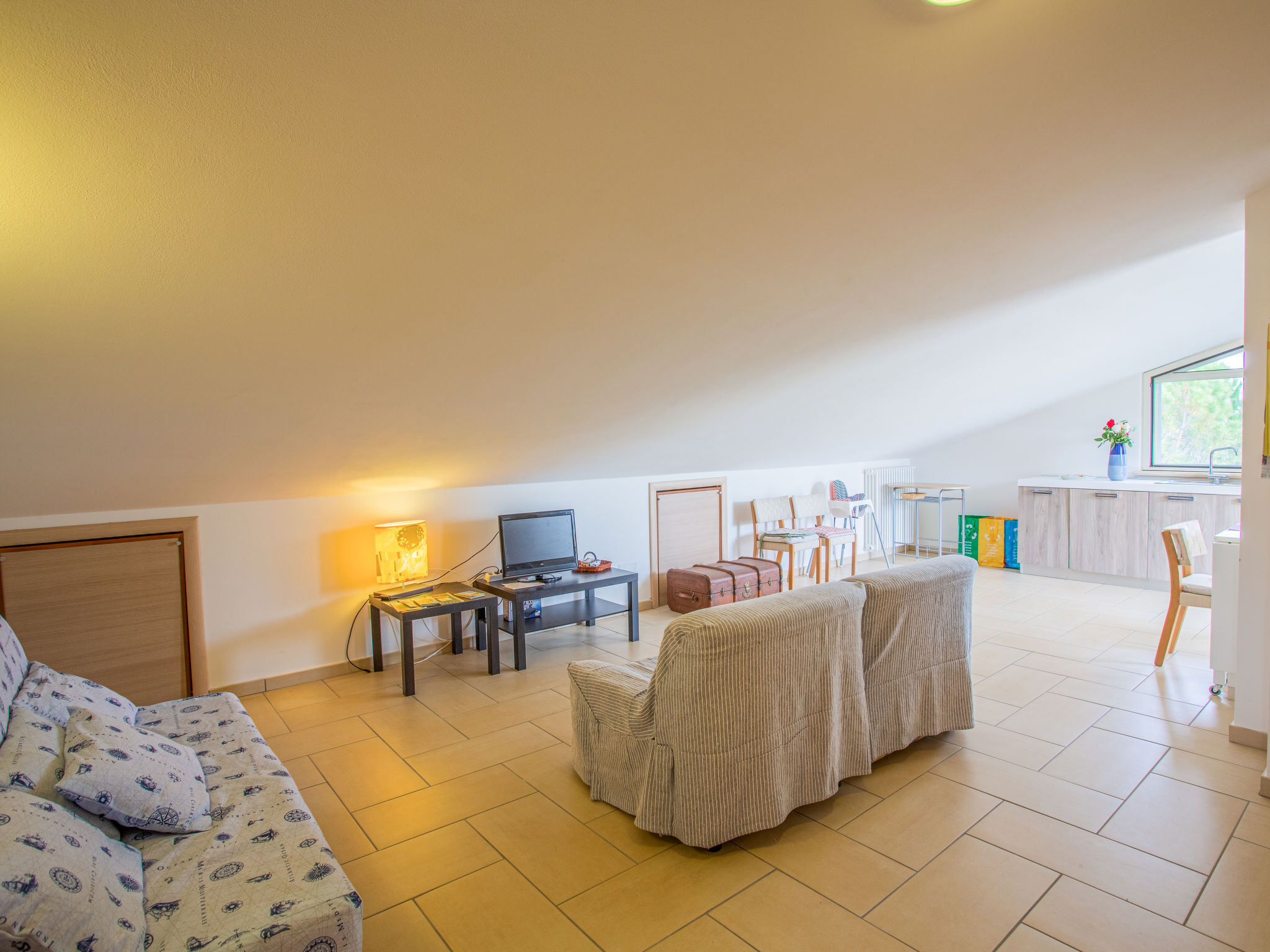 "Michela (PIT232)", 5-Zimmer-Haus 190 m2 auf 2 Stockwerken, Südostlage. Teilweise abgeschrägt, zweckmässig eingerichtet: Obergeschoss: grosses Wohn-/Schlafzimmer mit Vorhang mit 1 Doppeldiwanbett, Esstisch, Sat-TV und Radio. Ausgang zum Balkon. 2 Zimmer, jedes Zimmer mit 1 Doppelbett. Ausgang zum Balkon. Offene Küche (Backofen, Geschirrspüler, 5 Flammen, Toaster, Tiefkühler, elektrische Kaffeemaschine). Bad/WC, Dusche/WC. G-Heizung. Dachgeschoss: abgeschrägtes Wohn-/Schlafzimmer mit 2 Schlafmöglichkeiten, Esstisch, Sat-TV, Radio und Klimaanlage. Ausgang zur Terrasse. 1 abgeschrägtes Zimmer mit 1 franz. Bett (160 cm, Länge 190 cm), Klimaanlage. Ausgang zur Terrasse. Abgeschrägte, offene Küche (Backofen, Geschirrspüler, 4 Flammen, Toaster, elektrische Kaffeemaschine) mit Deckenhöhe 80 - 220 cm, Klimaanlage. Ausgang zur Terrasse. Bad/WC. G-Heizung. Grosser Balkon 20 m2, Terrasse 15 m2, Gartensitzplatz. Terrassenmöbel, Balkonmöbel, Gartengrill (mobil). Schöne Sicht auf das Meer und die Landschaft. Zur Verfügung: Waschmaschine, Babybett. Internet (Wireless LAN, gratis). 1 Haustier/Hund erlaubt. Keine interne Verbindung zwischen den Etagen.