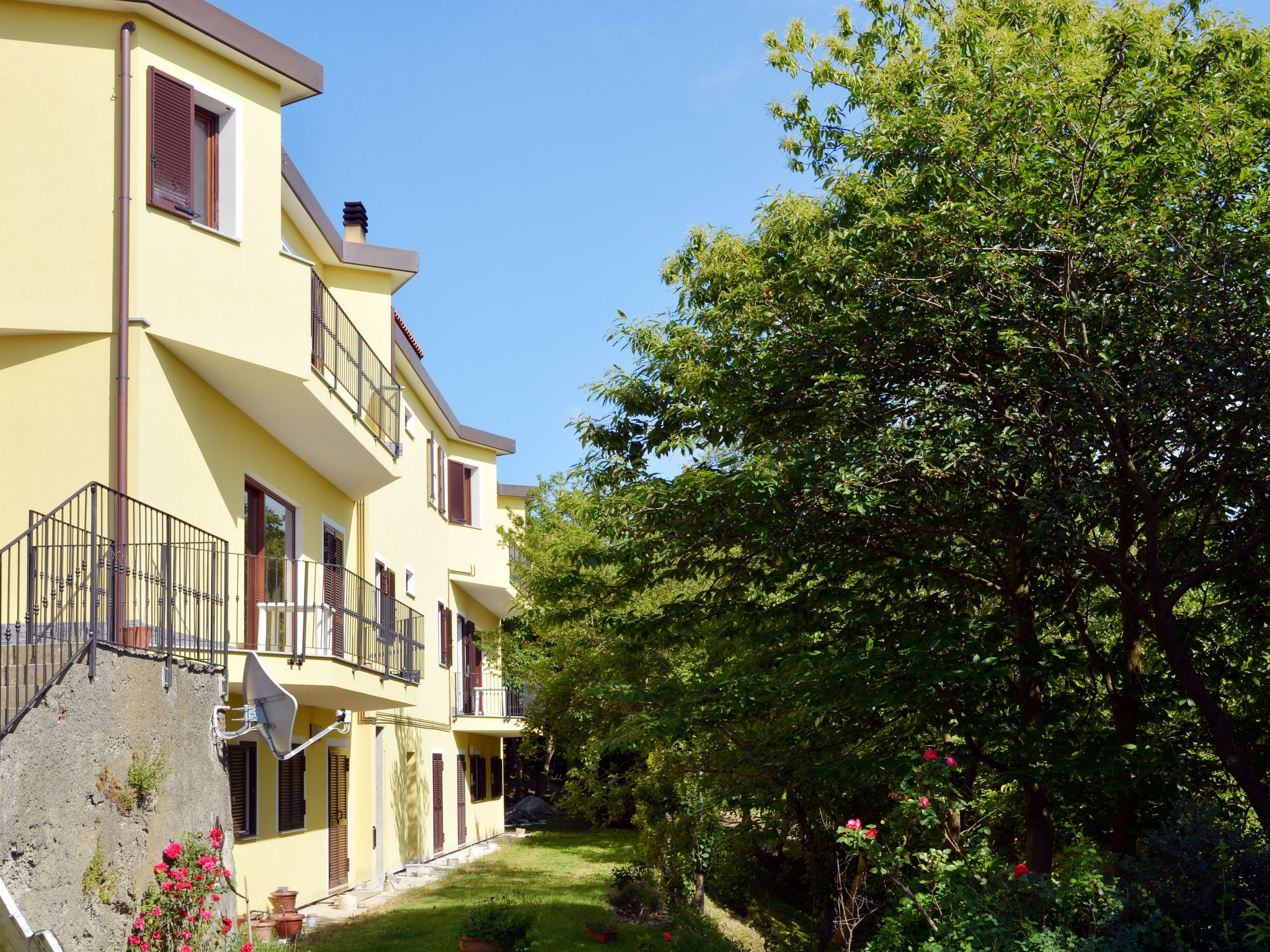Die kleine Residenz NASO DI GATTO mit 5 Ferienwohnungen und 2 von der Besitzerfamilie genutzten Wohnungen steht im gleichnamigen Weiler, in ländlicher Umgebung, auf gut 700 m Höhe, 3,5 km von San Bartolomeo del Bosco entfernt. Schöner Blick auf die bewaldeten Hügel und die Seealpen. Nächste Einkaufsmöglichkeit und Restaurants in Santuario (10 km). Supermärkte sowie Sand- und Felsstrände in Savona (17 km). Der Fernwanderweg 'Alta Via dei Monti Liguri' führt in 1 km Entfernung am Haus vorbei (auch Mountainbiken möglich). Kleiner Badesee (zu Fuß oder per Mountainbike erreichbar) 8 km. Auf dem ca. 6 ha großen, naturbelassenen Hanggrundstück mit Bäumen und Wiese wohnt auch der Besitzer, der sich um die Grundstückspflege kümmert. 15 Pkw-Stellplätze auf dem Grundstück, weitere Parkmöglichkeiten entlang der Straße. Garage für Mountainbikes. Große, von Bäumen bestandene Gemeinschaftswiese mit Sonnenpavillon, Mobiliar (6 Gartentische, Stühle, Bänke), 5 Liegestühlen, 5 Sonnenliegen und 2 gemauerten Grills. Die Wohnungen 'Faggio' und 'Noce' (SBO 101/103 sind zum Garten hin gelegen, die Wohnungen 'Quercia', 'Sabucco' und 'Acero' (SBO 100/102/104) liegen auf der Vorderseite des Hauses, wo eine kleine Straße vorbeiführt. Zu jeder Wohnung gehört ein Balkon mit 2 Stühlen. Die 2017 renovierten Wohnungen sind gut und gemütlich eingerichtet. Fliesenböden. Sat-TV. Internetzugang (WLAN, inklusive). Waschmaschine, Bügeleisen/-brett. Abstellraum. Elektro- und Pelletheizung. Hinweis: Rauchen ist in den Wohnungen nicht gestattet.
