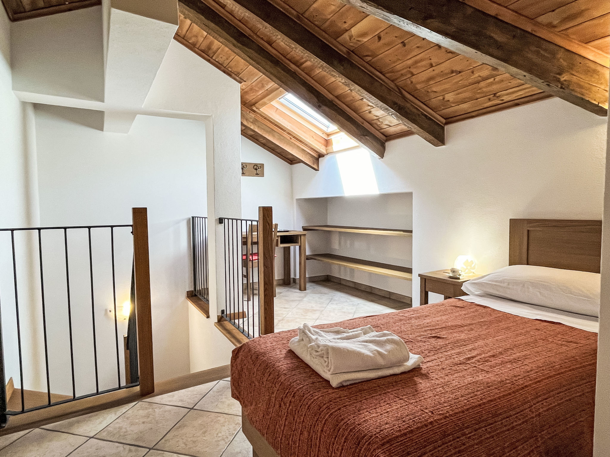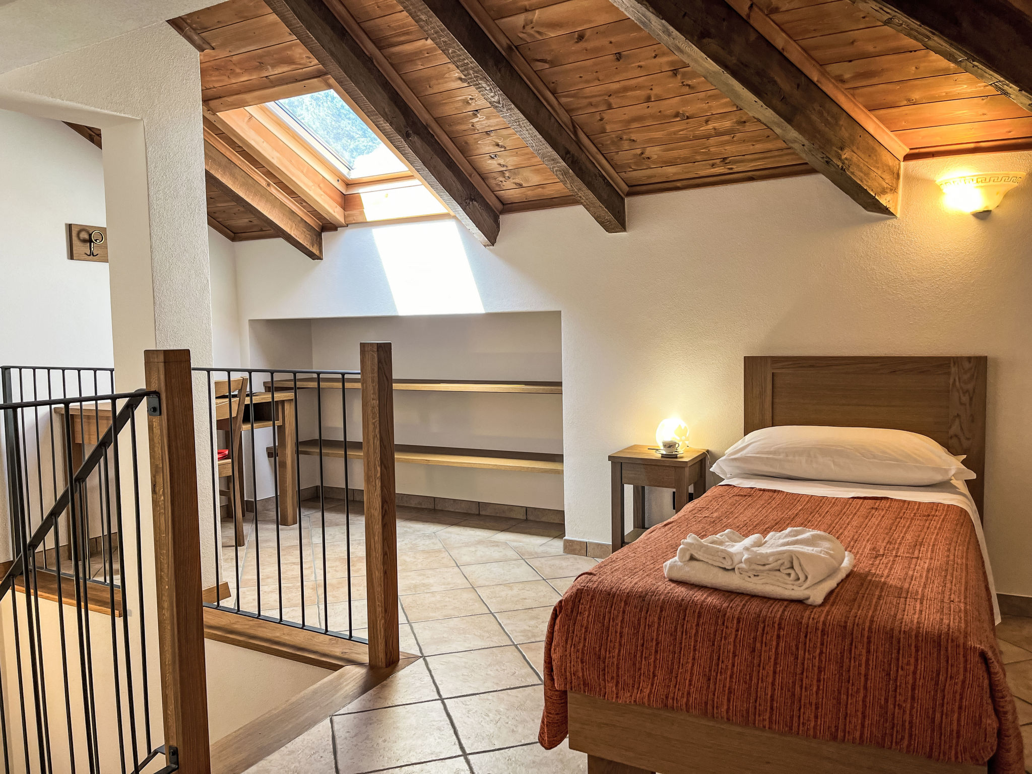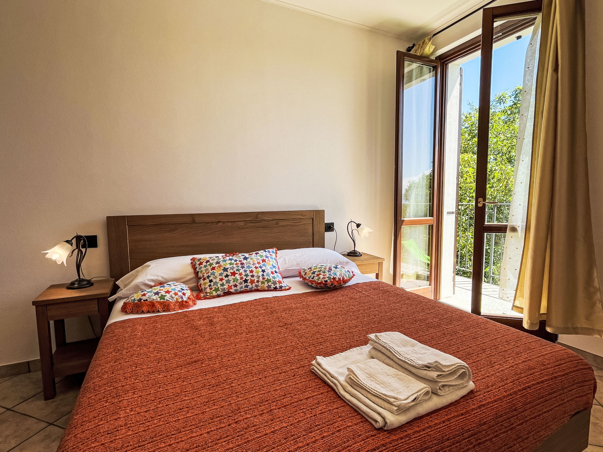 3-Zimmer-Wohnung 'Noce', 1. Etage (2 Ebenen), ca. 55 m². Zugang über Außentreppe. Untere Ebene: Wohn-/Schlafraum mit Doppelbettcouch (1,60 m breit), Essplatz, Küchenzeile (4 Flammen, Backofen, Geschirrspüler, Kühl-/Gefrierkombination, Kaffeemaschine, Wasserkocher) und Balkonausgang. Schlafzimmer mit franz. Bett (1,60 m breit). Dusche/Bidet/WC. Obere Ebene (Dachschräge mit Dachfenstern): Einzelzimmer (Bett 0,80 m breit) mit sep.WC. CITR 009056-CAV-0001