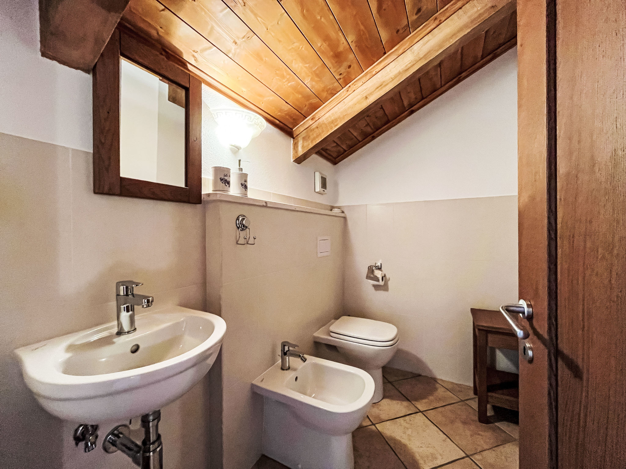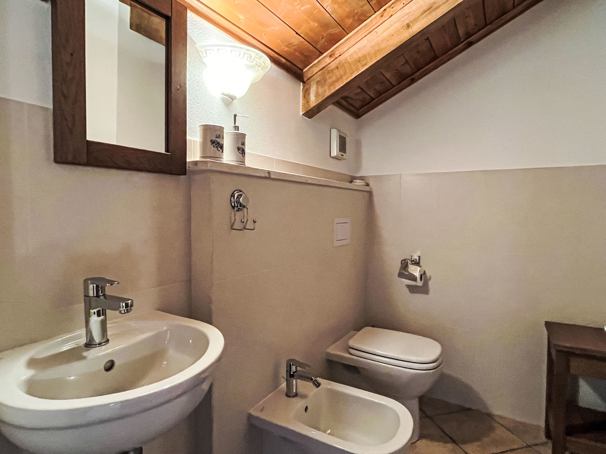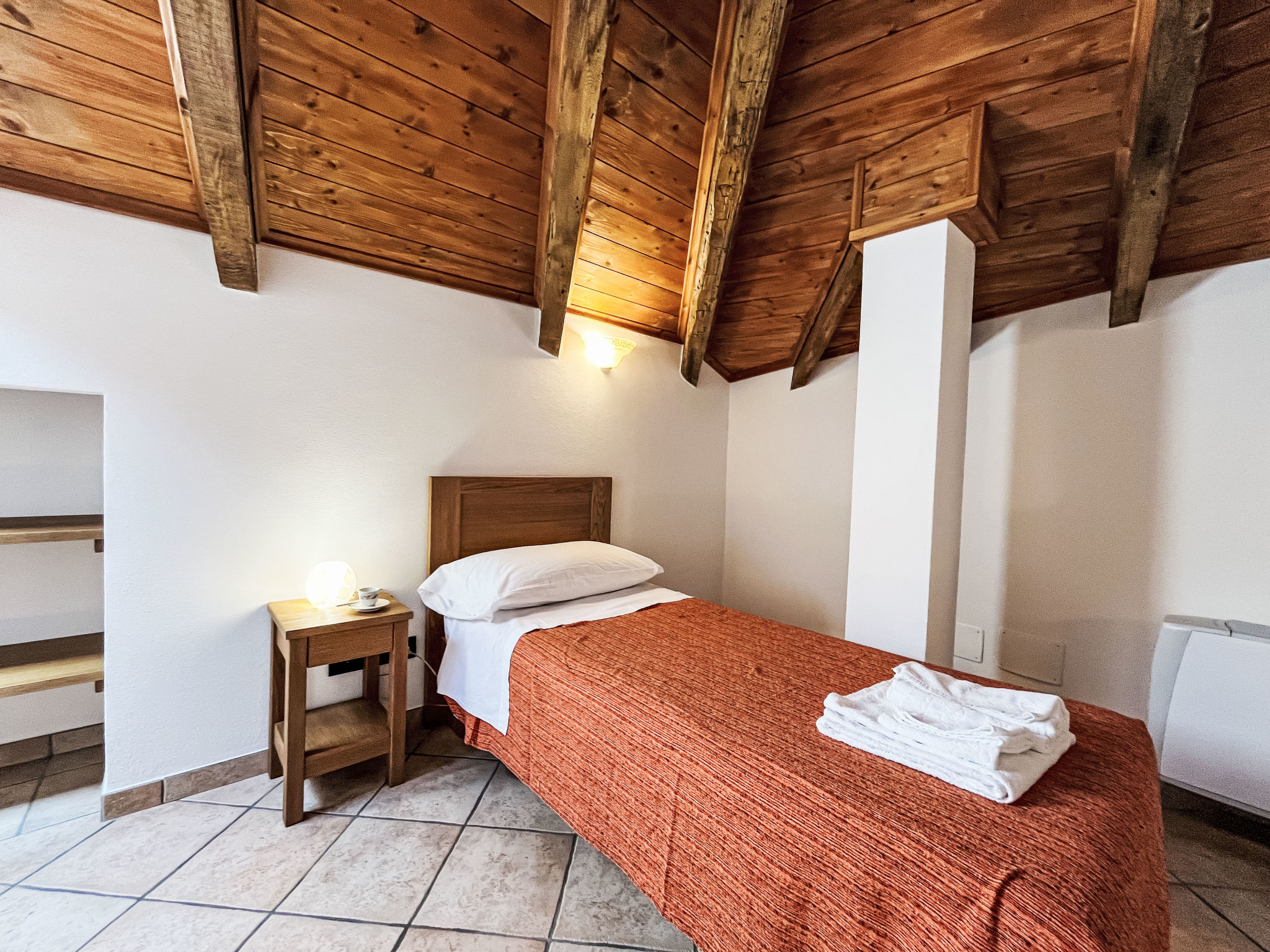 3-Zimmer-Wohnung 'Noce', 1. Etage (2 Ebenen), ca. 55 m². Zugang über Außentreppe. Untere Ebene: Wohn-/Schlafraum mit Doppelbettcouch (1,60 m breit), Essplatz, Küchenzeile (4 Flammen, Backofen, Geschirrspüler, Kühl-/Gefrierkombination, Kaffeemaschine, Wasserkocher) und Balkonausgang. Schlafzimmer mit franz. Bett (1,60 m breit). Dusche/Bidet/WC. Obere Ebene (Dachschräge mit Dachfenstern): Einzelzimmer (Bett 0,80 m breit) mit sep.WC. CITR 009056-CAV-0001