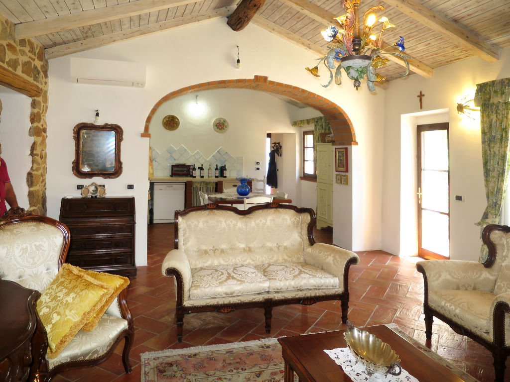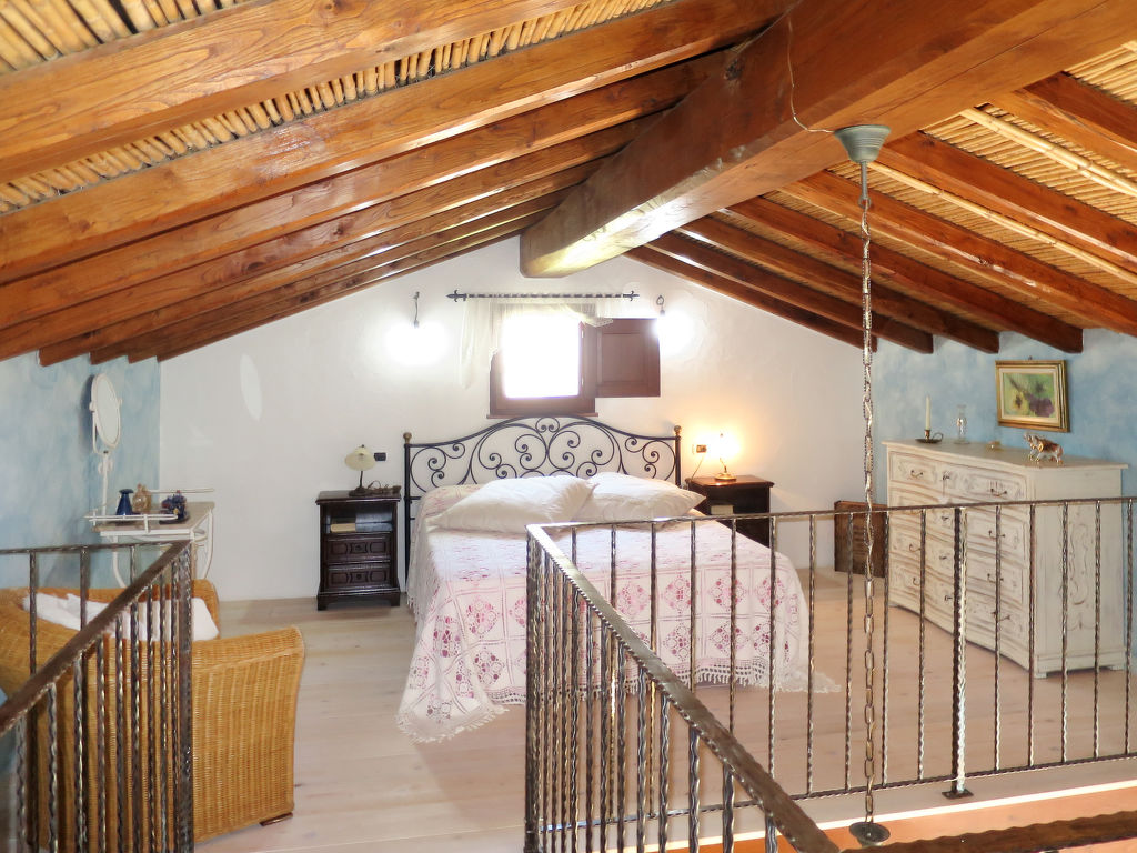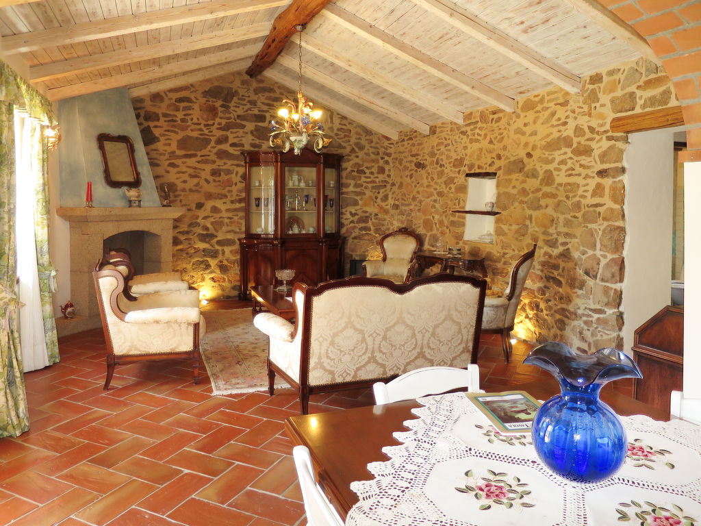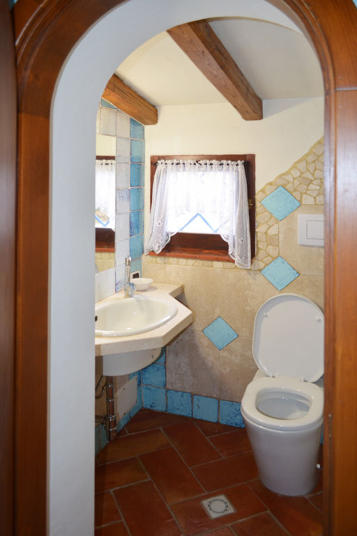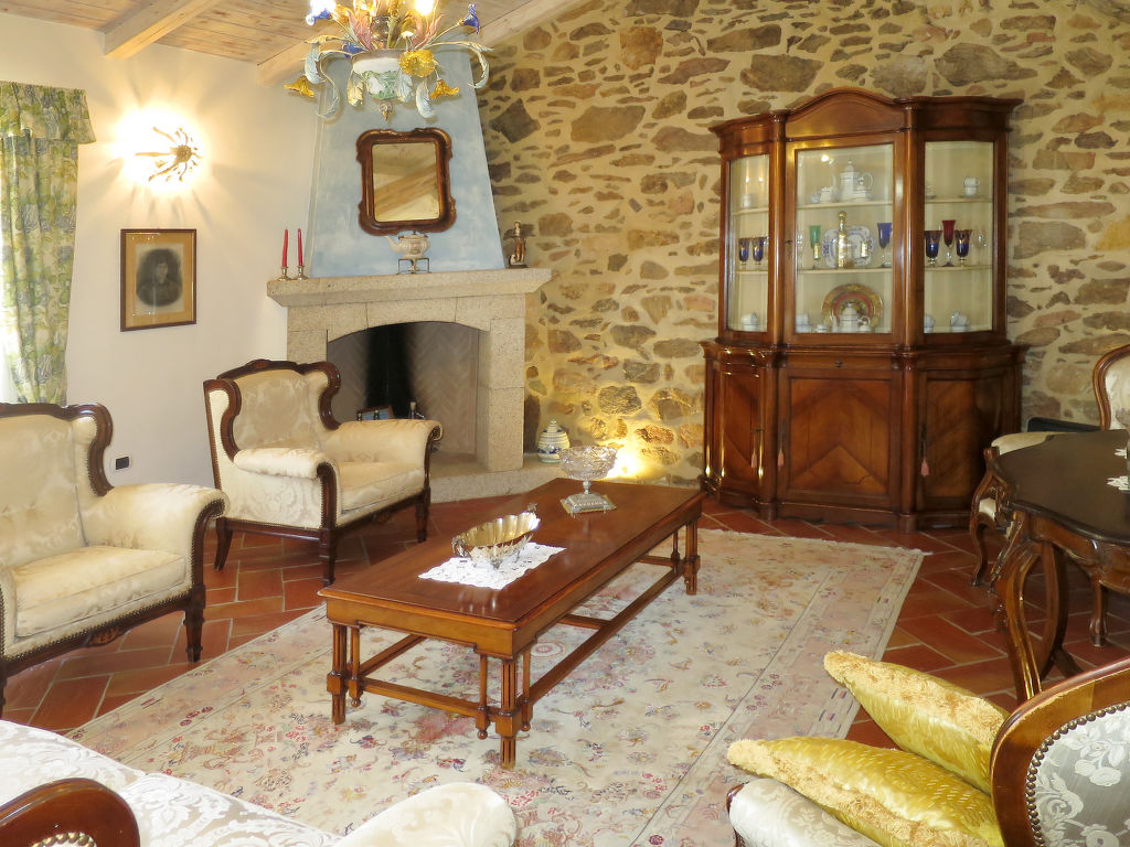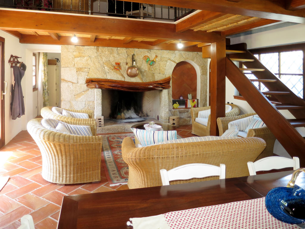 "Li Funnesi (POT200)", 3-Zimmer-Haus 120 m2 auf 2 Stockwerken. Rustikal und antik eingerichtet: offenes grosses Wohn-/Esszimmer mit offenem Kamin und Sat-TV. Ausgang zur Terrasse. Wohn-/Schlafzimmer mit 1 Bett, offenem Kamin und Sat-TV. Ausgang zum Garten. 1 Zimmer mit 1 franz. Bett (160 cm). Grosse, offene Küche (Backofen, Geschirrspüler, 4 Flammen, Mikrowelle, Tiefkühler) mit Esstisch. Dusche/WC, sep. WC. Obergeschoss: (geländerlose Treppe) abgeschrägte, offene Galerie mit 1 Doppelbett. E-Heizung, Klimaanlage. Holzböden. Grosse Terrasse teilweise überdacht. Terrassenmöbel, Gartengrill, Liegestühle (2). Zur Verfügung: Waschmaschine, Kinderhochstuhl, Babybett.