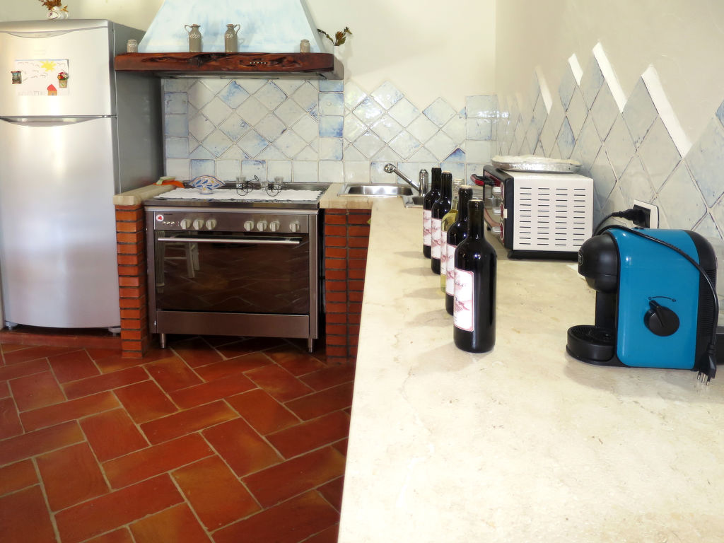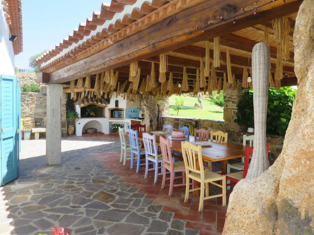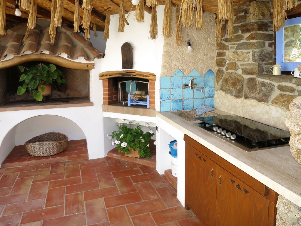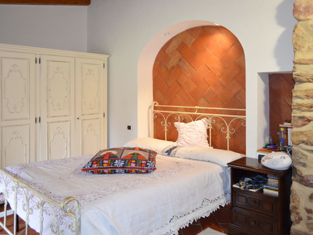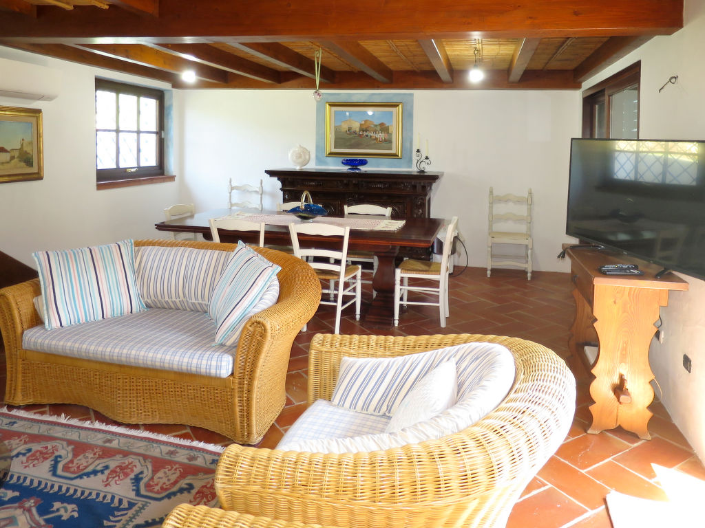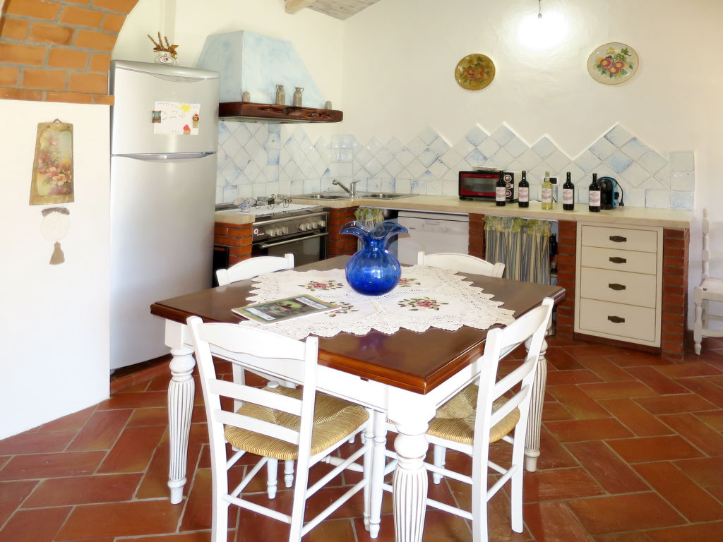 "Li Funnesi (POT200)", 3-Zimmer-Haus 120 m2 auf 2 Stockwerken. Rustikal und antik eingerichtet: offenes grosses Wohn-/Esszimmer mit offenem Kamin und Sat-TV. Ausgang zur Terrasse. Wohn-/Schlafzimmer mit 1 Bett, offenem Kamin und Sat-TV. Ausgang zum Garten. 1 Zimmer mit 1 franz. Bett (160 cm). Grosse, offene Küche (Backofen, Geschirrspüler, 4 Flammen, Mikrowelle, Tiefkühler) mit Esstisch. Dusche/WC, sep. WC. Obergeschoss: (geländerlose Treppe) abgeschrägte, offene Galerie mit 1 Doppelbett. E-Heizung, Klimaanlage. Holzböden. Grosse Terrasse teilweise überdacht. Terrassenmöbel, Gartengrill, Liegestühle (2). Zur Verfügung: Waschmaschine, Kinderhochstuhl, Babybett.