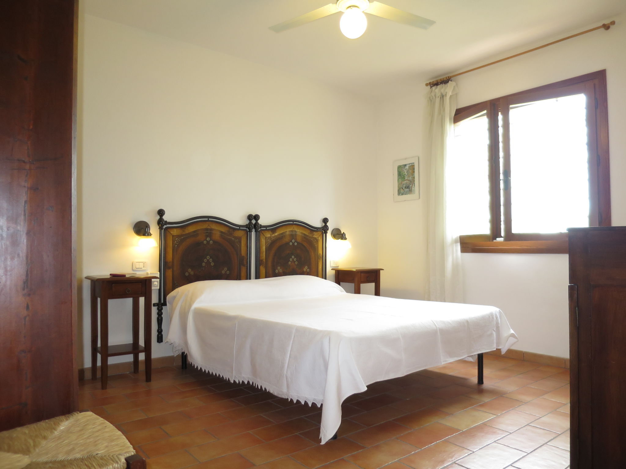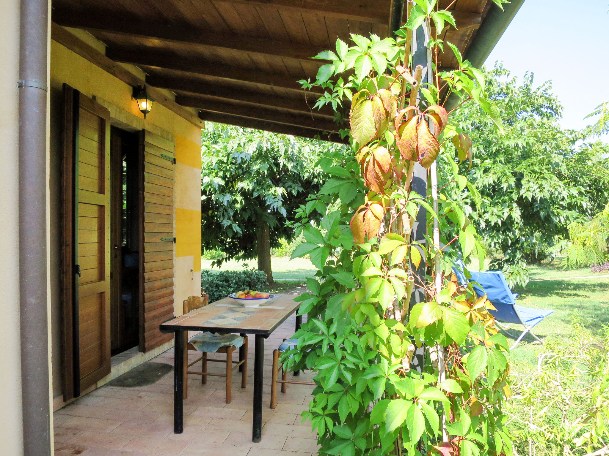 "Nord", 2-Zimmer-Doppelhaushälfte 36 m2. Einfach eingerichtet: 1 Zimmer mit 1 franz. Bett (160 cm). Wohnküche (Backofen, 4 Flammen, Wasserkocher, Mikrowelle, Tiefkühler) mit 1 Doppeldiwanbett, Esstisch und TV. Ausgang zur Terrasse. Dusche/Bidet/WC. G-Heizung. Terrasse überdacht, Garten. Terrassenmöbel, Liegestühle (2). Zur Verfügung: Fliegengitter, Babybett. Internet (Wireless LAN, gratis). Bitte beachten: Nichtraucher-Unterkunft. Maximal 2 Haustiere/Hunde erlaubt.