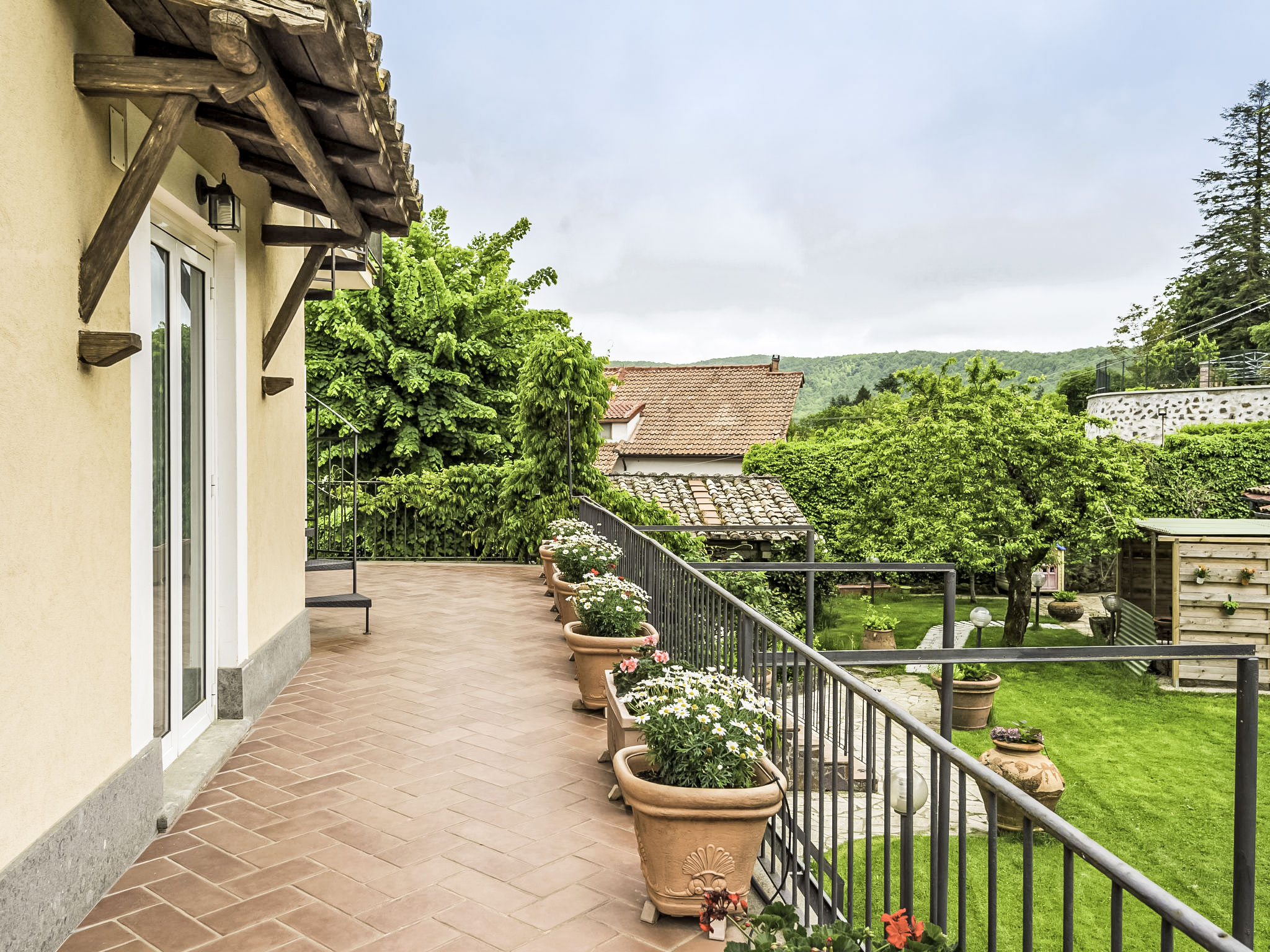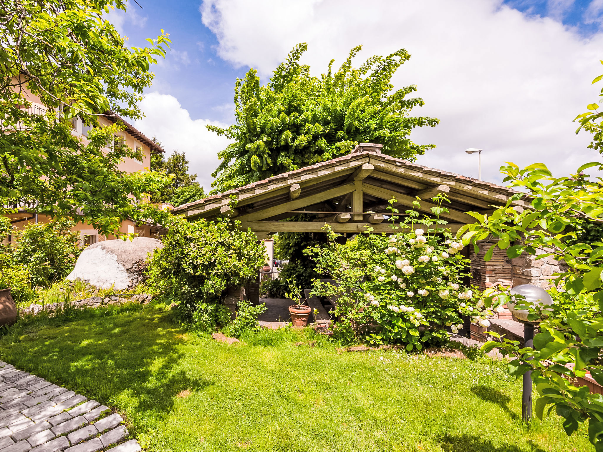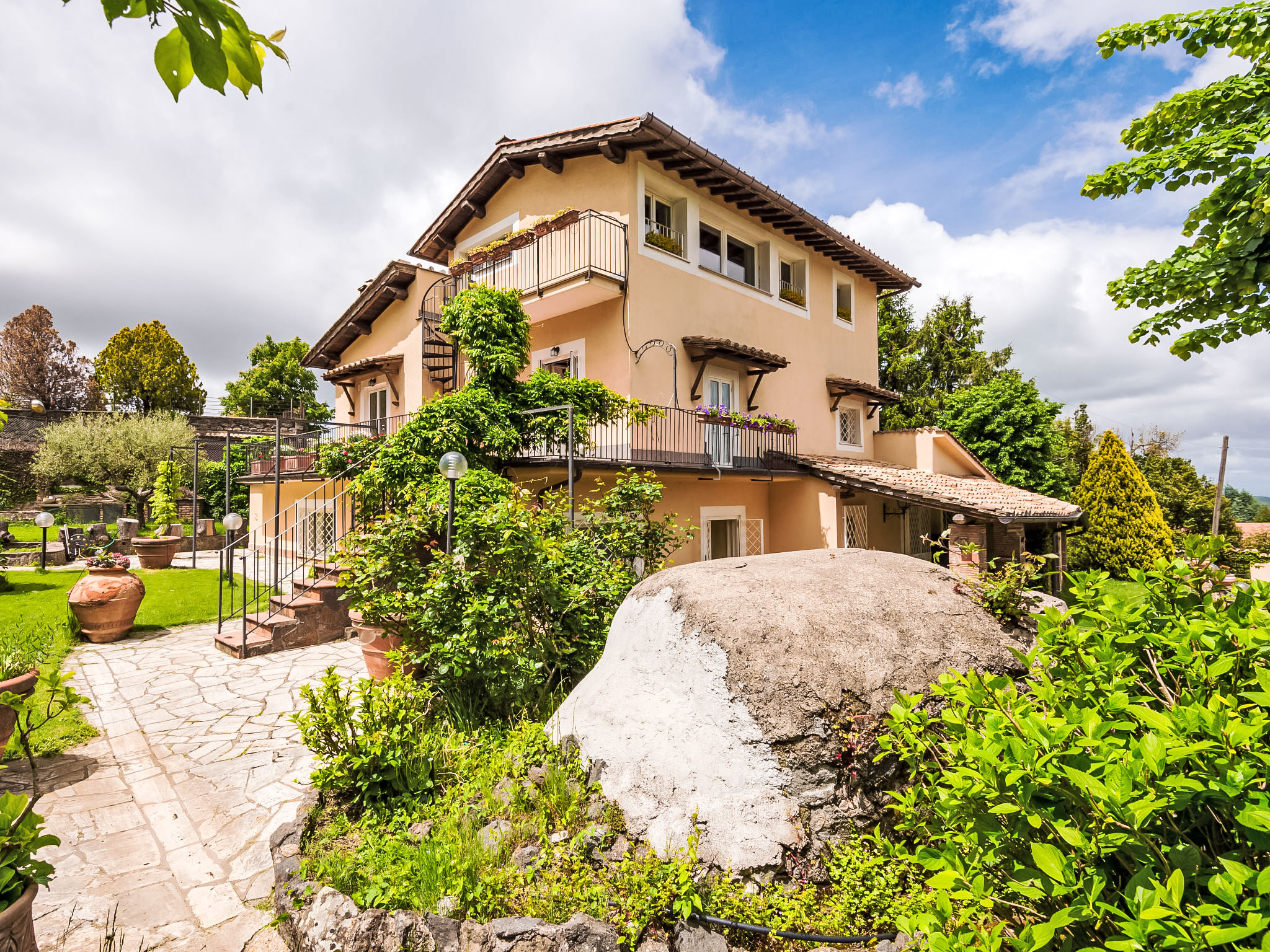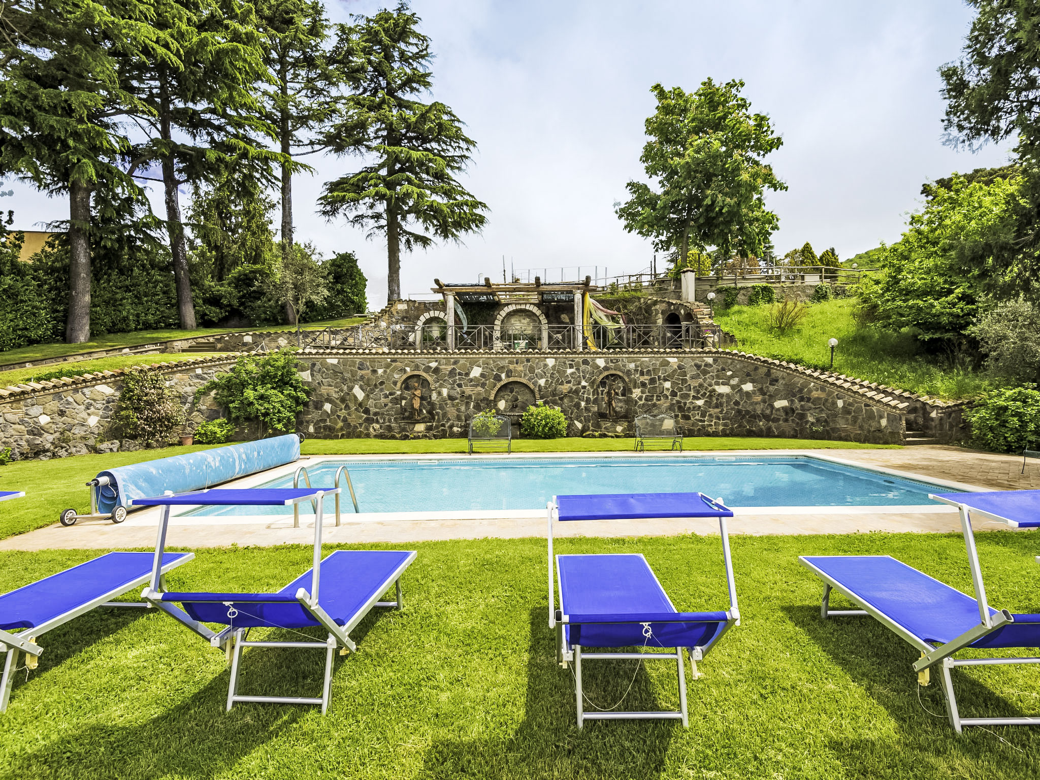 Zugang zum Pool und dem privaten Garten vom Balkon und über einen Fußweg über eine kleine Straße schöne, alleinstehende Villa "Vista da Rocca di Papa", auf 3 Stockwerken. Im Ort, 600 m vom Zentrum von Rocca Di Papa, ruhige, sonnige, erhöhte Lage im Villenviertel, 25 km vom Meer. Zur Alleinbenutzung: grosser Garten 4'000 m2 (eingezäunt) mit Rasen und Blumen, Teich, Schwimmbad (12 x 6 m, 110 - 220 cm tief, 15.05.-30.09.) mit Rollladenabdeckung. WC im Poolbereich, Poolhaus, Sitzplatz, Laube (10 m2), Terrasse, Gartenmöbel, Grill, Parkplatz (für 3 Autos) beim Haus. Lebensmittelgeschäft 600 m, Supermarkt 800 m, Restaurant 700 m, Bar 300 m. Nahe gelegene Sehenswürdigkeiten: Roma 30 km, Castel Gandolfo 8 km, Anzio 40 km, Lido di Ostia 40 km, Rainbow magic Land 30 km. Bekannte Seen in der Umgebung sind gut erreichbar: Lago di Albano 8 km, Lago di Nemi 11 km. Bitte beachten: Fahrzeug empfohlen. Jugendgruppen nur auf Anfrage. Der Besitzer akzeptiert keine Jugendgruppen. Der Besitzer wohnt auf dem gleichen Grundstück.