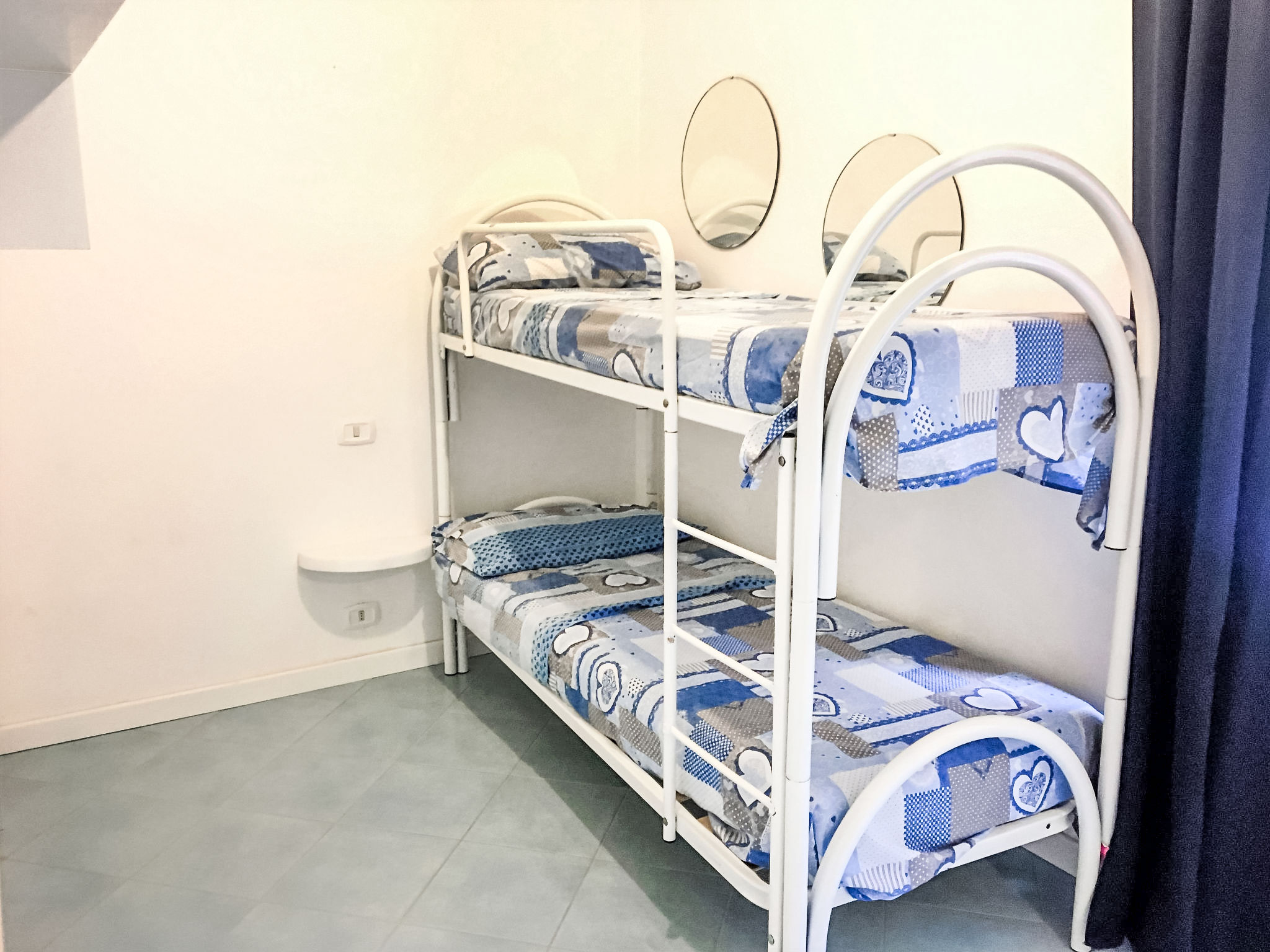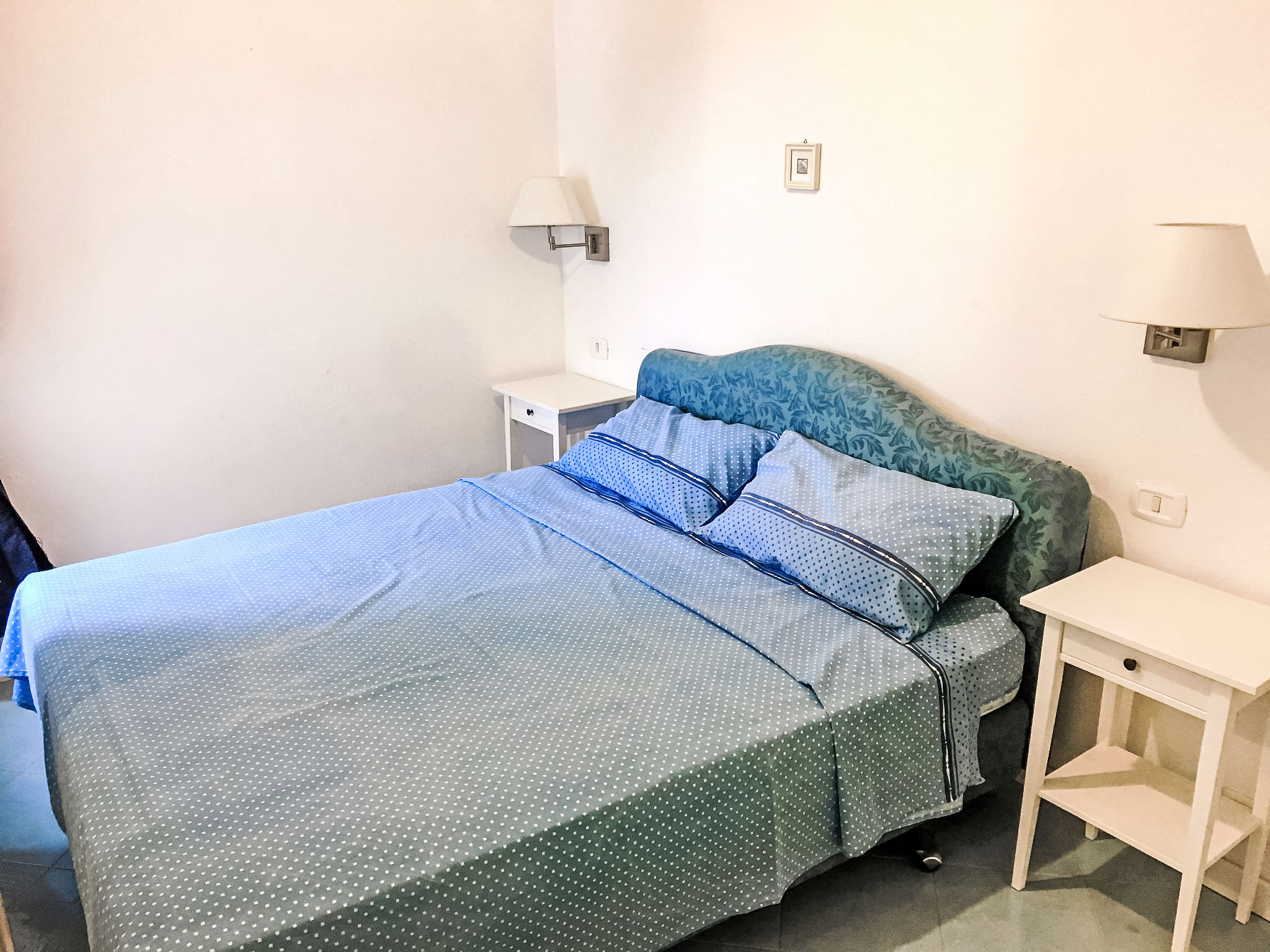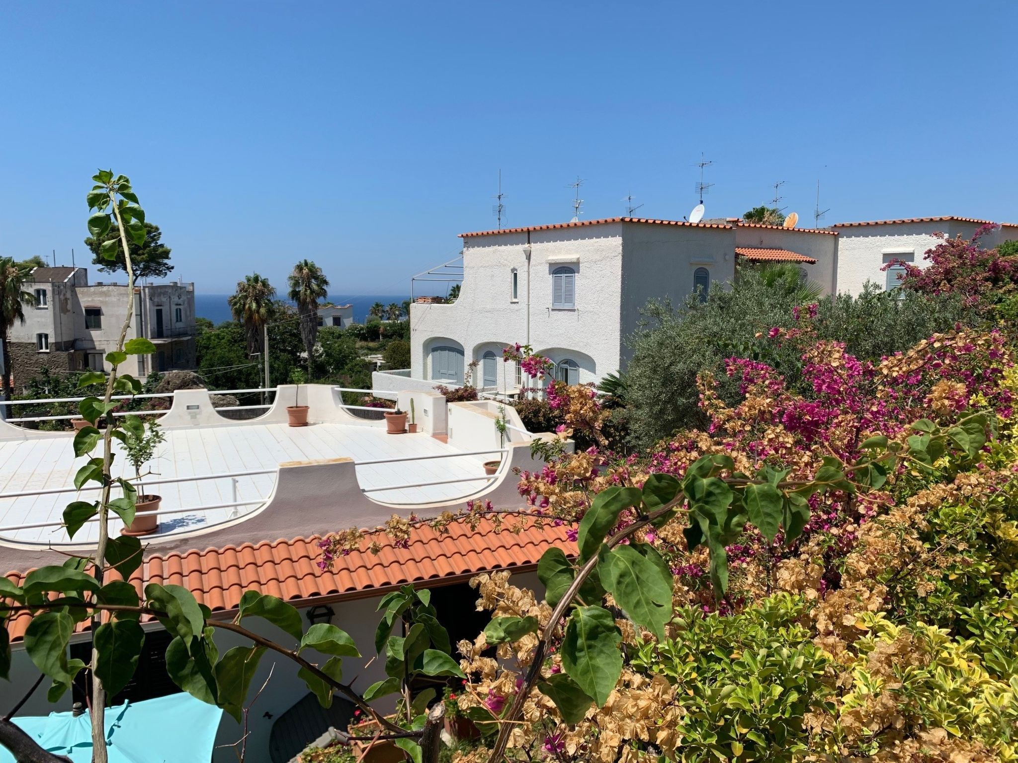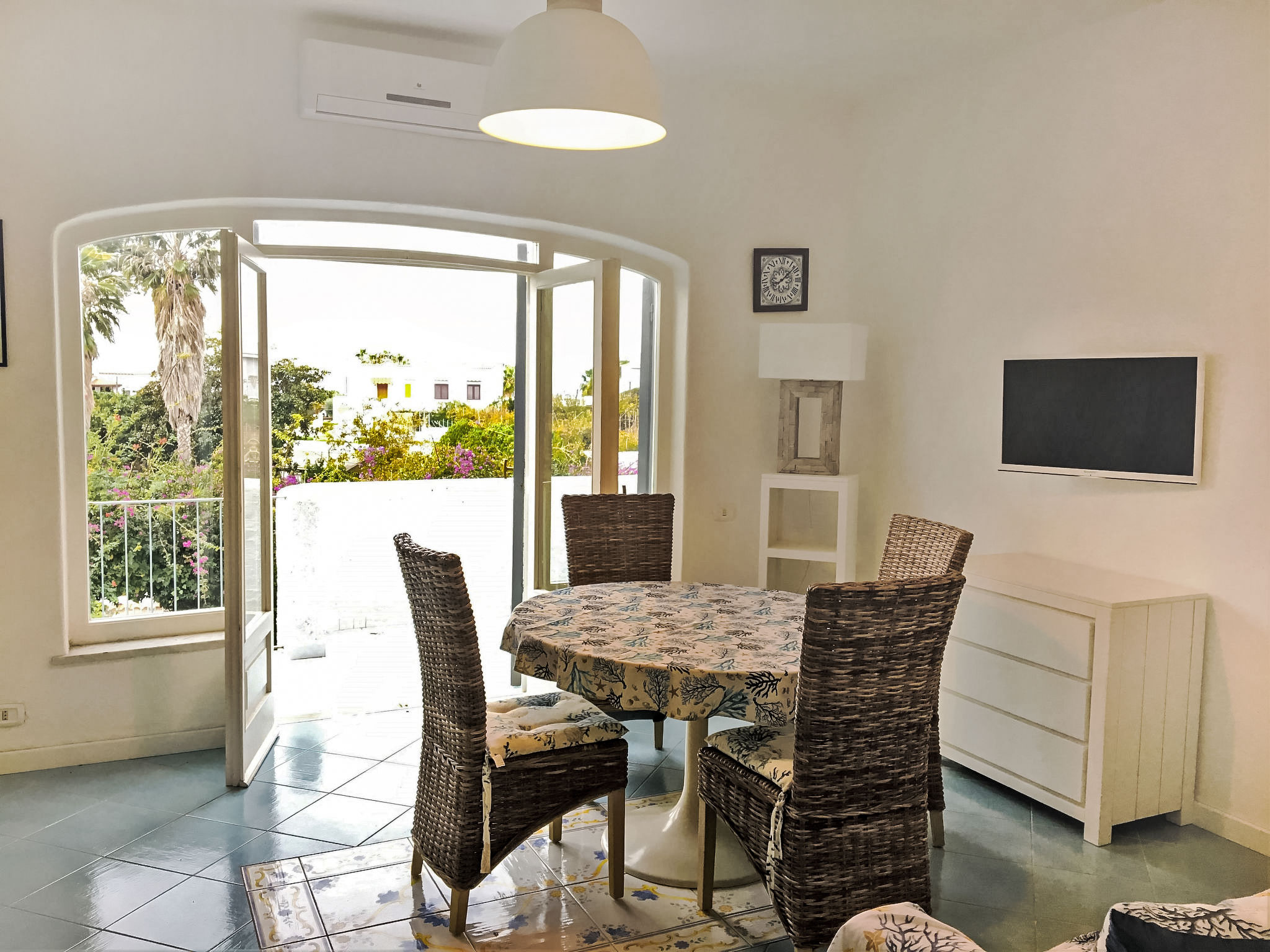 "Pithecusa", 3-Zimmer-Wohnung 80 m2 im 1. Stock. Hell, zweckmässig und komfortabel eingerichtet: offenes Wohn-/Esszimmer mit 1 Bett, Esstisch und Kabel-TV (Flachbildschirm), Klimaanlage und Warmluftheizung. Ausgang zum Balkon. 1 Doppelzimmer mit Panoramafenster. 1 Zimmer mit 1 x 2 Etagenbetten. Kleine Küche (4 Kochplatten, Backofen, Tiefkühler). 2 Duschen/Bidet/WC. Kleiner Balkon 5 m2. Balkonmöbel. Sehr schöne Sicht auf das Meer und die Ortschaft. Zur Verfügung: Waschmaschine, Haartrockner. Internet (Wireless LAN, gratis). Geeignet für Familien.
