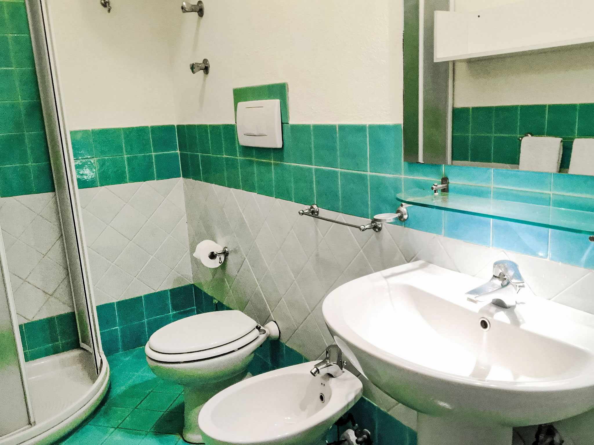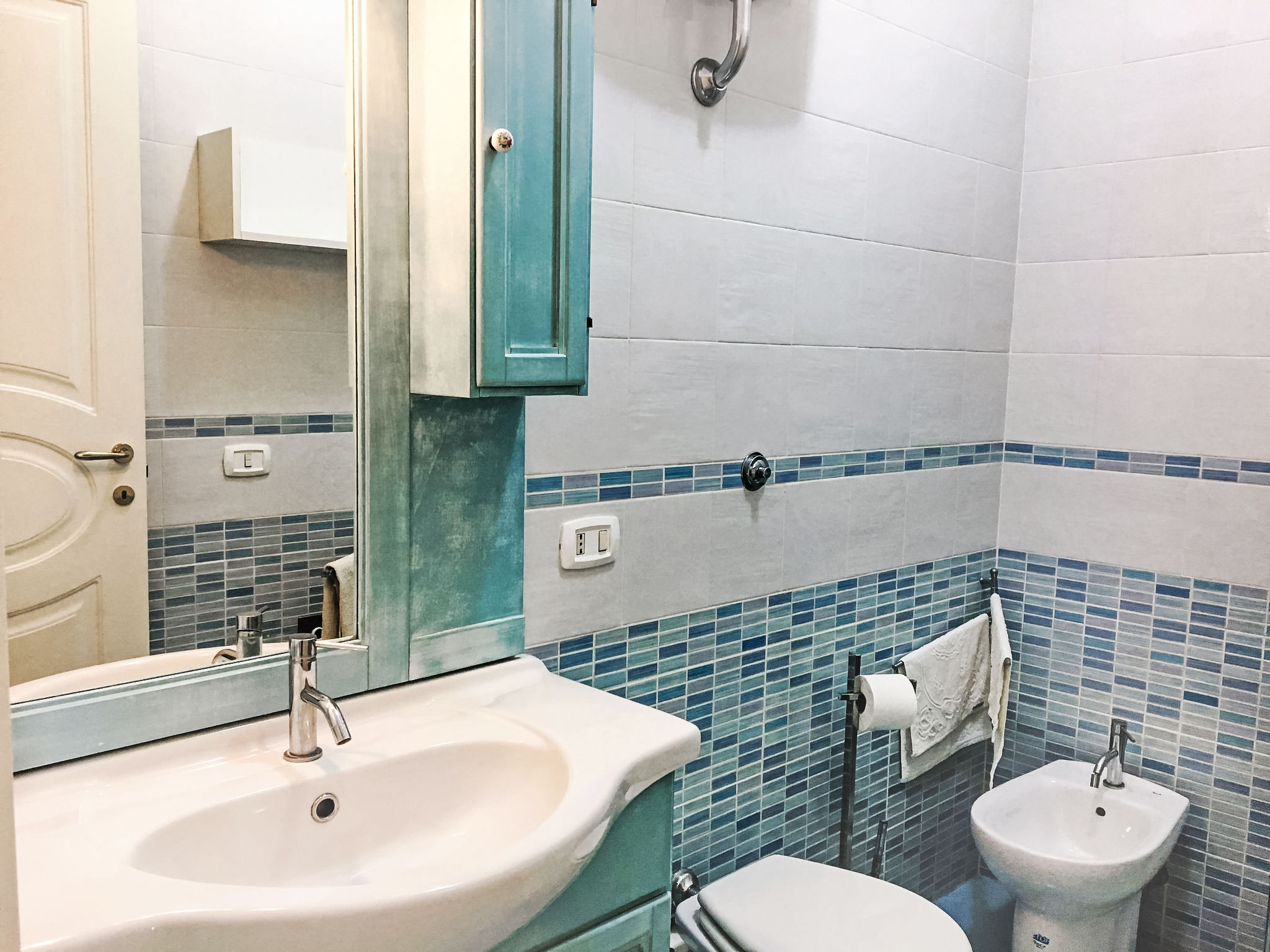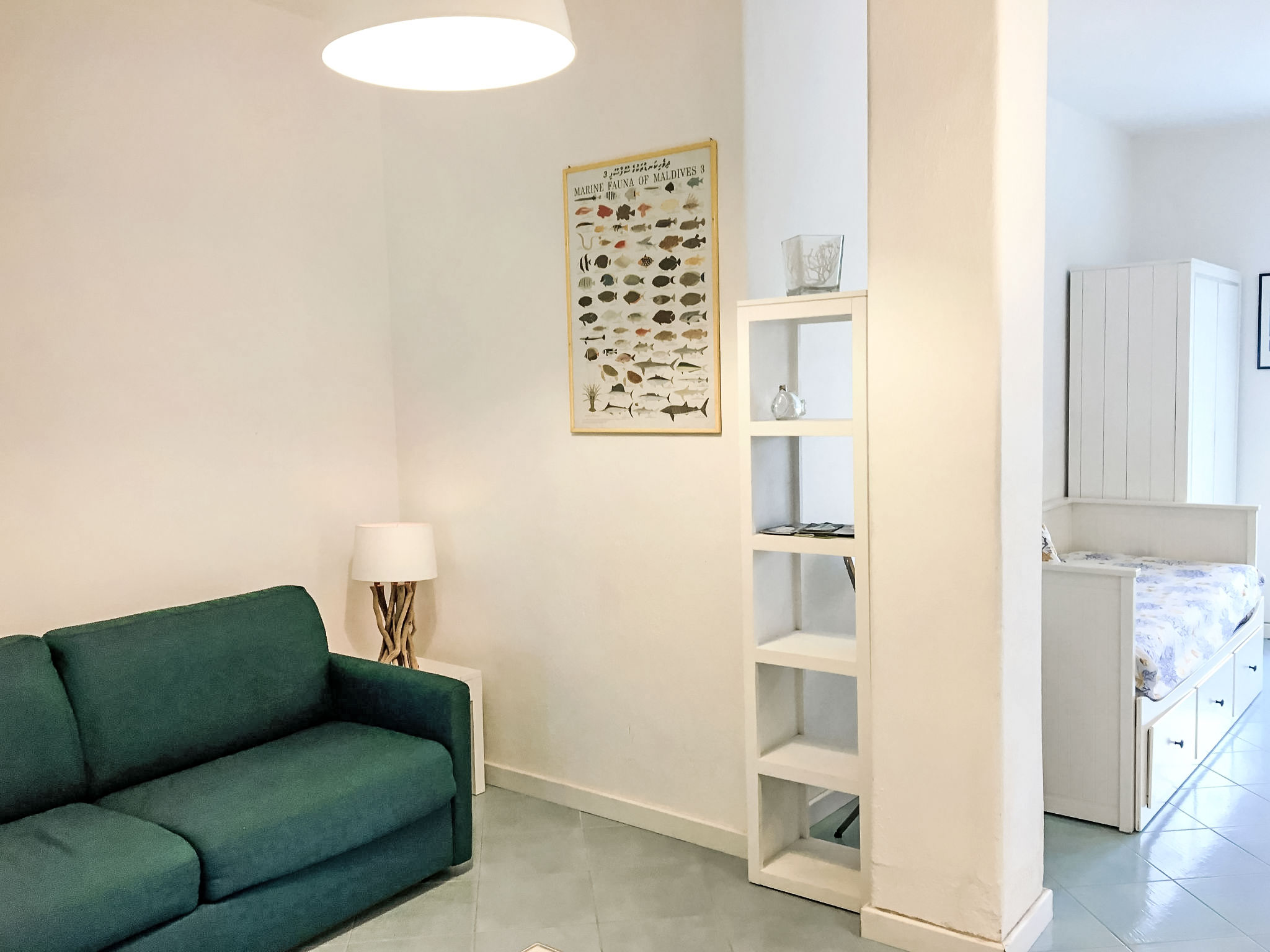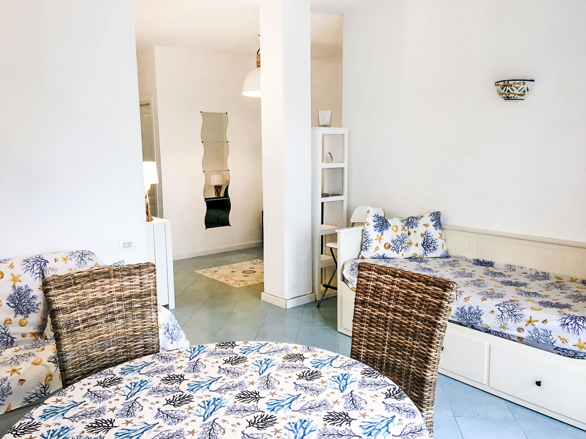 "Pithecusa", 3-Zimmer-Wohnung 80 m2 im 1. Stock. Hell, zweckmässig und komfortabel eingerichtet: offenes Wohn-/Esszimmer mit 1 Bett, Esstisch und Kabel-TV (Flachbildschirm), Klimaanlage und Warmluftheizung. Ausgang zum Balkon. 1 Doppelzimmer mit Panoramafenster. 1 Zimmer mit 1 x 2 Etagenbetten. Kleine Küche (4 Kochplatten, Backofen, Tiefkühler). 2 Duschen/Bidet/WC. Kleiner Balkon 5 m2. Balkonmöbel. Sehr schöne Sicht auf das Meer und die Ortschaft. Zur Verfügung: Waschmaschine, Haartrockner. Internet (Wireless LAN, gratis). Geeignet für Familien.