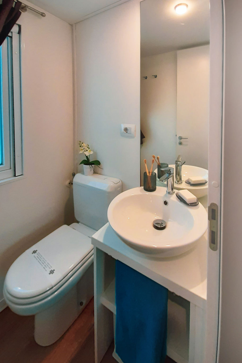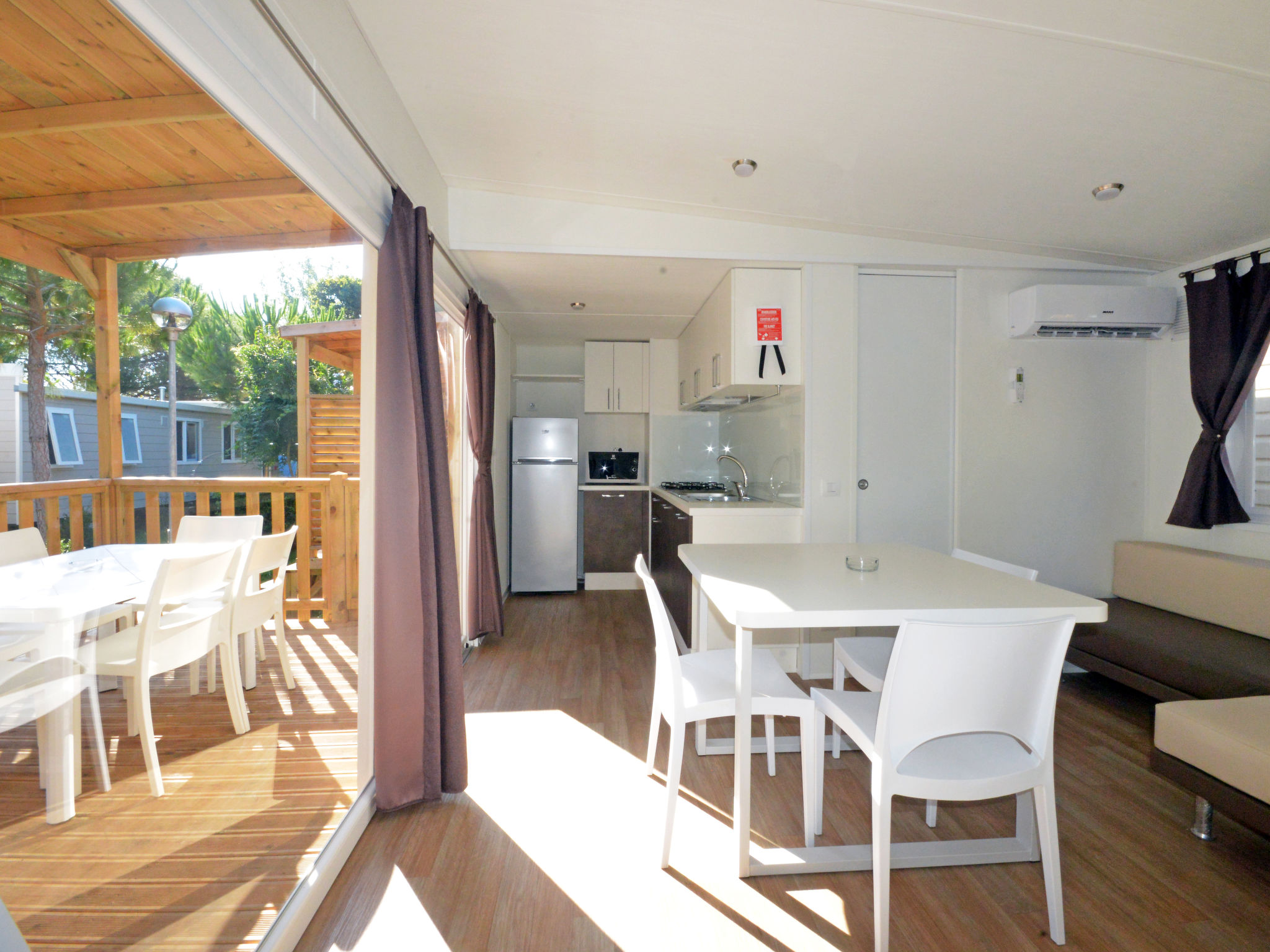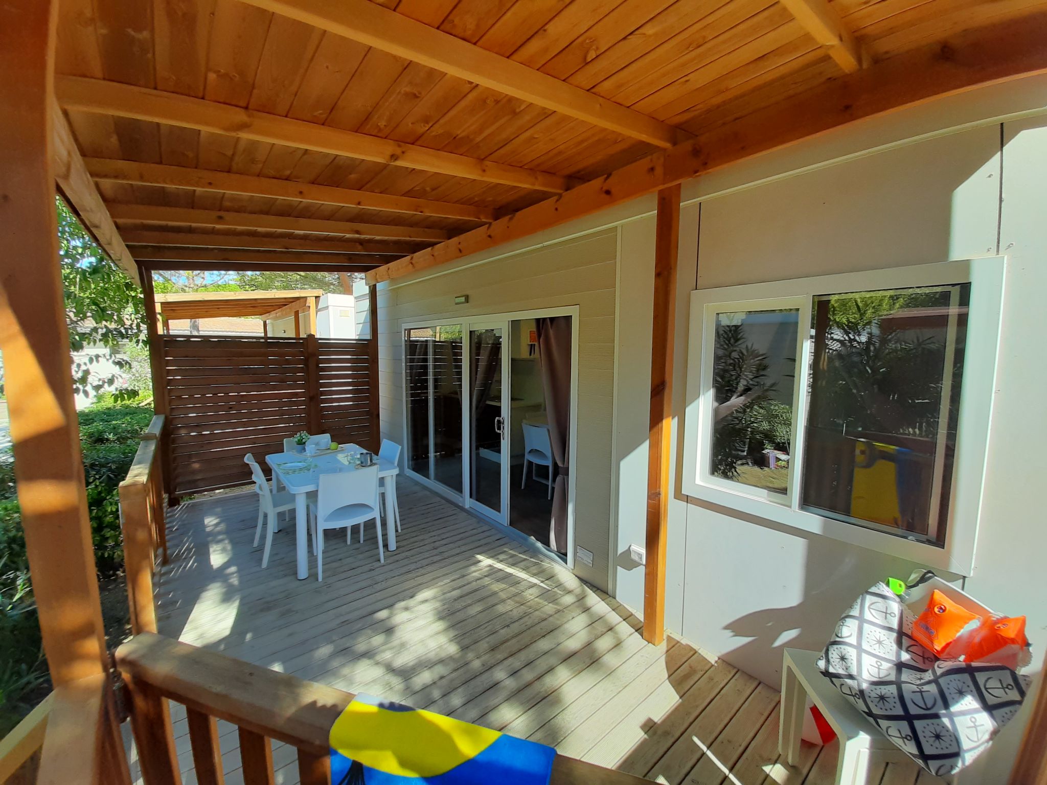 "Maestrale", 3-Zimmer-Mobilheim 32 m2. Zweckmässig eingerichtet: Wohn-/Schlafzimmer mit 1 Diwanbett (70 cm, Länge 185 cm), Esstisch. Ausgang zur Veranda. 1 Zimmer mit 1 franz. Bett (160 cm), sep. WC. 1 Zimmer mit 2 Betten (70 cm, Länge 185 cm), 1 x 1 Etagenbetten. Kleine, offene Küche (4 Flammen, Mikrowelle, Tiefkühler). Dusche/WC. Heizung, Klimaanlage. Kleine Terrasse überdacht. Terrassenmöbel. Zur Verfügung: Kinderhochstuhl. Beim Mietobjekt handelt es sich um ein Typenhaus bzw. Um eine Typenwohnung.