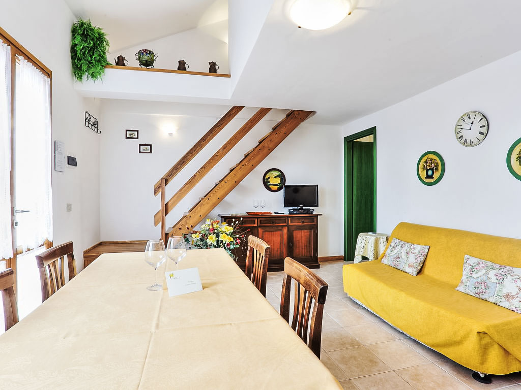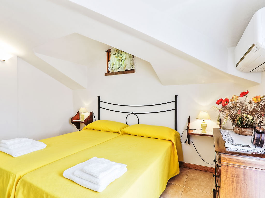 "Narciso", 3-Zimmer-Wohnung 55 m2 im 1. Stock. Wohn-/Esszimmer mit 1 Doppeldiwanbett (160 cm, Länge 190 cm), Sat-TV und Flachbildschirm. Ausgang zur Terrasse. 1 Doppelzimmer. Kochnische (4 Kochplatten, Geschirrspüler, Mikrowelle, elektrische Kaffeemaschine). Dusche/Bidet/WC. Obergeschoss: 1 abgeschrägtes Zimmer mit 2 Betten. Ausgang zum Balkon. Klimaanlage (extra). Terrasse 8 m2. Terrassenmöbel. Panoramasicht auf das Schwimmbad und die Landschaft. Zur Verfügung: Fliegengitter. Maximal 1 Haustier/Hund erlaubt.