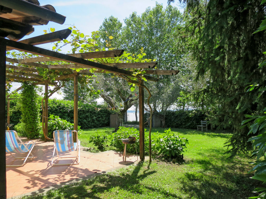"Fontanella", 3-Zimmer-Doppelhaushälfte 55 m2. Rustikal eingerichtet: Wohn-/Esszimmer mit 1 Doppeldiwanbett, offenem Kamin, Küchenblock, Sat-TV und Holzofen. Ausgang zum Garten. 2 Zimmer, jedes Zimmer mit 1 Doppelbett. Ausgang zum Garten. Kochnische (Backofen, 4 Flammen, Tiefkühler, elektrische Kaffeemaschine). Dusche/WC. Terrasse, Garten, Rasen 500 m2. Terrassenmöbel, Gartengrill, Liegestühle (1). Sicht auf den See. Zur Verfügung: Babybett. Bitte beachten: Nichtraucher-Haus. Maximal 2 Haustiere/Hunde erlaubt.