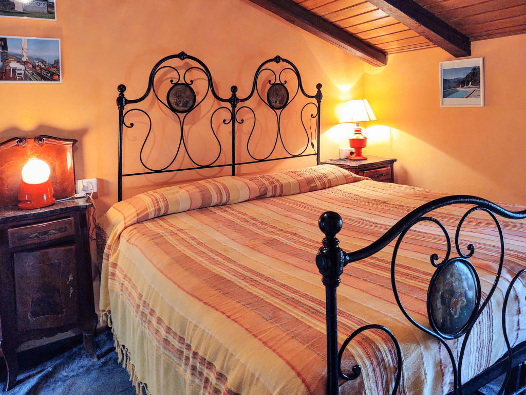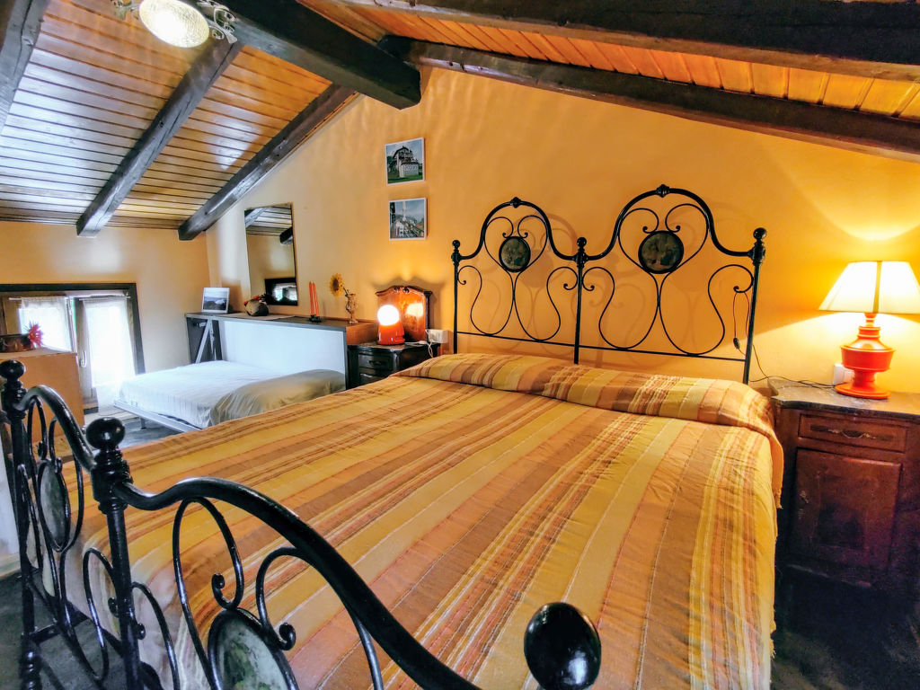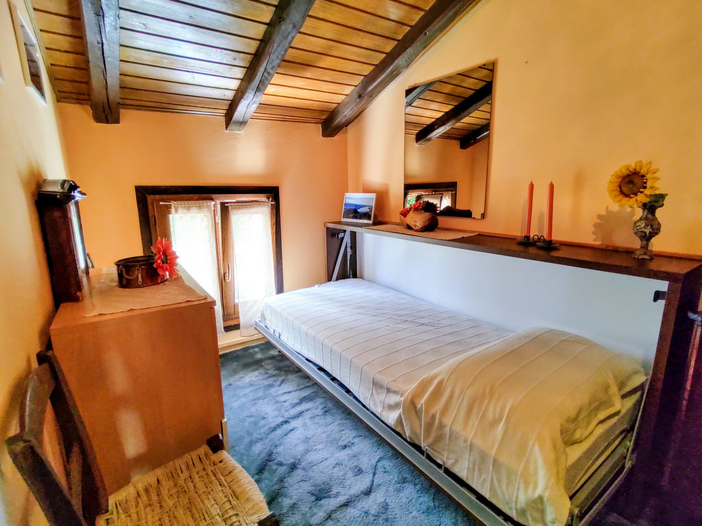 2-Zimmer-Hausteil 'Giulia', 2 Etagen, ca. 30 m². Zugang über kurze Außentreppe in Hochparterre: Wohnküche (4 Flammen, Backofen, Kühlschrank, Kaffeemaschine, Toaster) mit Kamin und Essplatz. Kleine Dusche/WC. Von der Wohnküche schmale Wendeltreppe ins Dachgeschoss (offener Holzdachstuhl): Schlafzimmer mit franz Bett (1,80 m breit) und Teppichboden. CIR: 013178-CNI-00009